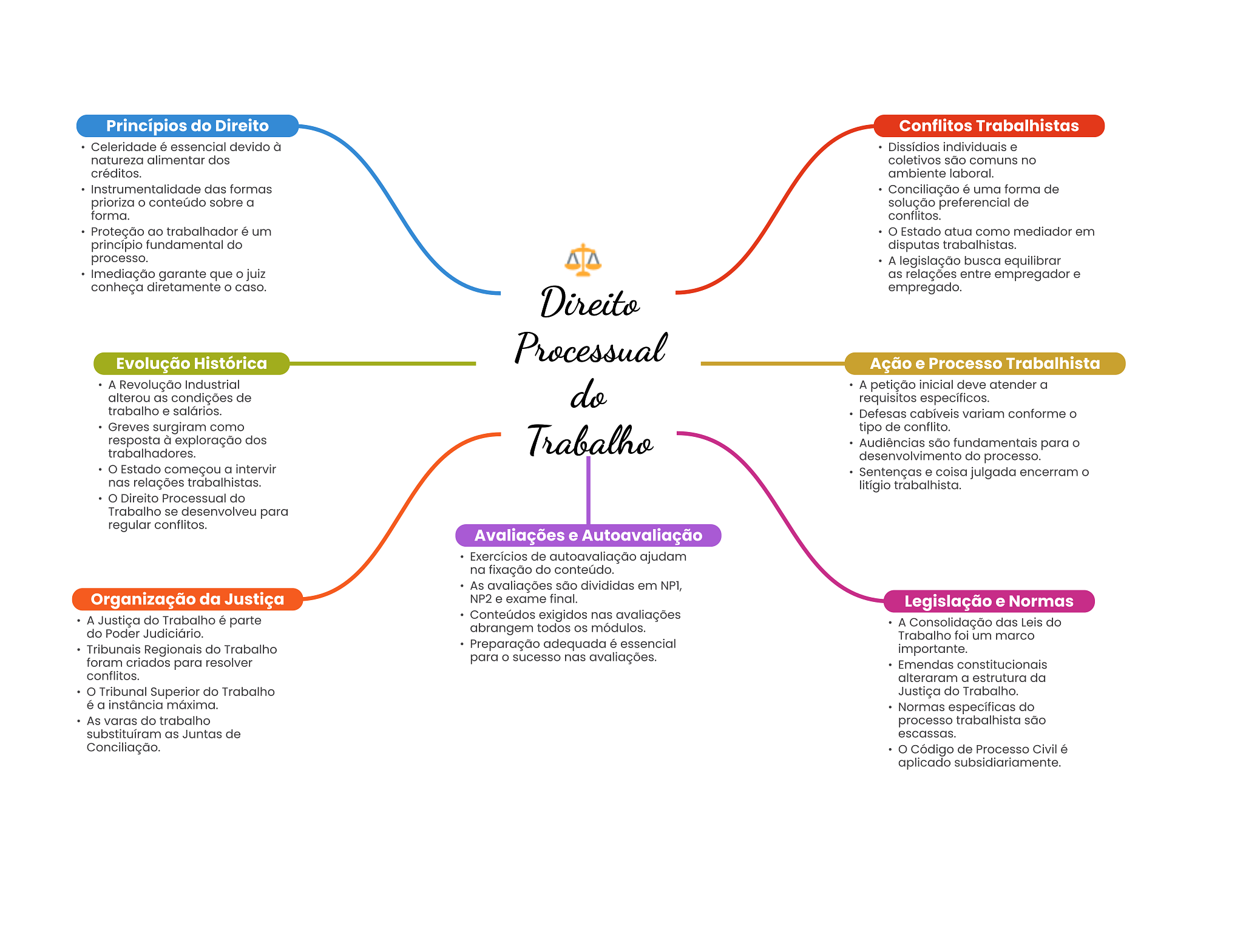 Princípios do Direito Conflitos Trabalhistas Celeridade é essencial devido à Dissídios individuais e natureza alimentar dos coletivos são comuns no créditos. ambiente laboral. Instrumentalidade das formas Conciliação é uma forma de prioriza conteúdo sobre a solução preferencial de forma. conflitos. Proteção ao trabalhador é um Estado atua como mediador em princípio fundamental do disputas trabalhistas. processo. A legislação busca equilibrar Imediação garante que juiz as relações entre empregador e conheça diretamente caso. empregado. Direito Processual Evolução Histórica Ação e Processo Trabalhista A Revolução Industrial do A petição inicial deve atender a alterou as condições de requisitos específicos. trabalho e salários. Defesas cabíveis variam conforme O Greves surgiram como resposta à exploração dos Trabalho tipo de conflito. Audiências são fundamentais para trabalhadores. desenvolvimento do processo. Estado começou a intervir Sentenças e coisa julgada encerram nas relações trabalhistas. litígio trabalhista. Direito Processual do Trabalho se desenvolveu para regular conflitos. Avaliações e Autoavaliação Exercícios de autoavaliação ajudam na fixação do conteúdo. As avaliações são divididas em NP1, Organização da Justiça NP2 e exame final. Legislação e Normas A Justiça do Trabalho é parte Conteúdos exigidos nas avaliações do Poder Judiciário. abrangem todos OS módulos. A Consolidação das Leis do Trabalho foi um marco Tribunais Regionais do Trabalho Preparação adequada é essencial importante. foram criados para resolver para sucesso nas avaliações. Emendas constitucionais conflitos. alteraram a estrutura da Tribunal Superior do Trabalho Justiça do Trabalho. é a instância máxima. Normas específicas do As varas do trabalho processo trabalhista são substituíram as Juntas de escassas. Conciliação. Código de Processo Civil é aplicado subsidiariamente.