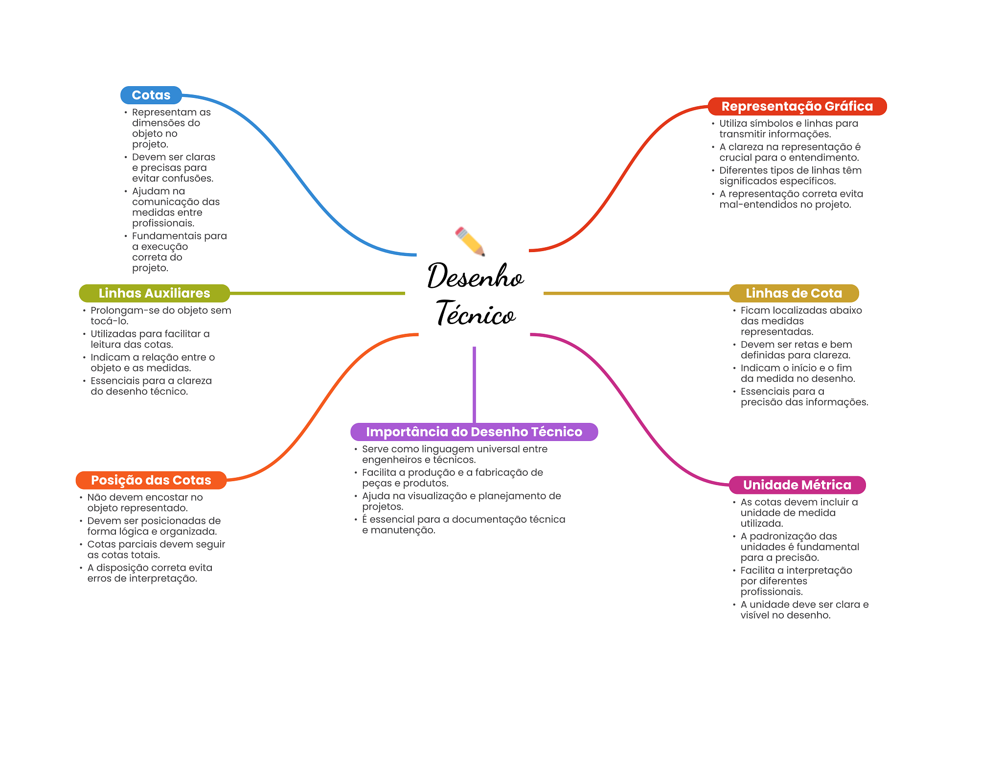 Cotas Representam as Representação Gráfica dimensões do Utiliza símbolos e linhas para objeto no transmitir informações. projeto. A clareza na representação é Devem ser claras crucial para entendimento. e precisas para Diferentes tipos de linhas têm evitar confusões. significados específicos. Ajudam na A representação correta evita comunicação das mal-entendidos no projeto. medidas entre profissionais. Fundamentais para a execução correta do projeto. Desenho Linhas Auxiliares Linhas de Cota Prolongam-se do objeto sem Técnico Ficam localizadas abaixo tocá-lo. das medidas Utilizadas para facilitar a representadas. leitura das cotas. Devem ser retas e bem Indicam a relação entre definidas para clareza. objeto e as medidas. Indicam início e O fim Essenciais para a clareza da medida no desenho. do desenho técnico. Essenciais para a precisão das informações. Importância do Desenho Técnico Serve como linguagem universal entre engenheiros e técnicos. Facilita a produção e a fabricação de Posição das Cotas peças e produtos. Unidade Métrica Não devem encostar no Ajuda na visualização e planejamento de As cotas devem incluir a objeto representado. projetos. unidade de medida Devem ser posicionadas de É essencial para a documentação técnica utilizada. forma lógica e organizada. e manutenção. A padronização das Cotas parciais devem seguir unidades é fundamental as cotas totais. para a precisão. A disposição correta evita Facilita a interpretação erros de interpretação. por diferentes profissionais. A unidade deve ser clara e visível no desenho.