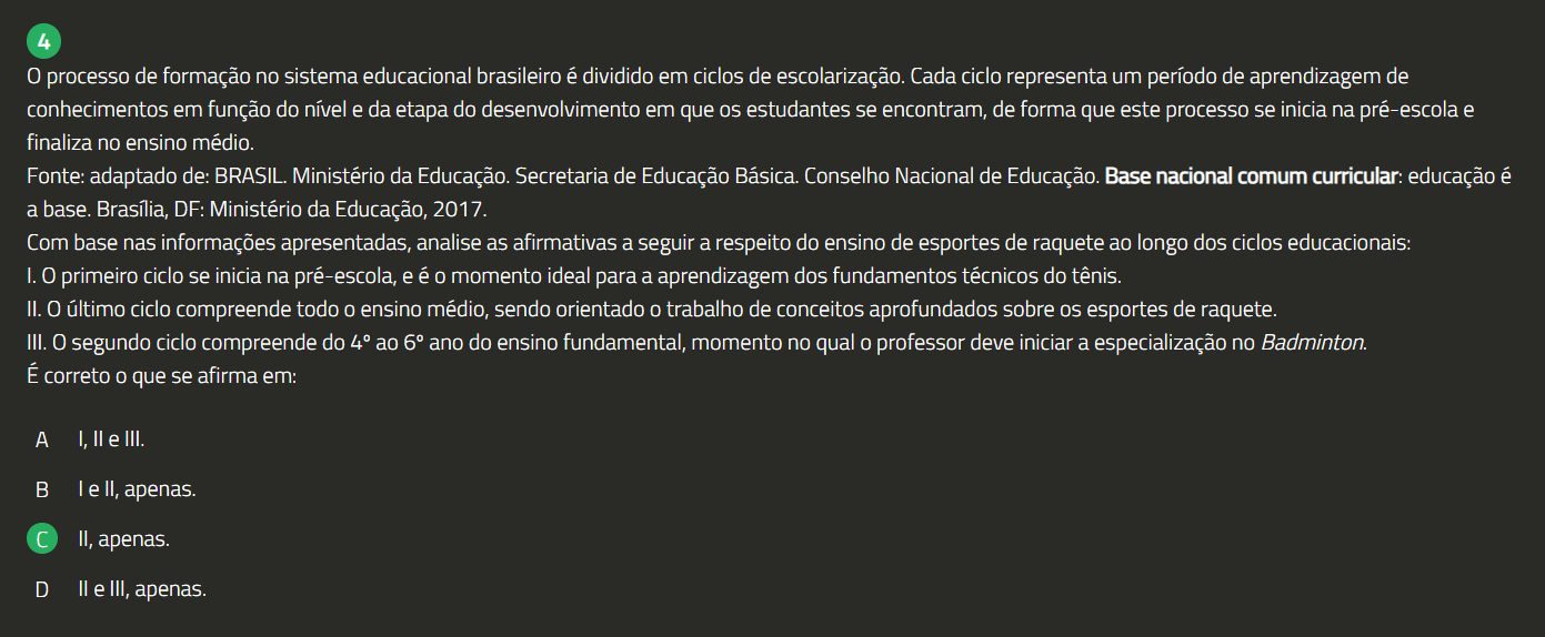 4 0 processo de formação no sistema educacional brasileiro é dividido em ciclos de escolarização. Cada ciclo representa um período de aprendizagem de conhecimentos em função do nível e da etapa do desenvolvimento em que OS estudantes se encontram, de forma que este processo se inicia na pré-escola e finaliza no ensino médio. Fonte: adaptado de: BRASIL. Ministério da Educação. Secretaria de Educação Básica. Conselho Nacional de Educação. Base nacional comum curricular: educação é a base. Brasília, DF: Ministério da Educação, 2017. Com base nas informações apresentadas, analise as afirmativas a seguir a respeito do ensino de esportes de raquete ao longo dos ciclos educacionais: 1.0 primeiro ciclo se inicia na pré-escola, e é 0 momento ideal para a aprendizagem dos fundamentos técnicos do tênis. II. 0 último ciclo compreende todo ensino médio, sendo orientado 0 trabalho de conceitos aprofundados sobre esportes de raquete. III. 0 segundo ciclo compreende do 4° ao 6° ano do ensino fundamental, momento no qual 0 professor deve iniciar a especialização no Badminton. É correto que se afirma em: A I, e III. B I e II, apenas. II, apenas. D e III, apenas.