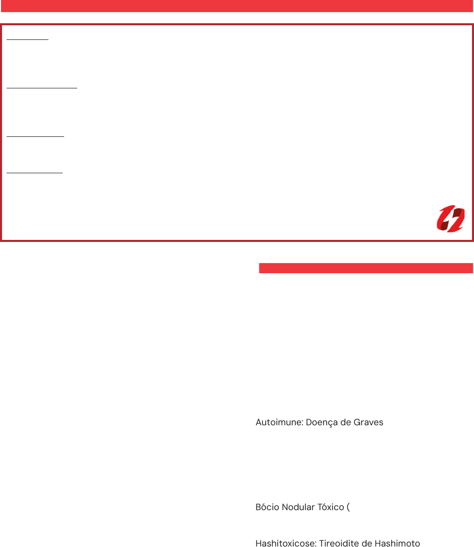 1. DOENÇA AUTOIMUNE DA TIREOIDE HIPERTIREOIDISMO Etiologia • Principal = Primária → Doença de Graves (autoimune) • Outras = Primária → Hashitoxicose/Tireoidites Subagudas/Bócio Nodular Tóxico • Secundária → Adenoma hipofisário produtor de TSH Quadro Clínico • Taquicardia, palpitações, tremores, insônia, irritabilidade, hiperdefecação, sudorese excessiva, PA divergente, IC de alto débito, arritmias cardíacas, osteoporose e irregularidade menstrual • Doença de Graves → Oftalmopatia e Dermatopatia Diagnóstico • Primário → TSH baixo e T4L elevado • Secundário → TSH e T4L altos Tratamento • Tionamidas (Metimazol ou Propiltiuracil) • Beta-bloqueadores (Propranolol/Metoprolol) • Crise Tireotóxica → Corticoide EV e Lugol • Tratamento Definitivo → Doença de Graves e Bócio Nodular Tóxico = Iodoterapia • Tireoidectomia → refratariedade e contraindicações a iodoterapia e câncer de tireoide 1.1 Conceitos iniciais (são duas coisas diferentes) • Tireotoxicose: Síndrome clínica decorrente do excesso de hormônios tireoidianos independentemente de suas origens; Exógena, produção tumoral, produção excessiva pela própria glândula, liberação de hormônio pré- formado após dano celular; • Hipertireoidismo: Estado de tireotoxicose em que a origem do excesso de hormônio tireoidiano é a própria glândula tireoide. 1.2 Quadro clínico (sinais de aceleração do metabolismo) • Perda de peso; • Redução dos níveis de colesterol; • Osteoporose; • Aumento da frequência cardíaca e palpitações; • Taquiarritmias, fibrilação atrial (FA); • Aumento de PAS e redução da PAD – Pressão divergente; • Insuficiência cardíaca congestiva (ICC) de alto débito; • Aumento de eventos tromboembólicos; • Sudorese, intolerância ao calor; • Tremores de extremidades; • Fraqueza muscular proximal, hiperreflexia; • Dermopatia infiltrativa; • Ansiedade, agitação, irritabilidade, labilidade emocional; • Hiperdefecação; • Hipermenorragia ou irregularidade menstrual. • Em idosos, quadro é atípico, não têm sinais de hiperativação adrenérgica. Observa-se astenia, fraqueza, prostração, depressão grave, FA e/ ou ICC refratárias ao tratamento usual: Quadro contrário! Paciente idoso, previamente hígido, que começa apresentar FA = investigar hipertireoidismo! 1.3 Etiologias Primária – glândula produzindo hormônio em excesso! • Autoimune: Doença de Graves (80% de todas as causas de hipertireoidismo) – anticorpo TRAB (Anticorpo anti-receptor de TSH); Esse anticorpo atua na glândula (onde o TSH atuaria) e acelera as funções do TSH de síntese e secreção de hormônios (inclusive, aumenta a conversão de T4 em T3); • Bócio Nodular Tóxico (nódulos que produzem hormônios): Uninodular (um único nódulo) e multinodular (2 ou mais nódulos produtores); • Hashitoxicose: Tireoidite de Hashimoto (inflamação e consequente destruição de folículos e coloides, então ocorre a liberação na corrente sanguínea de hormônios pré-formados), vale a pena reforçar que isso irá ocorrer apenas na fase inicial da doença; • Tireoidite subaguda: Inflamação e consequente destruição de folículos e coloides de uma região da tireoide, com liberação na corrente sanguínea de hormônios pré-formados → hipertireoidismo costuma ser transitório evoluindo para eutireoidismo e depois para hipotireoidismo OU manutenção do eutireoidismo; Medicina livre, venda proibida, twitter @livremedicina, bluesky @medicinalivre2 ENDÓCRINOLOGIA2 • Secundária/Terciária (Central) – hipófise ou hipotálamo estimulando a produção de hormônio: Tireotropinomas: Tumores hipofisários produtores de TSH; • Produção ectópica: Struma ovarii, Tumor ovariano que sintetiza T4; • Factícia: Paciente induz por ingestão exógena de hormônios (toma medicação para emagrecer, por exemplo). 2. DOENÇAS DE GRAVES • Principal causa de hipertireoidismo (80% dos casos) • Doença autoimune. • TRAb - Anticorpo anti-receptor de TSH. 2.1 Suspeição clínica • Suspeita vem sempre que há presença de hipertireoidismo + bócio (em idosos, o bócio pode ser discreto), podendo haver frêmito e sopro na topografia da tireoide; A glândula aumenta de tamanho devido ao aumento na produção hormonal. 2.2 Oftalmopatia de Graves • Há substâncias presentes na região posterior aos olhos que também são estimuladas pelo TRAb, ocorrendo a exoftalmia. • Visão geral: Pode preceder hipertireoidismo (20%), sucedê-lo (40%) ou surgir concomitantemente a ele (40%); Oftalmopatia transitória ou permanente sem hipertireoidismo; Presente em 50% casos de doença de graves. • Sinais e sintomas: Hiperatividade adrenérgica: Retração palpebral; Olhar fixo; Sinal de Lid Lag (dificuldade em fechar o olho ao olhar para baixo). Fonte: Pina, Susana [et al] . Orbitopatia Tiroideia: Diferentes Formas de Apresentação, Diferentes Abordagens Terapêuticas. Oftalmologia - Vol. 37: pp.51-58. 2013. • Típicos: Edema periorbital; Exoftalmia. Fonte: Vilar, Lucio [et al] . Endocrinologia Clínica. 6ª edição. Rio de Janeiro: Guanabara Koogan, 2016 • Lesão de musculatura extrínseca – devido à inflamação retro-ocular importante; Diplopia; Oftalmoplegia; Ptose palpebral; • Casos graves: Disfunção do nervo óptico; Defeitos nos campos visuais. 2.3 Estratificação da oftalmopatia de Graves (atividade de doença): Escore CAS Sinais e sintomas Escores Dor 1 Dor retrobulbar espontânea 2 Dor à movimentação dos olhos Hiperemia 3 Hiperemia palpebral 4 Injeção conjuntival Edema 5 Edema palpebral 6 Quemose 7 Edema de carúncula • Se CAS > ou igual a 3 critérios (atividade da doença), é contraindicação a realizar radioterapia. 2.4 Tratamento para a oftalmopatia de Graves são: • Corticoterapia; • Radioterapia ocular; • Imunoterapia; • Cirurgia. 2.5 Dermatopatia de Graves • O TRAb reage com os fibrob