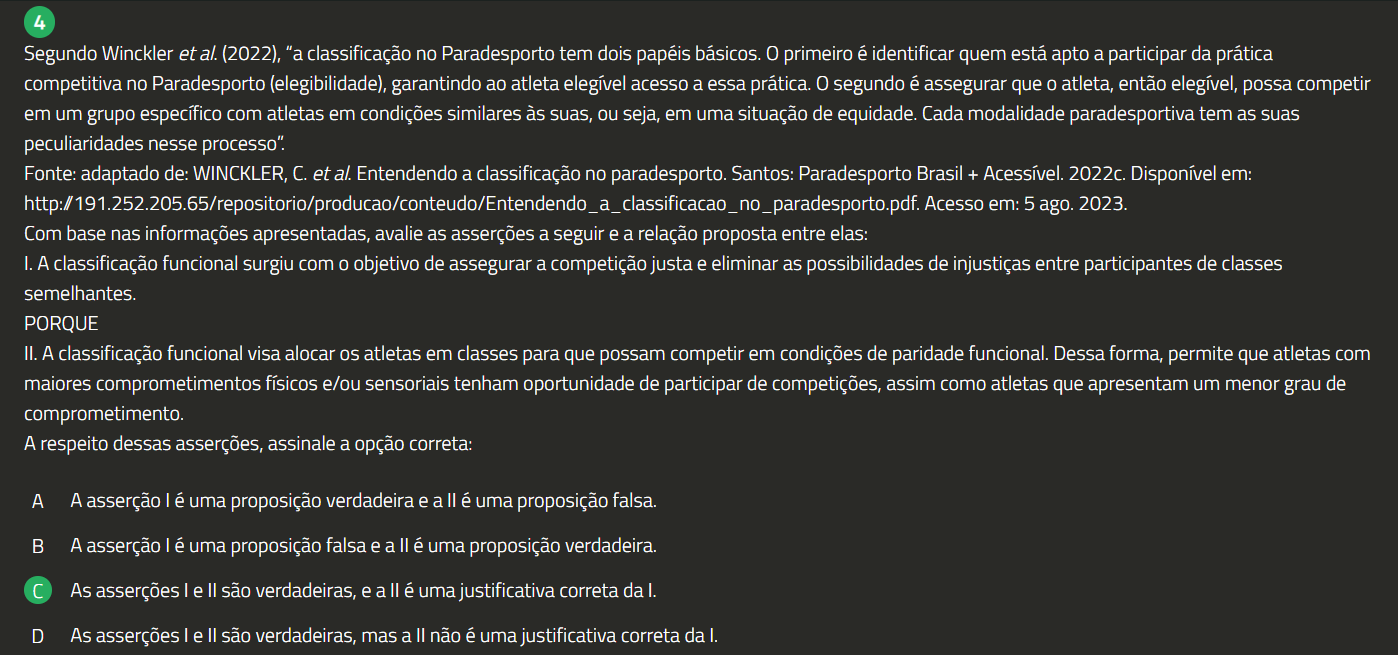 4 Segundo Winckler et al. (2022), "a classificação no Paradesporto tem dois papéis básicos. 0 primeiro é identificar quem está apto a participar da prática competitiva no Paradesporto (elegibilidade), garantindo ao atleta elegível acesso a essa prática. 0 segundo é assegurar que 0 atleta, então elegível, possa competir em um grupo específico com atletas em condições similares às suas, ou seja, em uma situação de equidade. Cada modalidade paradesportiva tem as suas peculiaridades nesse processo". Fonte: adaptado de: WINCKLER, C. et al. Entendendo a classificação no paradesporto. Santos: Paradesporto Brasil + Acessível. Disponível em: http:/191.252.205.65/repositorio/producao/conteudo/Entendendo_a_classificacao_no_paradesporto.pdf.Acesso em: 5 ago. 2023. Com base nas informações apresentadas, avalie as asserções a seguir e a relação proposta entre elas: A classificação funcional surgiu com 0 objetivo de assegurar a competição justa e eliminar as possibilidades de injustiças entre participantes de classes semelhantes. PORQUE II. A classificação funcional visa alocar atletas em classes para que possam competir em condições de paridade funcional. Dessa forma, permite que atletas com maiores comprometimentos físicos e/ou sensoriais tenham oportunidade de participar de competições, assim como atletas que apresentam um menor grau de comprometimento. A respeito dessas asserções, assinale a opção correta: A A asserção é uma proposição verdadeira e a II é uma proposição falsa. A asserção lé uma proposição falsa e a é uma proposição verdadeira. As asserções I e são verdadeiras, e a II é uma justificativa correta da I. D As asserções I e são verdadeiras, mas a II não é uma justificativa correta da