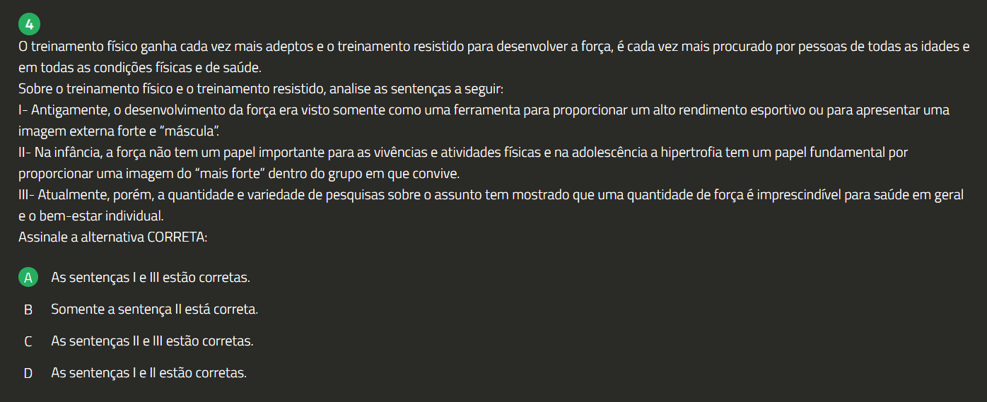 4 0 treinamento físico ganha cada vez mais adeptos e 0 treinamento resistido para desenvolver a força, é cada vez mais procurado por pessoas de todas as idades e em todas as condições físicas e de saúde. Sobre 0 treinamento físico e 0 treinamento resistido, analise as sentenças a seguir: Antigamente, 0 desenvolvimento da força era visto somente como uma ferramenta para proporcionar um alto rendimento esportivo ou para apresentar uma imagem externa forte e "máscula". II- Na infância, a força não tem um papel importante para as vivências e atividades físicas e na adolescência a hipertrofia tem um papel fundamental por proporcionar uma imagem do "mais forte" dentro do grupo em que convive. III- Atualmente, porém, a quantidade e variedade de pesquisas sobre 0 assunto tem mostrado que uma quantidade de força é imprescindível para saúde em geral e bem-estar individual. Assinale a alternativa CORRETA: A As sentenças e III estão corretas. B Somente a sentença está correta. As sentenças e III estão corretas. D As sentenças e estão corretas.