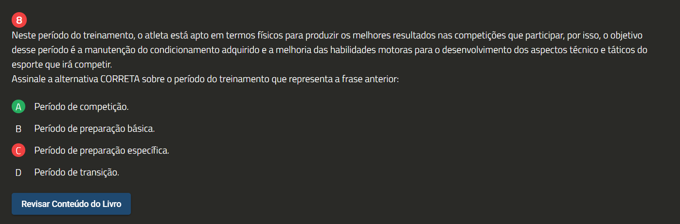 8 Neste período do treinamento, 0 atleta está apto em termos físicos para produzir OS melhores resultados nas competições que participar, por isso, 0 objetivo desse período é a manutenção do condicionamento adquirido e a melhoria das habilidades motoras para 0 desenvolvimento dos aspectos técnico e táticos do esporte que irá competir. Assinale a alternativa CORRETA sobre 0 período do treinamento que representa a frase anterior: A Período de competição. Período de preparação básica. Período de preparação específica. D Período de transição. Revisar Conteúdo do Livro