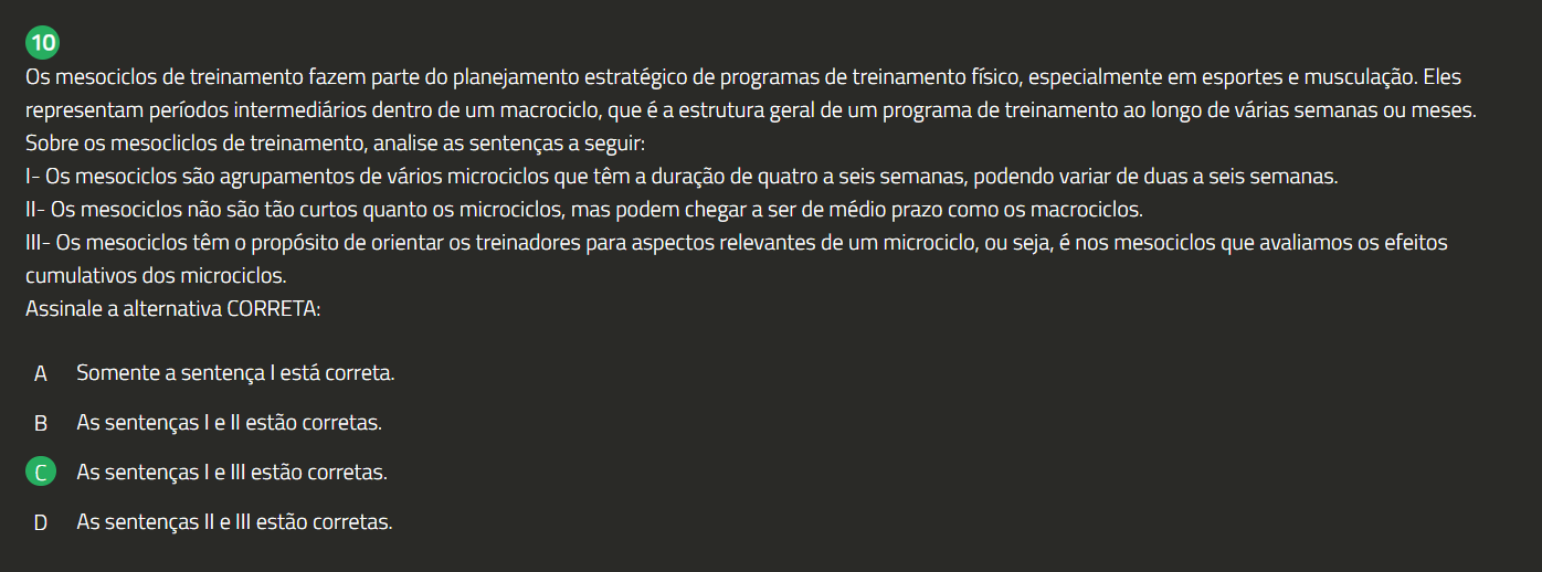 10 Os mesociclos de treinamento fazem parte do planejamento estratégico de programas de treinamento físico, especialmente em esportes e musculação. Eles representam períodos intermediários dentro de um macrociclo, que é a estrutura geral de um programa de treinamento ao longo de várias semanas ou meses. Sobre mesocliclos de treinamento, analise as sentenças a seguir: Os mesociclos são agrupamentos de vários microciclos que têm a duração de quatro a seis semanas, podendo variar de duas a seis semanas. II- Os mesociclos não são tão curtos quanto microciclos, mas podem chegar a ser de médio prazo como macrociclos. III- Os mesociclos têm 0 propósito de orientar treinadores para aspectos relevantes de um microciclo, ou seja, é nos mesociclos que avaliamos efeitos cumulativos dos microciclos. Assinale a alternativa CORRETA: A Somente a sentença está correta. B As sentenças e estão corretas. As sentenças e III estão corretas. D As sentenças e III estão corretas.