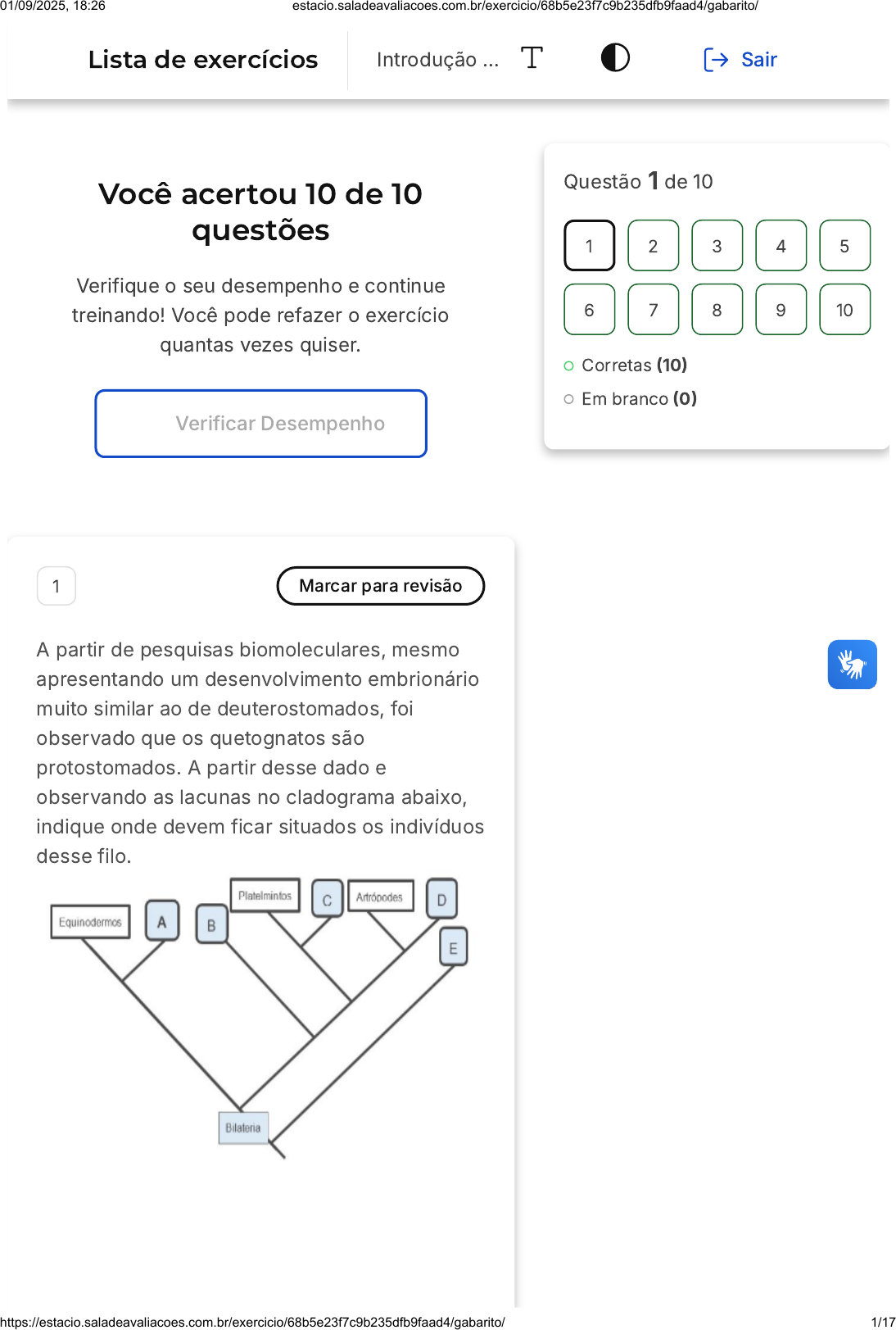 Você acertou 10 de 10 questões Verifique o seu desempenho e continue treinando! Você pode refazer o exercício quantas vezes quiser. Verificar Desempenho 1 Marcar para revisão A partir de pesquisas biomoleculares, mesmo apresentando um desenvolvimento embrionário muito similar ao de deuterostomados, foi observado que os quetognatos são protostomados. A partir desse dado e observando as lacunas no cladograma abaixo, indique onde devem ficar situados os indivíduos desse filo. Questão 1 de 10 Corretas (10) Em branco (0) 1 2 3 4 5 6 7 8 9 10 Lista de exercícios Introdução … Sair 01/09/2025, 18:26 estacio.saladeavaliacoes.com.br/exercicio/68b5e23f7c9b235dfb9faad4/gabarito/ https://estacio.saladeavaliacoes.com.br/exercicio/68b5e23f7c9b235dfb9faad4/gabarito/ 1/17 A B C D E Lacuna A Lacuna B Lacuna C Lacuna D Lacuna E Resposta correta Parabéns, você selecionou a alternativa correta. Confira o gabarito comentado! Gabarito Comentado Observa-se que a lacuna E não é um indivíduo bilatério e, por isso, não pode ter quetognatos. O indivíduo D, por dividir um mesmo ancestral com o artrópode, é um Ecdysozoa. Já o indivíduo C é um Spiralia, mas tem um ancestral em comum com Platelmintos. O indivíduo B é um protostomado, mais distante dos outros grupos de Protostomia; por isso, ele poderia abrigar o filo Chaetognatha. 2 Marcar para revisão A hidatidose cística é uma verminose provocada pelo Echinococcus granulosus, verme chamado popularmente de "tênia-anã", 01/09/2025, 18:26 estacio.saladeavaliacoes.com.br/exercicio/68b5e23f7c9b235dfb9faad4/gabarito/ https://estacio.saladeavaliacoes.com.br/exercicio/68b5e23f7c9b235dfb9faad4/gabarito/ 2/17 A B C D E enquanto a teníase tem como um dos organismos causadores a Taenia solium ou "tênia". Em relação às tênias, é correto afirmar que: A Taenia solium desenvolve os cisticercos nos músculos do boi, que é seu hospedeiro intermediário. A Taenia solium é um verme com sistema digestório completo. A Taenia solium apresenta uma larva inofensiva para o indivíduo humano. A Taenia solium e o Echinococcus granulosus pertencem ao grupo dos platelmintos, que engloba também espécies de vida livre. A Taenia solium adulta realiza a reprodução assexuada por bipartição. Resposta correta Parabéns, você selecionou a alternativa correta. Confira o gabarito comentado! Gabarito Comentado A alternativa correta é a D, que afirma que a Taenia solium e o Echinococcus granulosus pertencem ao grupo dos platelmintos, que também inclui espécies de vida livre. Isso é verdadeiro, pois ambos os vermes fazem parte do filo dos platelmintos. As outras alternativas contêm informações incorretas. A Taenia solium 01/09/2025, 18:26 estacio.saladeavaliacoes.com.br/exercicio/68b5e23f7c9b235dfb9faad4/gabarito/ https://estacio.saladeavaliacoes.com.br/exercicio/68b5e23f7c9b235dfb9faad4/gabarito/ 3/17 não desenvolve os cisticercos apenas na musculatura do porco, que é o hospedeiro intermediário, mas também em uma pessoa que ingere diretamente os ovos de tênia, tornando-se hospedeira intermediária do verme. A larva, denominada cisticerco, poderá ocasionar a cisticercose caso o ovo seja ingerido e ela se desenvolva no organismo humano. Além disso, a Taenia solium possui sistema digestório incompleto, com cavidade gastrovascular muito ramificada e digestão extra e intracelular, contrariando a alternativa B. Por fim, a Taenia solium adulta não realiza reprodução assexuada por bipartição, como sugere a alternativa E. Na verdade, ela se autofecunda com seus gametas masculinos e femininos. 3 Marcar para revisão Nos ambientes submersos, a poucos metros de profundidade, as paisagens já são decoradas ou mesmo completamente construídas por bancos de gramas marinhas e de macroalgas. Assim como as gramas marinhas, as algas formam vastas pastagens, sendo importantes fontes de alimento e abrigo para diversas espécies de organismos. Outro tipo de "grama marinha", só que invisível a olho nu, está representada pelos fitoplânctons nas colunas de água. Esses fitoplânctons servem de base de alimentos para vermes marinhos, como os turbelários, e zooplânctons, como os rotíferos, que acabam servindo de alimentos para quetognatos. Analise as proposições sobre os animais citados no texto. Possuem três folhetos embrionários. Pertencem ao mesmo filo. 01/09/2025, 18:26 estacio.saladeavaliacoes.com.br/exercicio/68b5e23f7c9b235dfb9faad4/gabarito/ https://estacio.saladeavaliacoes.com.br/exercicio/68b5e23f7c9b235dfb9faad4/gabarito/ 4/17 A B C D E Pertencem ao grupo dos protostomados. Possuem celoma. Assinale a alternativa correta. Somente as afirmativas I e V são verdadeiras. Somente a afirmativa V é verdadeira. Somente as afirmativas III e IV são verdadeiras. Somente as afirmativas II e III são verdadeiras. Somente as afirmativas I e III são verdadeiras. Resposta correta Parabéns, você selecionou a alternativa correta. Confira o gabarito comentado! Gabarito Comentado Os animais citados no texto, rotíferos, planárias e quetognatos, são protostomados e triblásticos, ou seja, possuem três folhetos embrionários. No entanto, eles são acelomados ou blastocelomados, o que significa que não possuem uma cavidade corporal completamente revestida por mesoderme (celoma). Além disso, eles não pertencem ao mesmo filo. Os rotíferos fazem parte do filo Rotifera; os quetognatos, do filo Chaetognata; e as planárias, do filo 01/09/2025, 18:26 estacio.saladeavaliacoes.com.br/exercicio/68b5e23f7c9b235dfb9faad4/gabarito/ https://estacio.saladeavaliacoes.com.br/exercicio/68b5e23f7c9b235dfb9faad4/gabarito/ 5/17 Platyhelmintes. Portanto, somente as afirmativas I (Possuem três folhetos embrionários) e III (Pertencem ao grupo dos protostomados) são verdadeiras, o que corresponde à alternativa E. 4 Marcar para revisão Em um mergulho noturno, pesquisadores observaram, junto ao plâncton, indivíduos que "dançavam¿ ao redor de outros microrganismos. Esse