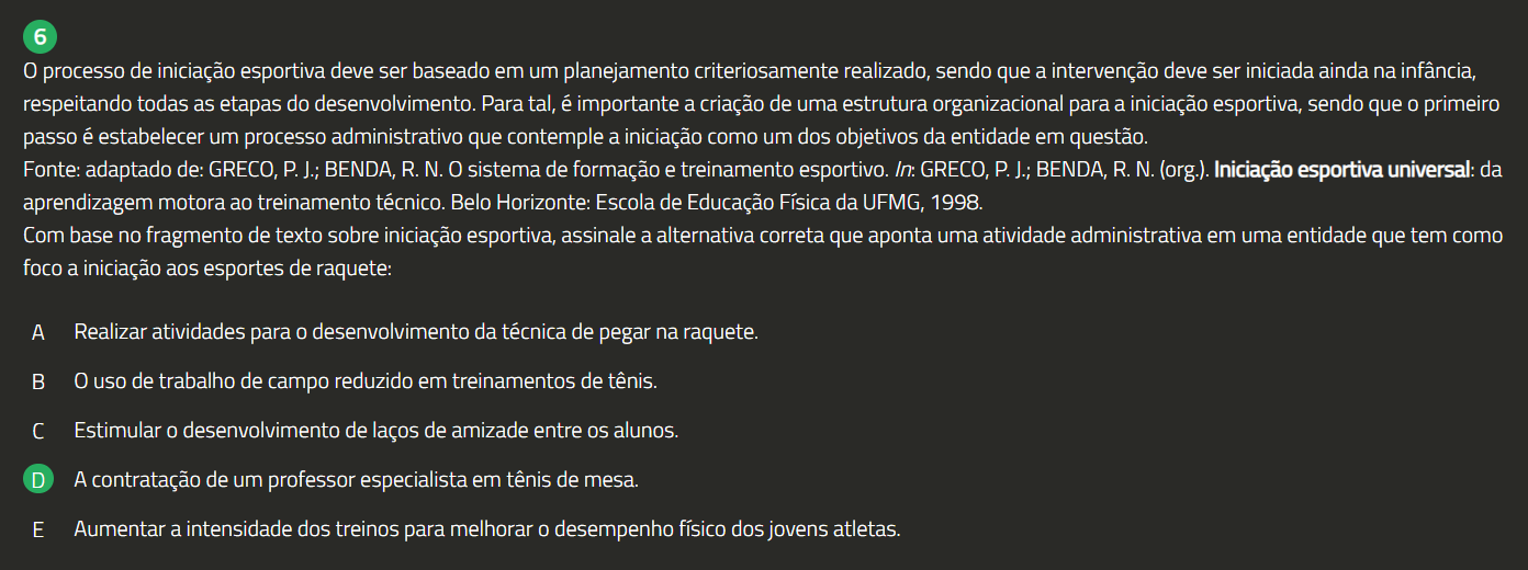 6 0 processo de iniciação esportiva deve ser baseado em um planejamento criteriosamente realizado, sendo que a intervenção deve ser iniciada ainda na infância, respeitando todas as etapas do desenvolvimento. Para tal, é importante a criação de uma estrutura organizacional para a iniciação esportiva, sendo que 0 primeiro passo é estabelecer um processo administrativo que contemple a iniciação como um dos objetivos da entidade em questão. Fonte: adaptado de: GRECO, P. J.; BENDA, R. N. 0 sistema de formação e treinamento esportivo. In: GRECO, P. J.; BENDA, R. N. (org.). Iniciação esportiva universal: da aprendizagem motora ao treinamento técnico. Belo Horizonte: Escola de Educação Física da UFMG, 1998. Com base no fragmento de texto sobre iniciação esportiva, assinale a alternativa correta que aponta uma atividade administrativa em uma entidade que tem como foco a iniciação aos esportes de raquete: A Realizar atividades para 0 desenvolvimento da técnica de pegar na raquete. B 0 uso de trabalho de campo reduzido em treinamentos de tênis. Estimular 0 desenvolvimento de laços de amizade entre alunos. D A contratação de um professor especialista em tênis de mesa. E Aumentar a intensidade dos treinos para melhorar 0 desempenho físico dos jovens atletas.