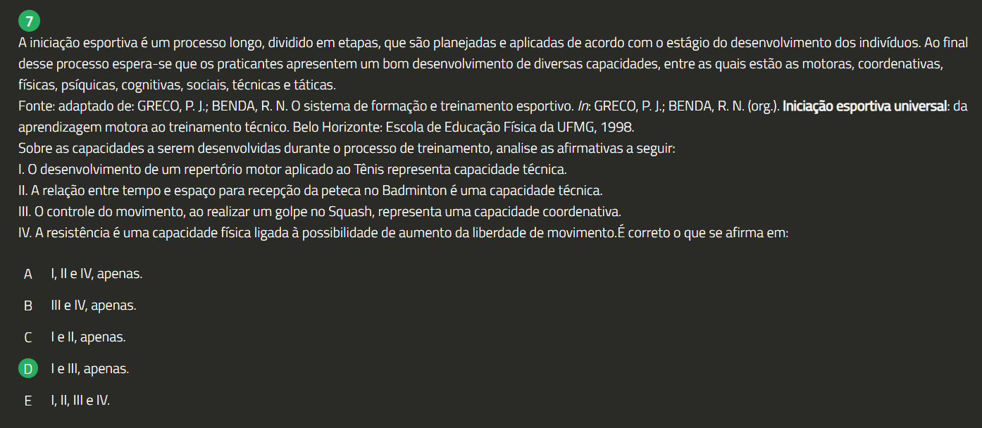 7 A iniciação esportiva é um processo longo, dividido em etapas, que são planejadas e aplicadas de acordo com 0 estágio do desenvolvimento dos indivíduos. Ao final desse processo espera-se que praticantes apresentem um bom desenvolvimento de diversas capacidades, entre as quais estão as motoras, coordenativas, físicas, psíquicas, cognitivas, sociais, técnicas e táticas. Fonte: adaptado de: GRECO, P. J.; BENDA, R. N. 0 sistema de formação e treinamento esportivo. In: GRECO, P. J.; BENDA, R.N. (org.). Iniciação esportiva universal: da aprendizagem motora ao treinamento técnico. Belo Horizonte: Escola de Educação Física da UFMG, 1998. Sobre as capacidades a serem desenvolvidas durante 0 processo de treinamento, analise as afirmativas a seguir: I. 0 desenvolvimento de um repertório motor aplicado ao Tênis representa capacidade técnica. II. A relação entre tempo e espaço para recepção da peteca no Badminton é uma capacidade técnica. III. 0 controle do movimento, ao realizar um golpe no Squash, representa uma capacidade coordenativa. IV. A resistência é uma capacidade física ligada à possibilidade de aumento da liberdade de movimento.É correto que se afirma em: A I, II e IV, apenas. B III e IV, apenas. le II, apenas. D le III, apenas. E I, II, III e IV.