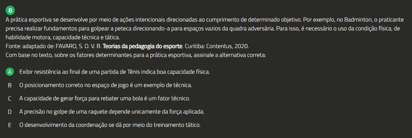 8 A prática esportiva se desenvolve por meio de ações intencionais direcionadas ao cumprimento de determinado objetivo. Por exemplo, no Badminton, 0 praticante precisa realizar fundamentos para golpear a peteca direcionando-a para espaços vazios da quadra adversária. Para isso, é necessário 0 uso da condição física, de habilidade motora, capacidade técnica e tática. Fonte: adaptado de: FAVARO, S. V.B. Teorias da pedagogia do esporte. Curitiba: Contentus, 2020. Com base no texto, sobre fatores determinantes para a prática esportiva, assinale a alternativa correta: A Exibir resistência ao final de uma partida de Tênis indica boa capacidade física. B 0 posicionamento correto no espaço de jogo é um exemplo de técnica. A capacidade de gerar força para rebater uma bola é um fator técnico. D A precisão no golpe de uma raquete depende unicamente da força aplicada. E 0 desenvolvimento da coordenação se dá por meio do treinamento tático.