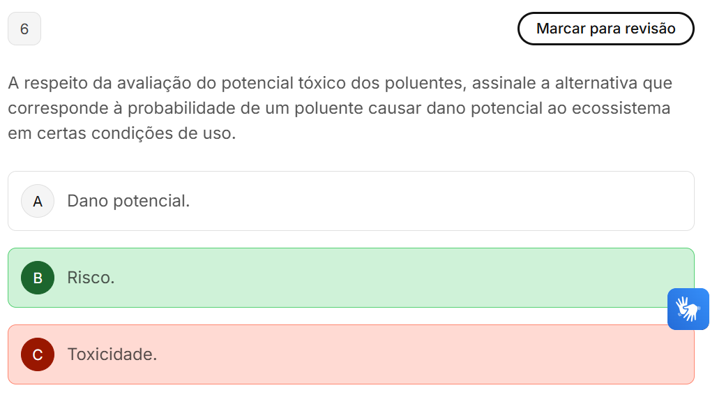 6 Marcar para revisão A respeito da avaliação do potencial tóxico dos poluentes, assinale a alternativa que corresponde à probabilidade de um poluente causar dano potencial ao ecossistema em certas condições de uso. A Dano potencial. Risco. c Toxicidade.