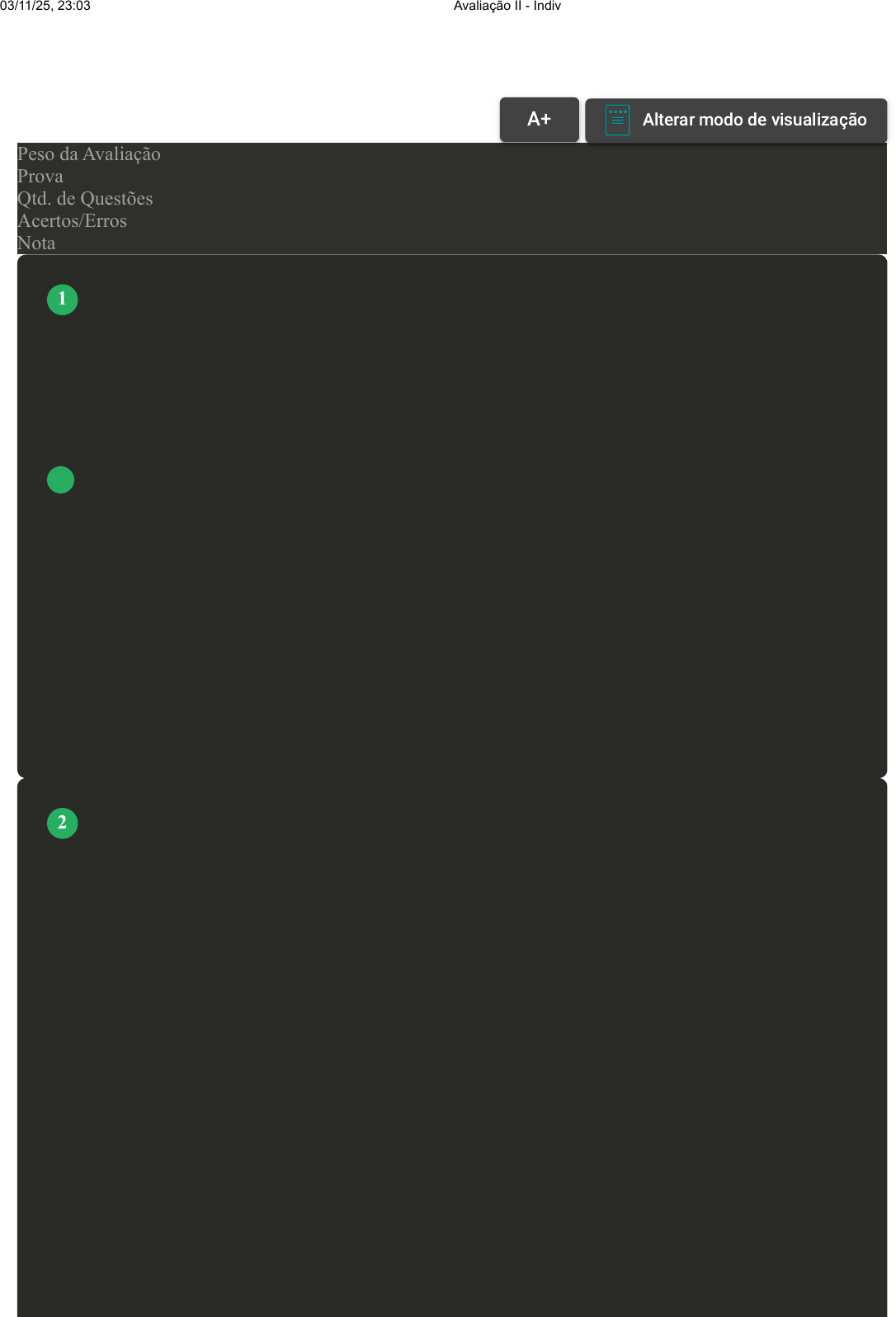 Prova Impressa GABARITO | Avaliação II - Individual (Cod.:1522215) Peso da Avaliação 2,00 Prova 107633519 Qtd. de Questões 10 Acertos/Erros 10/0 Nota 10,00 Documento elaborado no intento de criar um tratado em favor dos direitos das pessoas em tempos de guerra. Assinale a alternativa CORRETA que apresenta tal fator: A Convenção de Genebra. B Petition of Rights. C Carta Magna. D Declaração Norte-Americana. A classificação dos direitos humanos em gerações, obedecendo à ordem cronológica dos acontecimentos históricos, é uma convenção que se tem adotado para ressignificar as lutas e revoluções que precederam a Declaração de 1948, bem como documentos póstumos sobre o escopo atual. Nesse sentido, quais as gerações dos direitos humanos? A Direitos sociais e direitos fundamentais. B Direitos reais e de propriedade. C Direitos humanos de primeira geração (igualdade) e direitos humanos de segunda geração (liberdade). VOLTAR A+ Alterar modo de visualização 1 2 03/11/25, 23:03 Avaliação II - Individual about:blank 1/6 D Direitos humanos de primeira geração (liberdade), direitos humanos de segunda geração(igualdade) e direitos humanos de terceira geração (fraternidade). Com caráter anticlerical e liberal, a Constituição do México é um dos mais importantes documentos de reconhecimento dos direitos sociais como direitos fundamentais. Ela estabeleceu o princípio da igualdade posição jurídica entre trabalhadores e empresários com relação ao contrato de trabalho. Criou responsabilidades dos empregadores e anunciou direitos dos trabalhadores. Com relação à Constituição Mexicana, avalie as asserções a seguir e a relação proposta entre elas:: I- A Constituição Mexicana proclamada logo após a criação da Organização Internacional do Trabalho (OIT) é considerada até hoje a Carta Magna mais liberal e moderna da América Latina. PORQUE I- Foi pioneira no que tange à reforma agrária, garantindo direitos aos trabalhadores, equiparando as relações entre capital e trabalho, criando a jornada diária de 8 horas, regulamentando o trabalho do menor e da mulher com salários iguais para tarefas iguais e outros. Assinale a alternativa CORRETA: A A asserção I é uma proposição falsa, e a II é uma proposição verdadeira. B As asserções I e II são proposições verdadeiras, e a II é uma justificativa correta da I. C As asserções I e II são proposições verdadeiras, mas a II não é uma justificativa correta da I. D A asserção I é uma proposição verdadeira, e a II é uma proposição falsa. A Constituição de 1988 foi um grande marco, não só por contemplar os direitos humanos, antes não contemplados nas Constituições, mas também por contemplar os grupos sociais considerados distintos dos grupos dominantes, como os idosos, as crianças, os negros, as mulheres, os deficientes físicos, entre outros. As leis que protegem esses grupos foram promulgadas a partir de 1988. De acordo com a lei, classifique V para as sentenças verdadeiras e F para as falsas: ( ) Em 1989, entrou em vigor uma lei que tornou o racismo crime inafiançável. ( ) No final da década de 1980, ficou assegurado, através de uma lei, o direito de ir e vir dos deficientes físicos. ( ) Em 2000, foi criado o Estatuto da Criança e do Adolescente e o Conselho do Idoso. ( ) Em 2008, a Lei de Diretrizes e Bases da Educação (LDB) instituiu a obrigatoriedade da inserção da história afro-brasileira e indígena nos currículos escolares. Assinale a alternativa que apresenta a sequência CORRETA: FONTE: BRASIL. Constituição (1988). Constituição da República Federativa do Brasil. Brasília, DF: Senado Federal, 1988. A V - F - V - V. B F - F - V - F. 3 4 03/11/25, 23:03 Avaliação II - Individual about:blank 2/6 C F - V - F - V. D V - V - F - V. O período da Segunda Guerra Mundial é marcado pela suspensão de todos os acordos e documentos de direitos humanos no âmbito dos países envolvidos. Assim, ideias antissemíticas e racistas, sobretudo dos nazistas, deram origem a qual fator? A Holocausto. B Tratado de Tordesilhas. C Guerra Fria. D Tratado de Madri. O princípio da dignidade humana adquiriu um papel central nas Constituições e nos Tratados Internacionais modernos, sendo frequentemente usado como base em decisões judiciais nos mais variados assuntos. No século XVIII, um filósofo alemão influenciou vários conceitos jurídicos modernos sobre a dignidade humana. Quem é esse filósofo? A Friedrich Nietzsche. B Liev Tolstói. C Nikolai Fiodorov. D Immanuel Kant. A classificação dos Direitos Humanos em gerações, obedecendo à ordem cronológica dos acontecimentos históricos, é uma convenção que se tem adotado para ressignificar as lutas e revoluções que precederam a Declaração de 1948, bem como documentos póstumos sobre o escopo atual. Sobre isso, associe os itens, utilizando o código a seguir: I- Liberdade. 5 6 7 03/11/25, 23:03 Avaliação II - Individual about:blank 3/6 II- Igualdade. III- Fraternidade. ( ) Direitos Humanos de Primeira Geração. ( ) Direitos Humanos de Segunda Geração. ( ) Direitos Humanos de Terceira Geração. Assinale a alternativa que apresenta a sequência CORRETA: A I – II – III. B III – II – I. C II – III – I D I – III – II. A Constituição é um conjunto de leis, normas e regras presentes em um país. Baseia-se para regular e organizar o direito público de uma nação. É considerada a lei máxima que limita os poderes, definindo os direitos e deveres dos seus cidadãos. Nenhuma outra lei no país pode conflitar com a Constituição. Sobre a Constituição brasileira, analise as afirmativas a seguir: I- A primeira Constituição brasileira ocorreu em 1528. II- A Constituição de 1824 tratava dos direitos civis e políticos dos cidadãos brasileiros. III- A Constituição de 1824 ficou vigente até 1889 quando, então, nesse último ano, entrou em vigor a Constituição Republicana. IV- A C