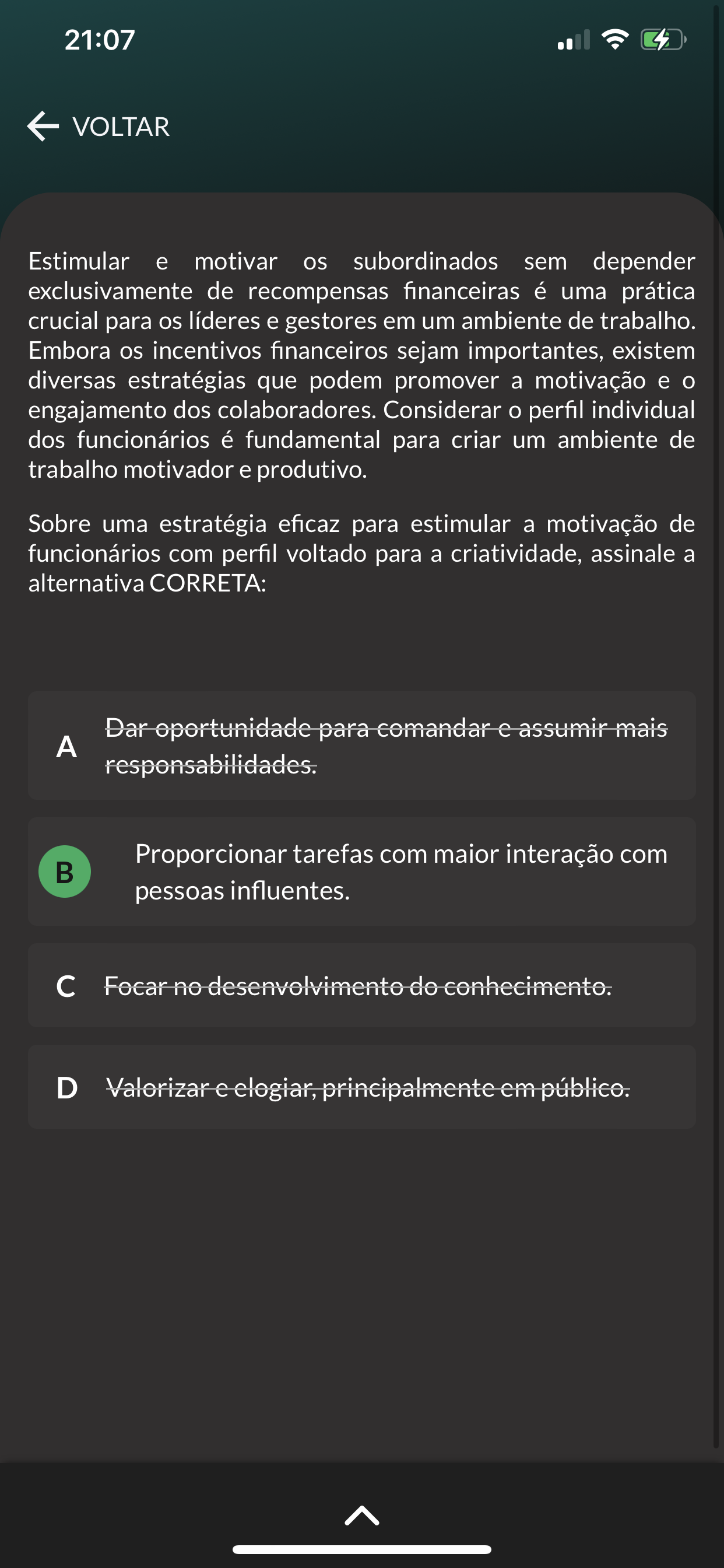 21:07 4 VOLTAR Estimular e motivar os subordinados sem depender exclusivamente de recompensas financeiras é uma prática crucial para os líderes e gestores em um ambiente de trabalho. Embora os incentivos financeiros sejam importantes, existem diversas estratégias que podem promover a motivação e engajamento dos colaboradores. Considerar perfil individual dos funcionários é fundamental para criar um ambiente de trabalho motivador e produtivo. Sobre uma estratégia eficaz para estimular a motivação de funcionários com perfil voltado para a criatividade, assinale a alternativa CORRETA: Dar oportunidade para comandar e assumir mais A responsabilidades. Proporcionar tarefas com maior interação com B pessoas influentes. c Focar no desenvolvimento do conhecimento. D Valorizar e elogiar, principalmente em público.