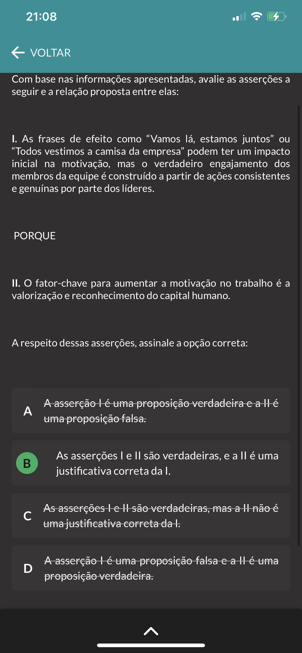 21:08 VOLTAR Com base nas informações apresentadas, avalie as asserções a seguir e a relação proposta entre elas: I. As frases de efeito como "Vamos lá, estamos juntos" ou "Todos vestimos a camisa da empresa" podem ter um impacto inicial na motivação, mas verdadeiro engajamento dos membros da equipe é construído a partir de ações consistentes e genuínas por parte dos líderes. PORQUE II. fator-chave para aumentar a motivação no trabalho é a valorização e reconhecimento do capital humano. A respeito dessas asserções, assinale a opção correta: A asserção lé uma proposição verdadeira e a H é A uma proposição falsa. As asserções le II são verdadeiras, e a II é uma justificativa correta da I. As asserções le H são verdadeiras, mas a não é c uma justificativa correta da I. A asserção lé uma proposição falsa e a H é uma D proposição verdadeira.