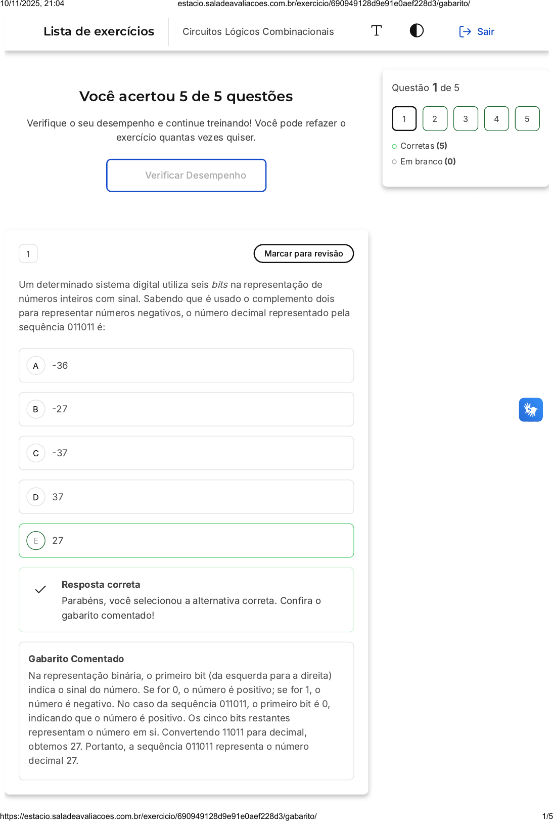 Você acertou 5 de 5 questões Verifique o seu desempenho e continue treinando! Você pode refazer o exercício quantas vezes quiser. Verificar Desempenho A B C D E 1 Marcar para revisão Um determinado sistema digital utiliza seis bits na representação de números inteiros com sinal. Sabendo que é usado o complemento dois para representar números negativos, o número decimal representado pela sequência 011011 é: -36 -27 -37 37 27 Resposta correta Parabéns, você selecionou a alternativa correta. Confira o gabarito comentado! Gabarito Comentado Na representação binária, o primeiro bit (da esquerda para a direita) indica o sinal do número. Se for 0, o número é positivo; se for 1, o número é negativo. No caso da sequência 011011, o primeiro bit é 0, indicando que o número é positivo. Os cinco bits restantes representam o número em si. Convertendo 11011 para decimal, obtemos 27. Portanto, a sequência 011011 representa o número decimal 27. Questão 1 de 5 Corretas (5) Em branco (0) 1 2 3 4 5 Lista de exercícios Circuitos Lógicos Combinacionais Sair 10/11/2025, 21:04 estacio.saladeavaliacoes.com.br/exercicio/690949128d9e91e0aef228d3/gabarito/ https://estacio.saladeavaliacoes.com.br/exercicio/690949128d9e91e0aef228d3/gabarito/ 1/5 A B C D E 2 Marcar para revisão Um determinado sistema digital utiliza quatro bits para representar números inteiros. Dados dois números inteiros sem sinal, A = 1001 e B = 0111, o resultado da soma A + B realizada por esse sistema, em decimal, é: 16 15 2 0 17 Resposta correta Parabéns, você selecionou a alternativa correta. Confira o gabarito comentado! Gabarito Comentado Os números A e B são representados em binário. A = 1001, que é 9 em decimal, e B = 0111, que é 7 em decimal. A soma de A e B em decimal seria 9 + 7 = 16. No entanto, como o sistema digital em questão utiliza apenas quatro bits para representar números inteiros, o resultado 16 não pode ser representado, pois exigiria um quinto bit. Portanto, ocorre um estouro de bit, e o resultado é 0. 3 Marcar para revisão A expressão da saída do circuito a seguir, F, é: 10/11/2025, 21:04 estacio.saladeavaliacoes.com.br/exercicio/690949128d9e91e0aef228d3/gabarito/ https://estacio.saladeavaliacoes.com.br/exercicio/690949128d9e91e0aef228d3/gabarito/ 2/5 A B C D E F = ¯̄¯̄ CB ¯̄¯̄ A + CB ¯̄¯̄ A F = C ¯̄¯̄ BA F = ¯̄¯̄ BA F = ¯̄¯̄ C ¯̄¯̄ BA+ CB ¯̄¯̄ A F = C( ¯̄¯̄ B +A) Resposta correta Parabéns, você selecionou a alternativa correta. Confira o gabarito comentado! Gabarito Comentado A resposta correta é: F = ¯̄¯̄ BA 4 Marcar para revisão A figura, a seguir, ilustra um multiplexador de 4 entradas para 1 saída e o mapa de Karnaugh a ser implementado para o sinal W através do circuito. Os sinais S1 e S0 são as entradas de controle do integrado, onde S1 representa o bit mais significativo. O bloco tracejado deverá conter os circuitos que conectarão os sinais de X e Y às entradas do multiplexador. A fim de reproduzir o mapa de Karnaugh, qual é a expressão booleana do circuito que será conectado ao pino IP2? 10/11/2025, 21:04 estacio.saladeavaliacoes.com.br/exercicio/690949128d9e91e0aef228d3/gabarito/ https://estacio.saladeavaliacoes.com.br/exercicio/690949128d9e91e0aef228d3/gabarito/ 3/5 A B C D E A B C XY X ¯̄¯̄ Y X + Y X ⊕ Y ¯̄¯̄¯̄¯̄¯̄¯̄¯̄¯ X ⊕ Y Resposta correta Parabéns, você selecionou a alternativa correta. Confira o gabarito comentado! Gabarito Comentado A resposta correta é: X ⊕ Y 5 Marcar para revisão Um determinado sistema digital utiliza oito bits para representar números inteiros e é utilizado o complemento dois para representar os números negativos. Dados dois números inteiros com sinal, A = 1001 1101 e B = 0010 0111, o resultado da soma A + B realizada por esse sistema, em decimal, é: 20 188 196 10/11/2025, 21:04 estacio.saladeavaliacoes.com.br/exercicio/690949128d9e91e0aef228d3/gabarito/ https://estacio.saladeavaliacoes.com.br/exercicio/690949128d9e91e0aef228d3/gabarito/ 4/5 D E -66 66 Resposta correta Parabéns, você selecionou a alternativa correta. Confira o gabarito comentado! Gabarito Comentado 1 0 0 1 1 1 0 1 + 0 0 1 0 0 1 1 1 _______________ 1 0 1 1 1 1 0 0 A soma dos números binários A e B resulta em 1011 1100. Ao converter esse número binário para decimal, obtemos o valor 188. Portanto, a soma de A e B, em decimal, é 188. 10/11/2025, 21:04 estacio.saladeavaliacoes.com.br/exercicio/690949128d9e91e0aef228d3/gabarito/ https://estacio.saladeavaliacoes.com.br/exercicio/690949128d9e91e0aef228d3/gabarito/ 5/5