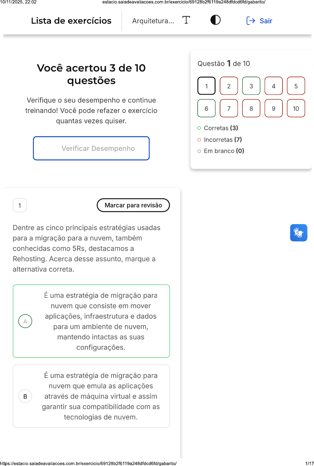 10/11/2025, 22:02 estacio.saladeavaliacoes.com.br/exercicio/69128b2f6119a248dfdcd6fd/gabarito/ Lista de exercícios Arquitetura... T Sair Questão 1 de 10 Você acertou 3 de 10 questões 1 2 3 4 5 Verifique seu desempenho e continue treinando! Você pode refazer exercício 6 7 8 9 10 quantas vezes quiser. Corretas (3) Incorretas (7) Verificar Desempenho Em branco 1 Marcar para revisão Dentre as cinco principais estratégias usadas para a migração para a nuvem, também conhecidas como 5Rs, destacamos a Rehosting. Acerca desse assunto, marque a alternativa correta. É uma estratégia de migração para nuvem que consiste em mover aplicações, infraestrutura e dados A para um ambiente de nuvem, mantendo intactas as suas configurações. É uma estratégia de migração para nuvem que emula as aplicações através de máquina virtual e assim garantir sua compatibilidade com as tecnologias de nuvem. https://estacio.saladeavaliacoes.com.br/exercicio/69128b2f6119a248dfdcd6fd/gabarito/ 1/1710/11/2025, 22:02 estacio.saladeavaliacoes.com.br/exercicio/69128b2f6119a248dfdcd6fd/gabarito/ É uma estratégia de migração para nuvem que tem como objetivo aumentar a receita e a lucratividade da c empresa, ao mesmo tempo em que ajuda a construir relacionamentos de longo prazo com os clientes. É uma estratégia de migração para nuvem que consiste em desenvolver D os sistemas do zero para torná-los nativos da nuvem. É uma estratégia de migração para nuvem que consiste na desativação ou E desligamento dos serviços (workloads) que não são mais necessários. Resposta correta Parabéns, você selecionou a alternativa correta. Confira gabarito comentado! Gabarito Comentado A estratégia de Rehosting, também conhecida como "lift and shift", é uma das principais abordagens utilizadas na migração para a nuvem. Essa estratégia envolve a transferência de aplicações, infraestrutura e dados para um ambiente de nuvem, mantendo suas configurações originais intactas. Isso significa que não há necessidade de alterações significativas no sistema durante a migração, que pode simplificar e acelerar processo. Essa estratégia é aplicável tanto para ambientes on-premises quanto para bare-metal, permitindo a migração de recursos de um ambiente físico para um ambiente de 2/1710/11/2025, 22:02 estacio.saladeavaliacoes.com.br/exercicio/69128b2f6119a248dfdcd6fd/gabarito/ nuvem. Portanto, a alternativa A está correta. 2 Marcar para revisão Na arquitetura de computação em nuvem, um dos serviços existentes no back-end é serviço de armazenamento na nuvem. Como esse serviço pode ser utilizado? Para descartar backups automáticos A de arquivos Para gerenciar escalabilidade de recursos em nuvem Para garantir a segurança de dados c em nuvem Para compartilhar arquivos entre D diferentes usuários e dispositivos Para automatizar tarefas de E gerenciamento de redes X Resposta incorreta A alternativa correta é a letra D. Confira gabarito comentado! Gabarito Comentado serviço de armazenamento na nuvem é uma ferramenta essencial na arquitetura de computação em nuvem. Ele permite que os usuários armazenem e acessem arquivos 3/1710/11/2025, 22:02 estacio.saladeavaliacoes.com.br/exercicio/69128b2f6119a248dfdcd6fd/gabarito/ de maneira remota, independentemente de onde estejam fisicamente. Isso significa que os usuários podem acessar seus arquivos de qualquer lugar, desde que tenham uma conexão com a internet e as credenciais de acesso corretas. Além disso, este serviço também possibilita compartilhamento de arquivos com outros usuários, independentemente de onde eles estejam. Isso facilita a colaboração eficiente em projetos e tarefas em equipe. Esta funcionalidade é especialmente útil para empresas ou equipes que trabalham em diferentes locais, pois permite que eles compartilhem arquivos de maneira segura e fácil. Portanto, a alternativa D, "Para compartilhar arquivos entre diferentes usuários e dispositivos", é a resposta correta. 3 Marcar para revisão Os serviços de computação em nuvem são oferecidos por diversos provedores de computação em nuvem, que podem oferecer a possibilidade de criação, administração e gerenciamento de servidores. Com base nesse conceito, assinale a alternativa que apresenta os 3 maiores provedores de soluções em nuvem que permitem a criação, administração e gerenciamento de servidores? Google Cloud Platform, AWS, A Microsoft Azure. AWS, Oracle Cloud, IBM Cloud. https://estacio.saladeavaliacoes.com.br/exercicio/69128b2f6119a248dfdcd6fd/gabarito/ 4/1710/11/2025, 22:02 AWS, Google Cloud Platform, Alibaba c Cloud. Microsoft Azure, Oracle Cloud, IBM D Cloud. E AWS, Microsoft Azure, Alibaba Cloud. Resposta correta Parabéns, você selecionou a alternativa correta. Confira gabarito comentado! Gabarito Comentado Google Cloud Platform (GCP), Amazon Web Services (AWS) e Microsoft Azure são os principais provedores de soluções em nuvem que permitem a criação, administração e gerenciamento de servidores porque eles oferecem uma ampla variedade de serviços e recursos para ajudar as empresas a construir, implantar e gerenciar aplicativos e serviços em nuvem. GCP, AWS e Azure oferecem uma variedade de opções de infraestrutura, como máquinas virtuais, armazenamento, redes e banco de dados, permitindo que as empresas escalem seus recursos de acordo com suas necessidades. Além disso, eles também oferecem ferramentas de gerenciamento e automação, como gerenciamento de contêineres, monitoramento e gerenciamento de segurança, para ajudar as empresas a gerenciar e otimizar seus recursos em nuvem. Outra razão pela qual esses provedores são considerados os principais é a sua ampla adoção e suporte 5/1710/11/2025, 22:02 estacio.saladeavaliacoes.com.br/exercicio/69128b2f6119a248dfdcd6fd/gabarito/ em todo mundo, incluindo uma ampla gama de indústrias e setores. Eles também possuem um histórico de inovação e investimento constante em novos