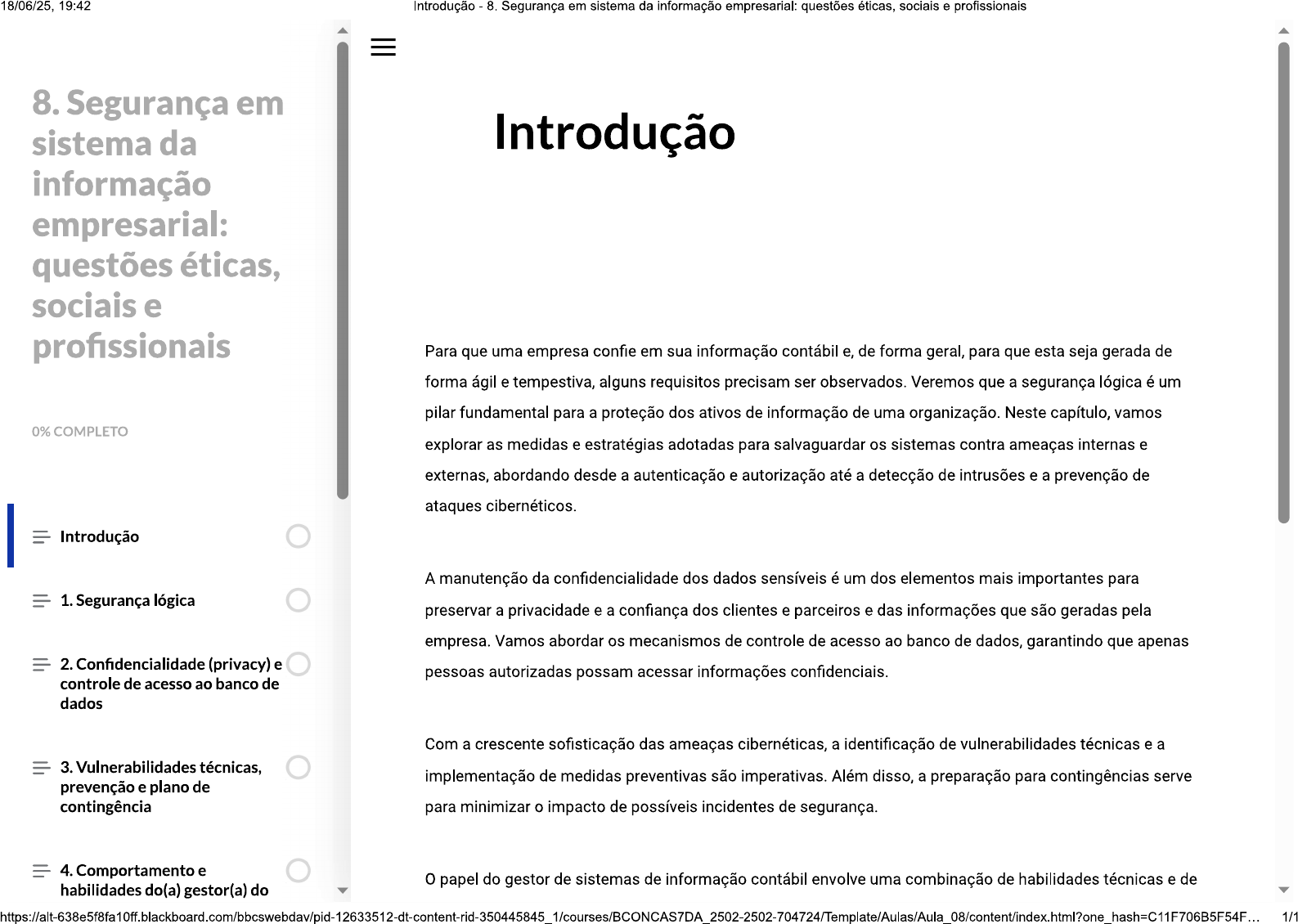 18/06/25, 19:42 Introdução - 8. Segurança em sistema da informação empresarial: questões éticas, sociais e profissionais 8. Segurança em sistema da Introdução informação empresarial: questões éticas, sociais e profissionais Para que uma empresa confie em sua informação contábil e, de forma geral, para que esta seja gerada de forma ágil e tempestiva, alguns requisitos precisam ser observados. Veremos que a segurança lógica é um pilar fundamental para a proteção dos ativos de informação de uma organização. Neste capítulo, vamos 0% COMPLETO explorar as medidas e estratégias adotadas para salvaguardar os sistemas contra ameaças internas e externas, abordando desde a autenticação e autorização até a detecção de intrusões e a prevenção de ataques cibernéticos. Introdução A manutenção da confidencialidade dos dados sensíveis é um dos elementos mais importantes para 1. Segurança lógica preservar a privacidade e a confiança dos clientes e parceiros e das informações que são geradas pela empresa. Vamos abordar os mecanismos de controle de acesso ao banco de dados, garantindo que apenas 2. Confidencialidade (privacy) e pessoas autorizadas possam acessar informações confidenciais. controle de acesso ao banco de dados Com a crescente sofisticação das ameaças cibernéticas, a identificação de vulnerabilidades técnicas e a 3. Vulnerabilidades técnicas, implementação de medidas preventivas são imperativas. Além disso, a preparação para contingências serve prevenção e plano de contingência para minimizar o impacto de possíveis incidentes de segurança. 4. Comportamento e o papel do gestor de sistemas de informação contábil envolve uma combinação de habilidades técnicas e de habilidades do(a) gestor(a) do 1/1