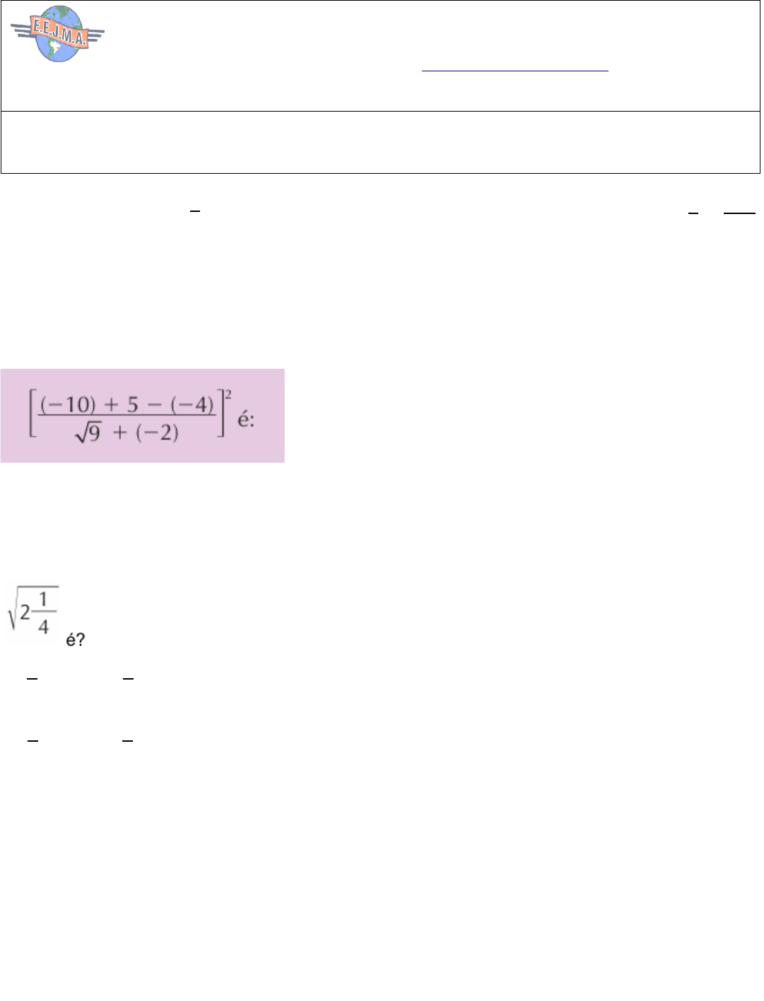 ESCOLA ESTADUAL JOAQUIM MAURÍCIO DE AZEVEDO ENSINO FUNDAMENTAL E MÉDIO COMUM GERAL Rua Ubaldino de Assis, nº 364, Bairro Rio Novo – CEP: 39.440-332 – Janaúba/MG Fone: (38) 3821-2050 – E-mail: escola.233374@educacao.mg.gov.br ESTUDOS INDEPENDENTES DE RECUPERAÇÃO AVALIAÇÃO Professor(a): Amanda Meira Alves Componente curricular: Matemática Valor: 60 Pontos Nota:___________ NOME: ________________________________________________________________________________Turma: 7° ano________ 1. A solução da equação 𝑥 8 = 2 é? A) 12 B) 18 C) 17 D) 16 2. O valor da expressão: A) 1 B) 2 C) -1 D) -2 3. o valor da raiz quadrada A) 9 4 B) 3 2 C) 1 2 D) 2 4 4. Calcule o valor da expressão: [ 24 ÷ (7 - 15) - 13 ] . (1 - 5) = A) + 64 B) - 18 C) - 15 D) + 52 5. A operação (0,5)2 + (0,8)2 é igual a? A) 0,89 B) 0,64 C) 0,26 D) 0,09 6. Calcule o valor de x na proporção: 𝑥 6 = 𝑥+2 10 A) 4 B) 3 C) 2 D) 6 7. Numa lanchonete, a cada 27 pastéis de carne vendidos, vendem-se 9 de palmito. Em certo dia, foram vendidos 30 pastéis de carne. Quantos pastéis de palmito foram vendidos A) 12 B) 13 C) 17 D) 10 8. Com 14 litros de tinta podemos pintar uma parede de 35 m2. Quantos litros são necessários para pintar uma parede de 15 m2? A) 4 B) 2 C) 6 D) 5 9. Na promoção de uma loja de eletrodomésticos, um aparelho de som que custava R$ 500,00 teve um desconto de 12%. Quanto o cliente que decidir comprar o equipamento pagará? A) 440 B) 390 C) 410 D) 420 10. Comprei uma geladeira por R$ 1.500,00, a serem pagos com entrada de 10% e o restante em 6 prestações iguais. Qual é o valor de cada prestação? A) 225 B) 150 C) 180 D) 300 mailto:escola.233374@educacao.mg.gov.br 11. João aplicou R$ 30.000,00 durante 3 meses em uma aplicação a juros simples com uma taxa de 6% ao mês. Qual o valor recebido por João ao final desta aplicação? A) 5400 B) 34500 C) 4500 D) 35400 12. Uma dívida de R$13.000,00 foi paga 4 meses após contraída e os juros pagos foram de R$ 780,00. Sabendo que o cálculo foi feito usando juros simples, qual foi a taxa de juros? A) 1,2% B) 1,8% C) 1,5% D) 2,1% 13. Se um quilo de refeição no supermercado custa R$ 20,80, quanto pagarei, em reais, por 250 gramas? A) R$ 10,40 B) R$ 15,20 C) R$ 8,40 D) R$ 5,20 14. Qual é a área do quadrado? A) 0,12 B) 0,36 C) 0,2 D) 2 15. Qual o valor de: A)0,1 B)0,01 C)1 D) 10 16. Um médico estima em 1/4 de hora o tempo que leva para examinar um paciente. Nesse ritmo, quantos pacientes ele poderá examinar em 5 horas? A) 18 B) 15 C) 20 D) 12 17. número 0,64 pode ser representado por: A) 8 25 B) 16 50 C) 25 16 D) 16 25 18. 72° é a medida do: A) suplemento de um ângulo de 98°. B) complemento de um ângulo de 98°. C) suplemento de um ângulo de 108°. D) complemento de um ângulo de 108°. 19. O trajeto da vovó pela casa tem a forma do triângulo cujos valores dos ângulos internos estão indicados na figura. Com essas informações, qual o valor do ângulo a? A) 42° B) 35° C) 80° D) 130° 20. o valor de x na figura abaixo é? A) 180° B)50° C) 30° D) 20°