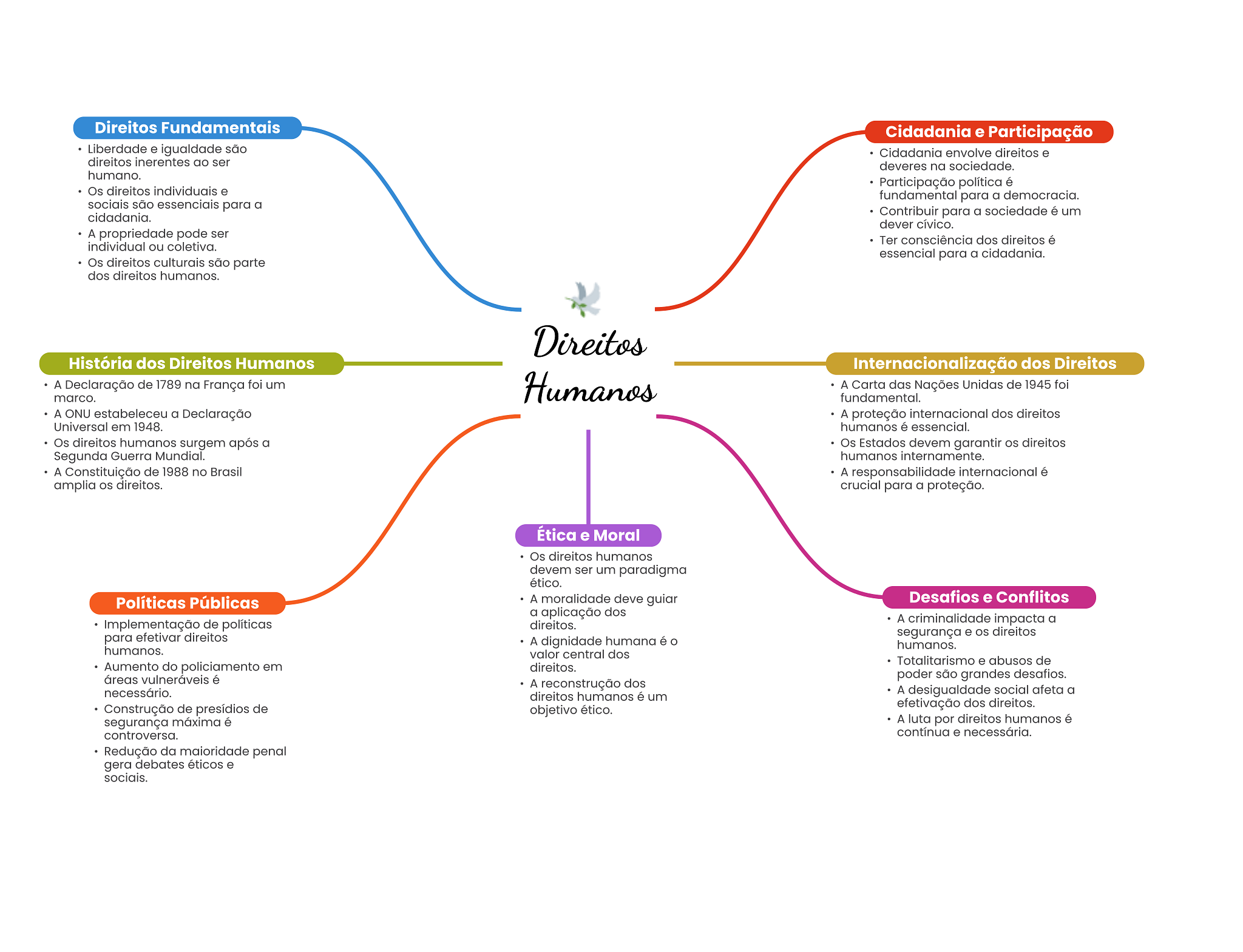 Direitos Fundamentais Cidadania e Participação Liberdade e igualdade são Cidadania envolve direitos e direitos inerentes ao ser deveres na sociedade. humano. Participação política é Os direitos individuais e fundamental para a democracia. sociais são essenciais para a cidadania. Contribuir para a sociedade é um dever cívico. A propriedade pode ser Ter consciência dos direitos é individual ou coletiva. essencial para a cidadania. Os direitos culturais são parte dos direitos humanos. Direitos História dos Direitos Humanos Internacionalização dos Direitos A Declaração de 1789 na França foi um marco. Humanos A Carta das Nações Unidas de 1945 foi fundamental. A ONU estabeleceu a Declaração A proteção internacional dos direitos Universal em 1948. humanos é essencial. Os direitos humanos surgem após a Os Estados devem garantir OS direitos Segunda Guerra Mundial. humanos internamente. A Constituição de 1988 no Brasil A responsabilidade internacional é amplia OS direitos. crucial para a proteção. Ética e Moral Os direitos humanos devem ser um paradigma ético. Políticas Públicas A moralidade deve guiar Desafios e Conflitos a aplicação dos Implementação de políticas direitos. A criminalidade impacta a para efetivar direitos segurança e direitos A dignidade humana é O humanos. humanos. valor central dos Totalitarismo e abusos de Aumento do policiamento em direitos. áreas vulneráveis é poder são grandes desafios. A reconstrução dos necessário. direitos humanos é um A desigualdade social afeta a Construção de presídios de objetivo ético. efetivação dos direitos. segurança máxima é A luta por direitos humanos é controversa. contínua e necessária. Redução da maioridade penal gera debates éticos e sociais.