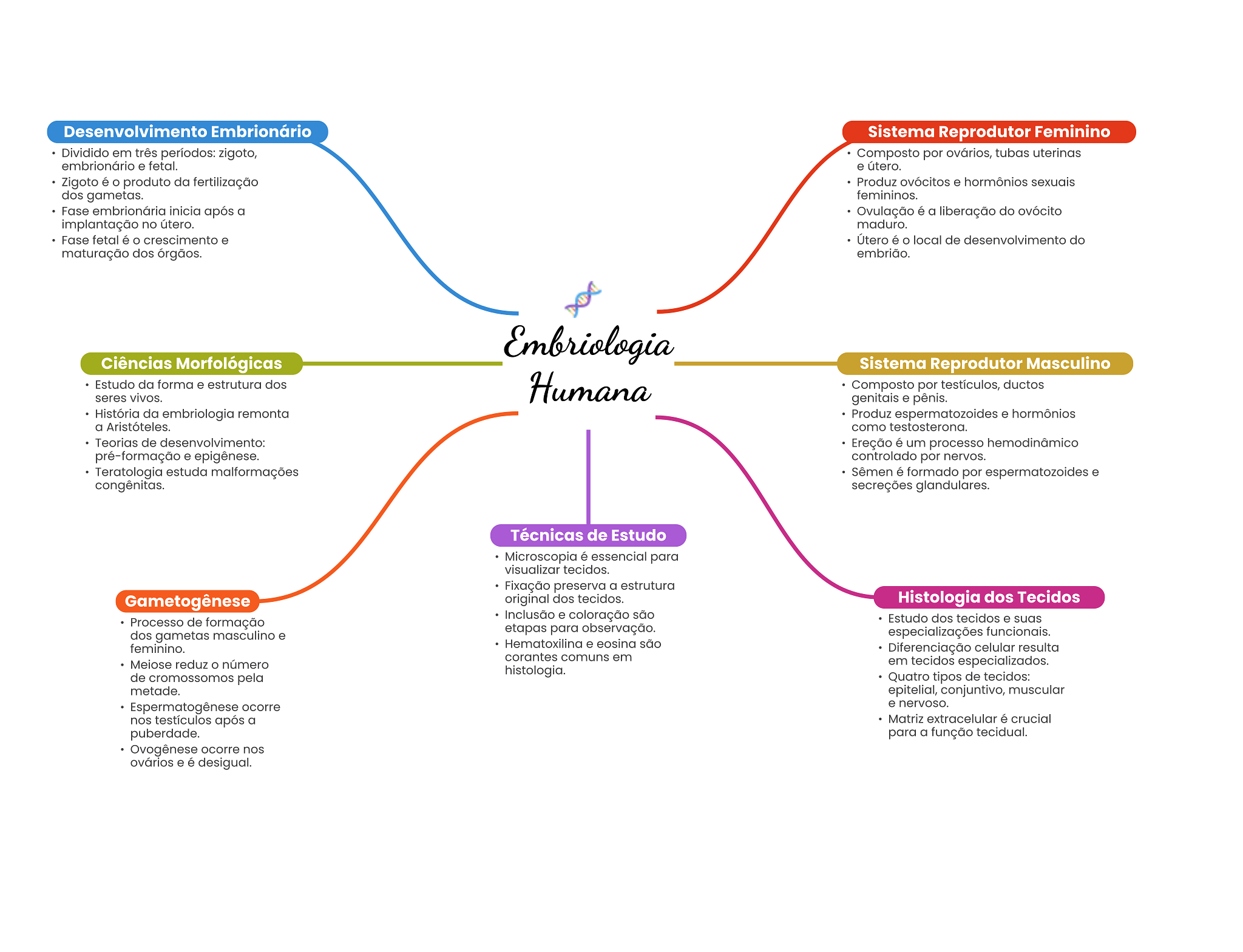 Desenvolvimento Embrionário Sistema Reprodutor Feminino Dividido em três períodos: zigoto, Composto por ovários, tubas uterinas embrionário e fetal. e útero. Zigoto é produto da fertilização Produz ovócitos e hormônios sexuais dos gametas. femininos. Fase embrionária inicia após a Ovulação é a liberação do ovócito implantação no útero. maduro. Fase fetal é crescimento e Útero é local de desenvolvimento do maturação dos órgãos. embrião. Embriologia Ciências Morfológicas Sistema Reprodutor Masculino Estudo da forma e estrutura dos seres vivos. Humana Composto por testículos, ductos genitais e pênis. História da embriologia remonta Produz espermatozoides e hormônios a Aristóteles. como testosterona. Teorias de desenvolvimento: Ereção é um processo hemodinâmico pré-formação e epigênese. controlado por nervos. Teratologia estuda malformações Sêmen é formado por espermatozoides e congênitas. secreções glandulares. Técnicas de Estudo Microscopia é essencial para visualizar tecidos. Fixação preserva a estrutura Gametogênese original dos tecidos. Histologia dos Tecidos Inclusão e coloração são Processo de formação Estudo dos tecidos e suas etapas para observação. dos gametas masculino e especializações funcionais. feminino. Hematoxilina e eosina são Diferenciação celular resulta corantes comuns em Meiose reduz número em tecidos especializados. histologia. de cromossomos pela Quatro tipos de tecidos: metade. epitelial, conjuntivo, muscular Espermatogênese ocorre e nervoso. nos testículos após a Matriz extracelular é crucial puberdade. para a função tecidual. Ovogênese ocorre nos ovários e é desigual.