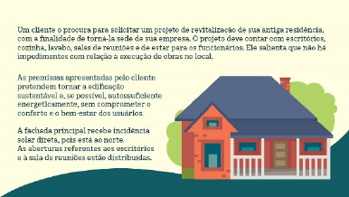 Desafio 1.2 Arquitetura sustentável no Brasil e no mundo Além de minimizar os impactos ambientais e preservar a vida no planeta, a utilização de estratégias sustentáveis proporciona uma redução significativa nos custos gerados por uma edificação. Com base nas informações apresentadas, faça o que se pede a seguir: a) Indique três soluções para tornar a edificação sustentável, apresentando soluções que dizem respeito ao reaproveitamento de recursos naturais, ao aproveitamento de energia e a técnicas passivas que proporcionem conforto ambiental. b) Apresente também uma alternativa para que os jardins possam ser utilizados para o desenvolvimento de trabalhos criativos, pois atualmente o ambiente externo carece de vegetação e de áreas de convivência. c) Indique uma solução que possa ser aplicada após a conclusão das obras, durante a etapa de uso da edificação. Padrão de resposta esperado A) Como solução de reaproveitamento de recurso natural, pode ser indicada a coleta de água da chuva para ser utilizada nos vasos sanitários, para a irrigação dos jardins e para a limpeza dos pisos. Com o objetivo de tornar a edificação autossuficiente energeticamente e gerar o aproveitamento de energia, pode ser indicada a instalação de painéis fotovoltaicos e sistemas de aquecimento solar de água compreendendo as técnicas passivas e para amenizar a incidência solar direta na fachada norte, é recomendável a instalação de brises-soleilse a utilização de massas de vegetação, o que possibilitará também a utilização dos jardins com maior frequência. B) Junto à massa de vegetação, devem ser instalados bancos e mesas para atender as premissas do cliente de utilização das áreas externas para o desenvolvimento de trabalhos criativos e de áreas de convivência. C) Na etapa de uso da edificação deve ser recomendada a utilização de equipamentos eletrônicos eficientes, com baixo consumo de energia e sistemas de iluminação em led, que apresentam baixo consumo de energia e longo período de vida útil. image1.jpeg