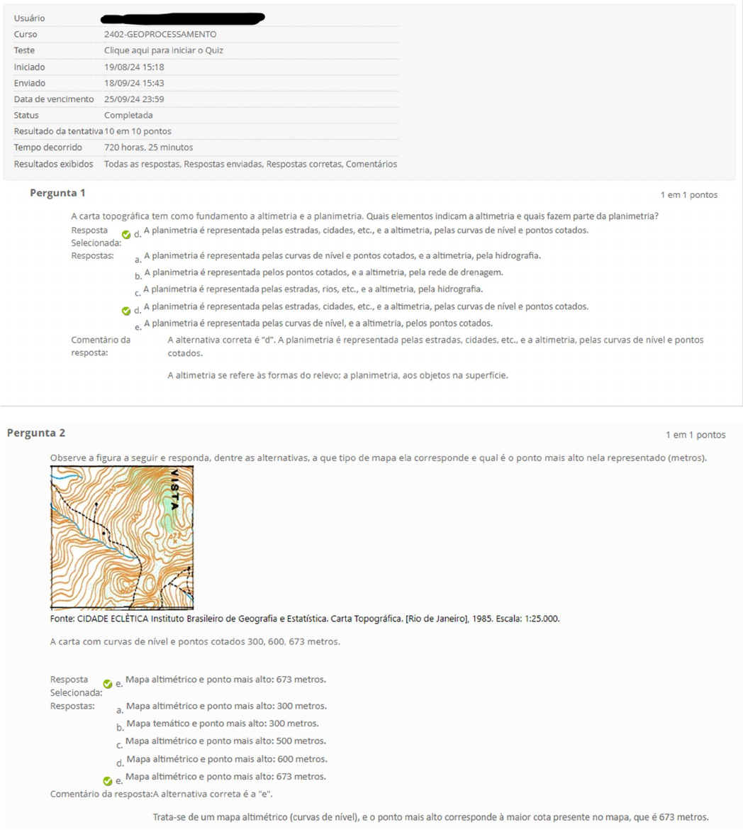 Usuário Curso 2402-GEOPROCESSAMENTO Teste Clique aqui para iniciar Quiz Iniciado 19/08/24 15:18 Enviado 18/09/24 15:43 Data de vencimento 25/09/24 23:59 Status Completada Resultado da tentativa 10 em 10 pontos Tempo decorrido 720 horas, 25 minutos Resultados exibidos Todas as respostas, Respostas enviadas, Respostas corretas, Comentários Pergunta 1 1 em pontos A carta topográfica tem como fundamento a altimetria e a planimetria. Quais elementos indicam a altimetria e quais fazem parte da planimetria? Resposta d. A planimetria é representada pelas estradas, cidades, etc., e a altimetria, pelas curvas de nível e pontos cotados. Selecionada: Respostas: a. A planimetria é representada pelas curvas de nível e pontos cotados, e a altimetria, pela hidrografia. b. A planimetria é representada pelos pontos cotados, e a altimetria, pela rede de drenagem. A planimetria é representada pelas estradas, rios, etc., e a altimetria, pela hidrografia. d. A planimetria é representada pelas estradas, cidades, etc., e a altimetria, pelas curvas de nível e pontos cotados. e. A planimetria é representada pelas curvas de nível, e a altimetria, pelos pontos cotados. Comentário da A alternativa correta é "d". A planimetria é representada pelas estradas, cidades, etc., e a altimetria, pelas curvas de nível e pontos resposta: cotados. A altimetria se refere às formas do relevo; a planimetria, aos objetos na superfície. Pergunta 2 1 em 1 pontos Observe a figura a seguir e responda, dentre as alternativas, a que tipo de mapa ela corresponde e qual é ponto mais alto nela representado (metros). Fonte: CIDADE ECLÈTICA Instituto Brasileiro de Geografia e Estatística. Carta Topográfica. [Rio de Janeiro], 1985. Escala: 1:25.000. A carta com curvas de nível e pontos cotados 300, 600, 673 metros. Resposta Mapa altimétrico e ponto mais alto: 673 metros. e. Selecionada: Respostas: a. Mapa altimétrico e ponto mais alto: 300 metros. b. temático e ponto mais alto: 300 metros. Mapa altimétrico e ponto mais alto: 500 metros. d. Mapa altimétrico e ponto mais alto: 600 metros. e. Mapa altimétrico e ponto mais alto: 673 metros. Comentário da resposta:A alternativa correta é a "e". Trata-se de um mapa altimétrico (curvas de nível), e o ponto mais alto corresponde à maior cota presente no mapa, que é 673 metros.3 1 em 1 pontos Imagine um mapa temático dos bairros de uma cidade classificados conforme a maior incidência de áreas contaminadas. Como seria a representação desse mapa? Resposta mapa teria uma representação com gradação de intensidade de cor ou textura para classificar os bairros conforme a Selecionada: e. quantidade de áreas contaminadas. Respostas: a. o mapa representaria os pontos com áreas contaminadas. b. mapa representaria os polígonos com áreas contaminadas. mapa traria a quantidade de áreas contaminadas nos bairros. d. mapa teria texturas aleatórias dos bairros com áreas contaminadas na cidade. mapa teria uma representação com gradação de intensidade de cor ou textura para classificar os bairros conforme a e. quantidade de áreas contaminadas. Comentário da A alternativa correta é a e) mapa teria uma representação com gradação de intensidade de cor ou textura para classificar os bairros resposta: conforme a quantidade de áreas contaminadas. Para melhor identificar os bairros que possuem mais áreas contaminadas, recomenda-se um mapa temático que classifique os bairros conforme a quantidade de áreas contaminadas existentes, por exemplo, com a escala de cores se intensificando conforme a maior incidência de áreas contaminadas. Pergunta 4 1 em pontos Observe a representação a seguir. Indique qual variável ou variáveis visuais são utilizadas na representação e assinale a alternativa correta. Municipios com mais de 50 000 habitantes (*) - Fonte: IBGE Atlas nacional digital do Brasil nacional/ Acesso em: 18 dez. 2017. mapa do Brasil apresenta os municípios com mais de 50.000 A simbologia indica, por círculos os municípios até 400.000 e as aglomerações urbanas com população maior que 400.000 habitantes por quadrados. tamanho dos círculos e quadrados indicando faixas de população. A taxa de urbanização dos municípios é indicada por tons mais escuros para as maiores taxas. Há concentração de municípios maiores e com maior taxa de urbanização na região Sudeste, que aparece em detalhe. Resposta d. tamanho e valor Selecionada: Respostas: Forma cor a. b. Forma tamanho C. Forma, cor tamanho d. Forma, tamanho e valor Forma, cor, tamanho, valor e orientação e. Comentário da resposta:A alternativa correta é a "d". Forma, tamanho e valor Nessa representação, não há variações de matiz, mas há variação de valor, forma e tamanho. Pergunta 5 1 em pontos Qual é a escala de um mapa no qual um rio de 100m de extensão no terreno é representado por uma linha que mede 10cm? Resposta a. Selecionada: Respostas: a. b. 1:100 1:200 d. 1:5000 1:10 e. Comentário da A alternativa correta é a "a". resposta: Considerando que a escala é a razão entre a dimensão do mapa e do terreno, com a mesma unidade de medida, a escala será 10cm/10 000cm. Assim a escala