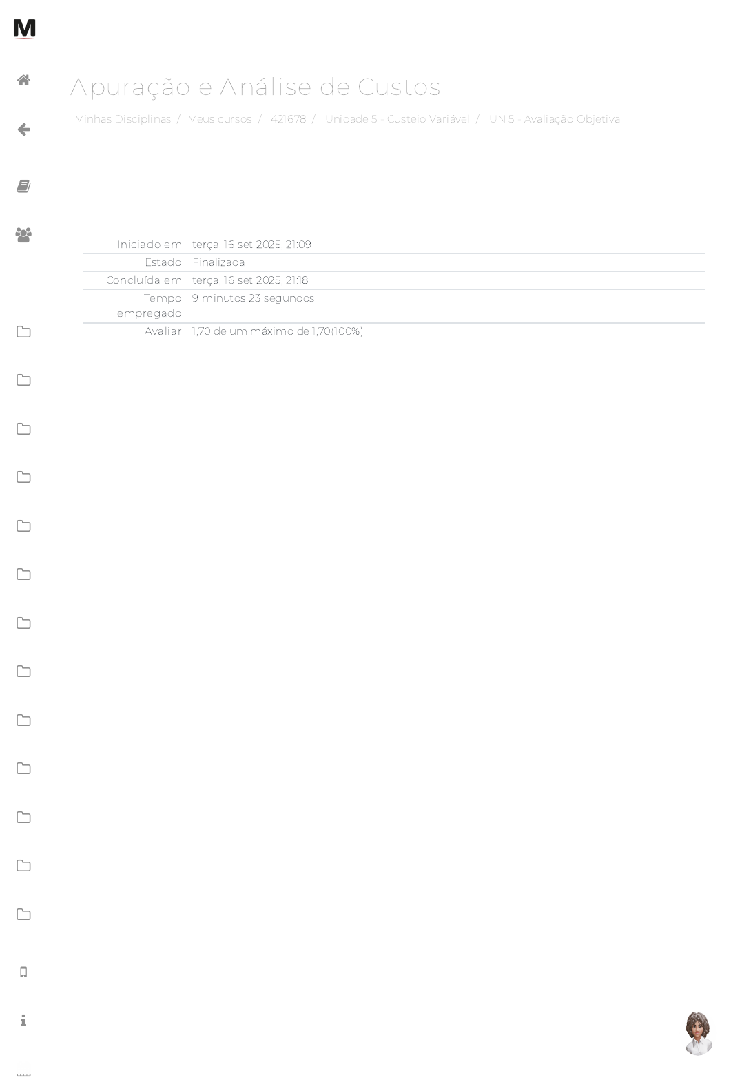 16/09/2025 21:19 UN 5 - Avaliação Objetiva: Revisão da tentativa https://avap.multivix.edu.br/mod/quiz/review.php?attempt=9238439&cmid=1974160 1/6 Minhas Disciplinas / Meus cursos / 421678 / Unidade 5 - Custeio Variável / UN 5 - Avaliação Objetiva Apuração e Análise de Custos Iniciado em terça, 16 set 2025, 21:09 Estado Finalizada Concluída em terça, 16 set 2025, 21:18 Tempo empregado 9 minutos 23 segundos Avaliar 1,70 de um máximo de 1,70(100%) https://avap.multivix.edu.br/my/ https://avap.multivix.edu.br/course/view.php?id=36792 https://avap.multivix.edu.br/course/view.php?id=36792§ion=6 https://avap.multivix.edu.br/mod/quiz/view.php?id=1974160 https://avap.multivix.edu.br/my/ https://avap.multivix.edu.br/course/view.php?id=36792 https://avap.multivix.edu.br/user/index.php?id=36792 https://avap.multivix.edu.br/course/view.php?id=36792§ion=1 https://avap.multivix.edu.br/course/view.php?id=36792§ion=2 https://avap.multivix.edu.br/course/view.php?id=36792§ion=3 https://avap.multivix.edu.br/course/view.php?id=36792§ion=4 https://avap.multivix.edu.br/course/view.php?id=36792§ion=5 https://avap.multivix.edu.br/course/view.php?id=36792§ion=6 https://avap.multivix.edu.br/course/view.php?id=36792§ion=7 https://avap.multivix.edu.br/course/view.php?id=36792§ion=8 https://avap.multivix.edu.br/course/view.php?id=36792§ion=9 https://avap.multivix.edu.br/course/view.php?id=36792§ion=10 https://avap.multivix.edu.br/course/view.php?id=36792§ion=11 https://avap.multivix.edu.br/course/view.php?id=36792§ion=12 https://avap.multivix.edu.br/course/view.php?id=36792§ion=13 https://avap.multivix.edu.br/hooks/portal/ https://avap.multivix.edu.br/mod/page/view.php?id=1252%2F%22%20target%3D%22_blank https://avap.multivix.edu.br/calendar/view.php/ https://avap.multivix.edu.br/ 16/09/2025 21:19 UN 5 - Avaliação Objetiva: Revisão da tentativa https://avap.multivix.edu.br/mod/quiz/review.php?attempt=9238439&cmid=1974160 2/6 Questão 1 Correto Atingiu 0,34 de 0,34 Leia o trecho a seguir: “[...] [No] sistema de custeio os custos são separados em �xos e variáveis, sendo considerados na avaliação de estoques os custos variáveis, com os custos �xos lançados no resultado. Trata-se de um método que tem inúmeras virtudes, principalmente no plano gerencial, por permitir uma melhor análise do desempenho da empresa, sendo um método gerencial, não considerado pela legislação tributária brasileira, sendo aceito somente o método do custo real ou absorção.” Fonte: CRUZ, J. A. W. et al. A classi�cação dos custos �xos e variáveis por meio de regressão múltipla: estudo de caso em uma cooperativa de catadores de materiais recicláveis de Curitiba – PR. Pensar Contábil, Rio de Janeiro, v. 13, n. 50, jan. /abr. 2011, p. 6. Disponível em: http://webserver.crcrj.org.br/asscom/Pensarcontabil/revistaspdf/revista50.pdf. Acesso em: 12 mar. 2020. O custeio por absorção consiste na apropriação de todos os custos – sejam eles �xos ou variáveis – à produção do período, cujos gastos não fabris são excluídos. Considerando essas informações e o conteúdo estudado, enumere de 1 a 5 o esquema básico do custeio por absorção: ( ) Apuração do resultado ( ) Apropriação dos custos diretos e indiretos na produção realizada no período ( ) Apuração do custo dos produtos vendidos ( ) Separação de custos e despesas ( ) Apuração do custo da produção acabada Agora, assinale a alternativa que apresenta a sequência correta: Escolha uma opção: 3, 1, 2, 5, 4. 2, 4, 1, 3, 5. 5, 2, 4, 1, 3. 1, 5, 3, 4, 2. 3, 1, 5, 2, 4. http://webserver.crcrj.org.br/asscom/Pensarcontabil/revistaspdf/revista50.pdf https://avap.multivix.edu.br/my/ https://avap.multivix.edu.br/course/view.php?id=36792 https://avap.multivix.edu.br/user/index.php?id=36792 https://avap.multivix.edu.br/course/view.php?id=36792§ion=1 https://avap.multivix.edu.br/course/view.php?id=36792§ion=2 https://avap.multivix.edu.br/course/view.php?id=36792§ion=3 https://avap.multivix.edu.br/course/view.php?id=36792§ion=4 https://avap.multivix.edu.br/course/view.php?id=36792§ion=5 https://avap.multivix.edu.br/course/view.php?id=36792§ion=6 https://avap.multivix.edu.br/course/view.php?id=36792§ion=7 https://avap.multivix.edu.br/course/view.php?id=36792§ion=8 https://avap.multivix.edu.br/course/view.php?id=36792§ion=9 https://avap.multivix.edu.br/course/view.php?id=36792§ion=10 https://avap.multivix.edu.br/course/view.php?id=36792§ion=11 https://avap.multivix.edu.br/course/view.php?id=36792§ion=12 https://avap.multivix.edu.br/course/view.php?id=36792§ion=13 https://avap.multivix.edu.br/hooks/portal/ https://avap.multivix.edu.br/mod/page/view.php?id=1252%2F%22%20target%3D%22_blank https://avap.multivix.edu.br/calendar/view.php/ 16/09/2025 21:19 UN 5 - Avaliação Objetiva: Revisão da tentativa https://avap.multivix.edu.br/mod/quiz/review.php?attempt=9238439&cmid=1974160 3/6 Questão 2 Correto Atingiu 0,34 de 0,34 “Ao aplicar a margem de contribuição por produto pode-se obter um resultado unitário capaz de auxiliar os gestores na tomada de decisão, e desta forma veri�car qual produto tem a maior margem de contribuição e consequentemente priorizar sua produção em função de algum fator de limitação, por exemplo.” Fonte: OLIVEIRA JUNIOR, R. Teoria das restrições: novos conceitos ou nova roupagem de antigos conceitos? In: CONGRESSO INTERNACIONAL DE CUSTOS, 9., nov. 2005, Florianópolis. Anais [...]. Florianópolis, 2005. p. 10. Disponível em: https://anaiscbc.emnuvens.com.br/anais/article/download/2133/2133. Acesso em: 2 abr. 2020. Se uma empresa tiver limitação na capacidade de produção, a decisão de incentivar ou não a produção de determinado produto deve ser pautada pelos seguintes critérios: I. O produto com maior margem de contribuição deve ser incentivado em relação ao fator de limitação. II. A empresa deve proceder à análise da margem de contribuição do mix globa
