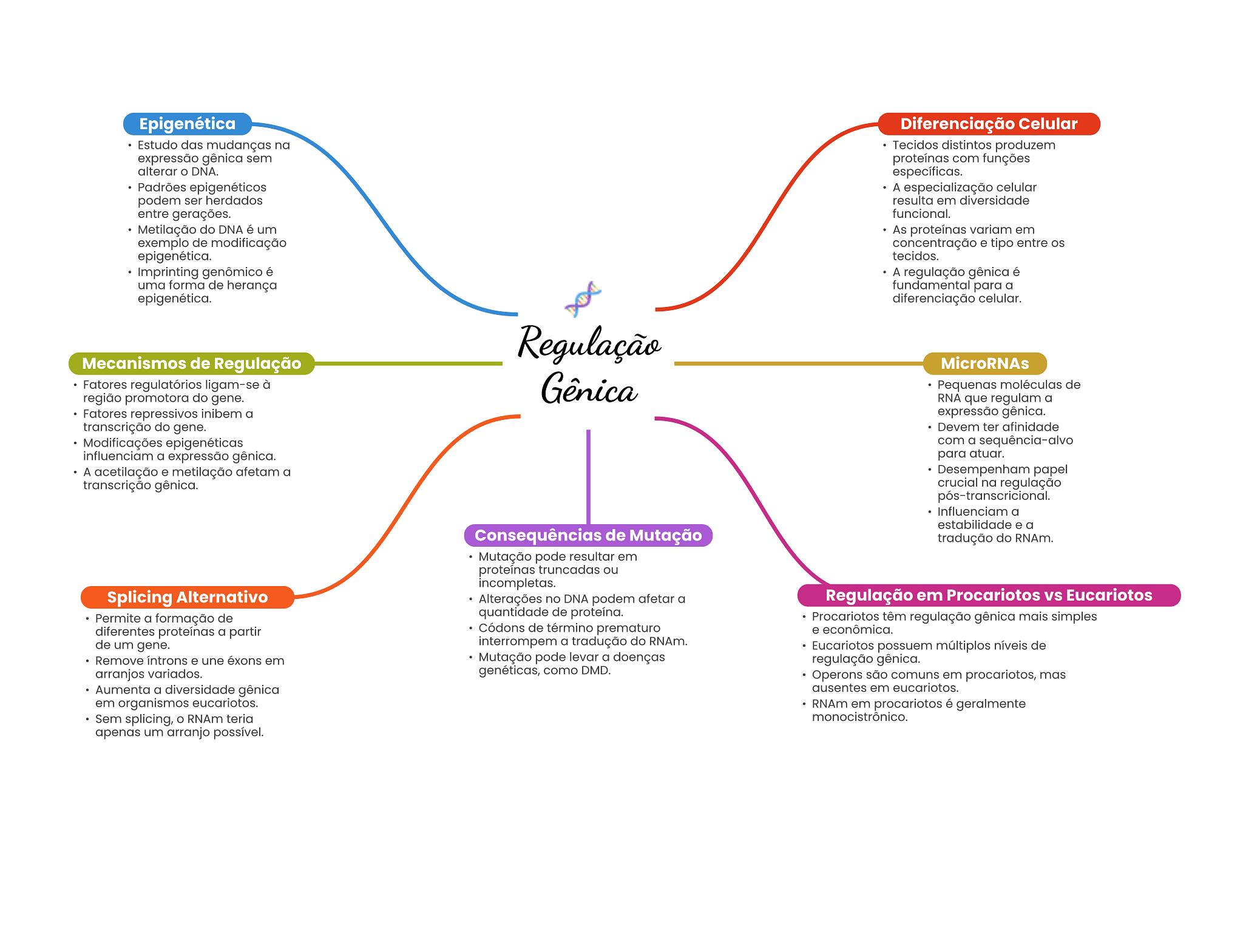 Epigenética Diferenciação Celular Estudo das mudanças na Tecidos distintos produzem expressão gênica sem proteínas com funções alterar DNA. específicas. Padrões epigenéticos A especialização celular podem ser herdados resulta em diversidade entre gerações. funcional. Metilação do DNA é um As proteínas variam em exemplo de modificação concentração e tipo entre epigenética. tecidos. Imprinting genômico é A regulação gênica é uma forma de herança fundamental para a epigenética. diferenciação celular. Regulação Mecanismos de Regulação MicroRNAs Fatores regulatórios ligam-se à região promotora do gene. Gênica Pequenas moléculas de RNA que regulam a Fatores repressivos inibem a expressão gênica. transcrição do gene. Devem ter afinidade Modificações epigenéticas com a sequência-alvo influenciam a expressão gênica. para atuar. A acetilação e metilação afetam a Desempenham papel transcrição gênica. crucial na regulação pós-transcricional. Influenciam a estabilidade e a Consequências de Mutação tradução do RNAm. Mutação pode resultar em proteínas truncadas ou incompletas. Splicing Alternativo Alterações no DNA podem afetar a Regulação em Procariotos vs Eucariotos Permite a formação de quantidade de proteína. Procariotos têm regulação gênica mais simples diferentes proteínas a partir Códons de término prematuro e econômica. de um gene. interrompem a tradução do RNAm. Eucariotos possuem múltiplos níveis de Remove introns e une éxons em Mutação pode levar a doenças regulação gênica. arranjos variados. genéticas, como DMD. Operons são comuns em procariotos, mas Aumenta a diversidade gênica ausentes em eucariotos. em organismos eucariotos. RNAm em procariotos é geralmente Sem splicing, RNAm teria monocistrônico. apenas um arranjo possível.