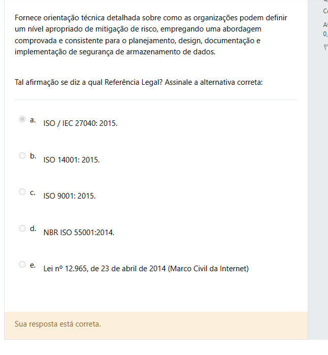 Fornece orientação técnica detalhada sobre como as organizações podem definir um apropriado de mitigação de risco, empregando uma abordagem 0, comprovada e consistente para 0 planejamento, design, documentação e implementação de segurança de armazenamento de dados. Tal afirmação se diz a qual Referência Legal? Assinale a alternativa correta: a. ISO / IEC 27040: 2015. b. ISO 14001: 2015. C. ISO 9001: 2015. d. NBR ISO 55001:2014. e. Lei n° 12.965, de 23 de abril de 2014 (Marco Civil da Internet) Sua resposta está correta.