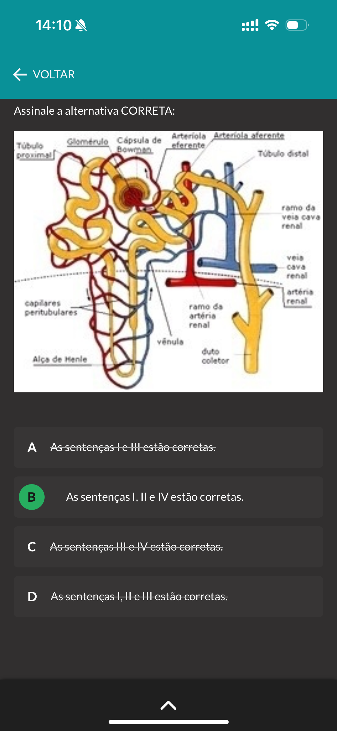 14:10 VOLTAR Assinale a alternativa CORRETA: Cápsula de Arteriola Arteriola aferente Túbulo Bowman eferente proximal Túbulo distal ramo da veia renal veia cava renal artéria capilares renal ramo da peritubulares artéria renal duto Alça de Henle coletor A As sentenças le III estão corretas. B As sentenças I, e IV estão corretas. c As sentenças III e IV estão corretas. D As sentenças III estão corretas.