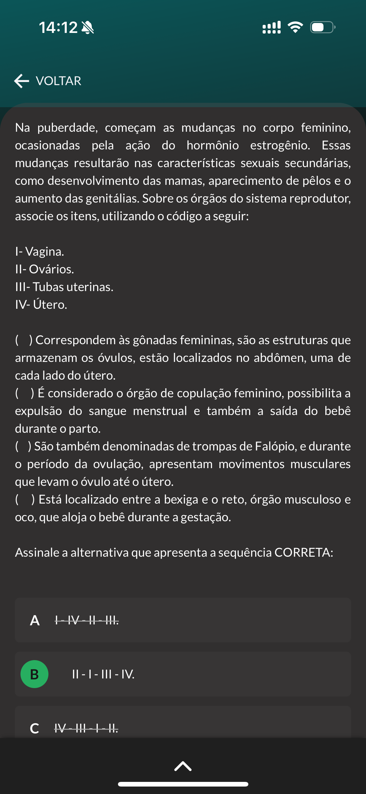 14:12 VOLTAR Na puberdade, começam as mudanças no corpo feminino, ocasionadas pela ação do hormônio estrogênio. Essas mudanças resultarão nas características sexuais secundárias, como desenvolvimento das mamas, aparecimento de pêlos e o aumento das genitálias. Sobre os órgãos do sistema reprodutor, associe os itens, utilizando código a seguir: I- Vagina. II- Ovários. III- Tubas uterinas. IV- Útero. Correspondem às gônadas femininas, são as estruturas que armazenam os óvulos, estão localizados no abdômen, uma de cada lado do útero. É considerado órgão de copulação feminino, possibilita a expulsão do sangue menstrual e também a saída do bebê durante parto. São também denominadas de trompas de Falópio, e durante o período da ovulação, apresentam movimentos musculares que levam óvulo até útero. Está localizado entre a bexiga e reto, órgão musculoso e que aloja bebê durante a gestação. Assinale a alternativa que apresenta a sequência CORRETA: B c