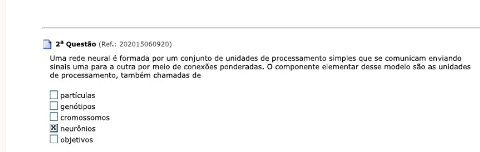 Questão (Ref.: 202015060920) Uma rede neural é formada por um conjunto de unidades de processamento simples que se comunicam enviando sinais uma para a outra por meio de conexões ponderadas. componente elementar desse modelo são as unidades de processamento, também chamadas de partículas genótipos cromossomos X neurônios objetivos