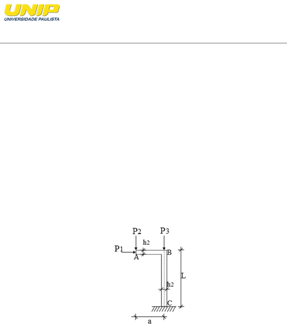 RESISTÊNCIA DOS MATERIAIS (ESTABILIDADE) Arquitetura e Urbanismo Professora: Ana Carolina Marques Página 1 de 2 LISTA DE EXERCÍCIOS 6 1. A estrutura abaixo indica um pórtico formado por duas barras, AB e BC, ambas com 20 cm de largura, feito de um material que tem resistência tanto à compressão quanto à tração de 120 kgf/cm². A altura da seção transversal da barra AB, h2, é de 40cm e a altura h2 da seção transversal da barra BC é de 50 cm, como mostra a figura. A distância a indicada na figura é de 2m e a distância L, que mostra a altura entre o eixo da carga P1 até a seção do engastamento em C é de 5m. Sabendo que os valores das cargas são os abaixo indicados, informe se a estrutura pode ser executada dentro das condições de segurança para cada um dos casos de carregamentos isolados, e justifique. Caso 1 – P1 = 0; P2 = 2 tf; P3 = 10 tf Caso 2 – P1 = 8 tf; P2 = 2 tf; P3 = 40 tf Figura 1: Esquema da estrutura. R: Caso 1 – é possível; Caso 2 – não é possível 2. Sabendo que a coluna da figura abaixo tem seção circular com 120 cm de diâmetro, verificar se a mesma pode ser executada para suportar esses esforços, com um material que tem tensão resistente de 70 kgf/cm². Dados: - seção transversal circular, A= π D² /4; I= π D4 /64; P1 = 30tf; P2 = 12tf RESISTÊNCIA DOS MATERIAIS (ESTABILIDADE) Arquitetura e Urbanismo Professora: Ana Carolina Marques Página 2 de 2 Figura 2: Esquema da estrutura. R: É possível executar. 3. A estrutura mostrada se trata de um pilar engastado e uma viga. Sabendo que a seção transversal do pilar e da viga estão conforme detalhados na figura 3, determina a tensão máxima e mínima que atuam tanto no pilar quanto na viga. Dado: q = 10kN/m P1 = 60kN P2 = 30kN L1 = 3,70m L2 = 1,40m bv = 20cm hv = 40cm bp = 60cm hp = 80cm Figura 3: Esquema da estrutura. R: viga = 17,2MPa, viga = -18,0MPa, pilar = 0,2MPa,pilar = -0,4MPa