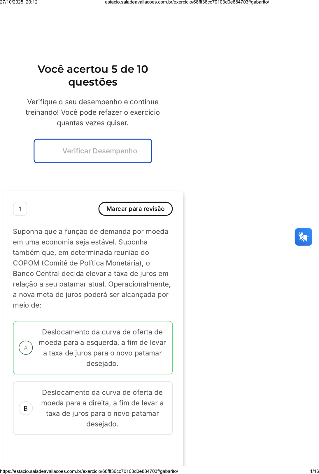 Você acertou 5 de 10 questões Verifique o seu desempenho e continue treinando! Você pode refazer o exercício quantas vezes quiser. Verificar Desempenho A B 1 Marcar para revisão Suponha que a função de demanda por moeda em uma economia seja estável. Suponha também que, em determinada reunião do COPOM (Comitê de Política Monetária), o Banco Central decida elevar a taxa de juros em relação a seu patamar atual. Operacionalmente, a nova meta de juros poderá ser alcançada por meio de: Deslocamento da curva de oferta de moeda para a esquerda, a fim de levar a taxa de juros para o novo patamar desejado. Deslocamento da curva de oferta de moeda para a direita, a fim de levar a taxa de juros para o novo patamar desejado. 27/10/2025, 20:12 estacio.saladeavaliacoes.com.br/exercicio/68fff36cc70103d0e884703f/gabarito/ https://estacio.saladeavaliacoes.com.br/exercicio/68fff36cc70103d0e884703f/gabarito/ 1/16 C D E Deslocamento da curva de demanda de moeda para a esquerda, a fim de levar a taxa de juros para o novo patamar desejado. Deslocamento da curva de demanda de moeda para a direita, a fim de levar a taxa de juros para o novo patamar desejado. Manutenção nos mesmos níveis da curva de demanda e oferta de moeda, a fim de levar a taxa de juros para o novo patamar desejado. Resposta incorreta Opa! A alternativa correta é a letra A. Confira o gabarito comentado! Gabarito Comentado Para elevar a taxa de juros, o Banco Central precisa reduzir a oferta de moeda na economia. Isso é feito através do deslocamento da curva de oferta de moeda para a esquerda. Com menos moeda disponível, o custo para obtê-la (ou seja, a taxa de juros) aumenta. Neste caso, como a demanda por moeda é estável, sua curva não se altera. Portanto, a alternativa correta é a A: "Deslocamento da curva de oferta de moeda para a esquerda, a fim de levar a taxa de juros para o novo patamar desejado". 27/10/2025, 20:12 estacio.saladeavaliacoes.com.br/exercicio/68fff36cc70103d0e884703f/gabarito/ https://estacio.saladeavaliacoes.com.br/exercicio/68fff36cc70103d0e884703f/gabarito/ 2/16 A B C D E 2 Marcar para revisão Cabe ao Banco Central o controle da base monetária. A respeito desse tema, avalie as proposições a seguir: I. A base monetária é o mesmo que o total de reservas que são mantidas pelos bancos comerciais. II. Uma das formas de manter essas reservas é em caixa dos bancos, sendo esses valores mantidos em uma razão caixa/depósitos à vista constante, que seja considerada segura. III. Os encaixes no Banco Central podem ser voluntários ou compulsórios, em geral existem os dois tipos. Está (ão) correta(s): I e II. I e III. II e III. Somente I. Somente II. Resposta correta Parabéns, você selecionou a alternativa correta. Confira o gabarito comentado! Gabarito Comentado 27/10/2025, 20:12 estacio.saladeavaliacoes.com.br/exercicio/68fff36cc70103d0e884703f/gabarito/ https://estacio.saladeavaliacoes.com.br/exercicio/68fff36cc70103d0e884703f/gabarito/ 3/16 A B As afirmativas II e III estão corretas. A base monetária não é o mesmo que o total de reservas mantidas pelos bancos comerciais, como afirma a proposição I, mas sim a soma do total de papel-moeda em poder do público e o total de reservas mantidas pelos bancos comerciais. As reservas podem ser mantidas de duas formas: na caixa do próprio banco comercial ou em encaixes depositados junto ao Banco Central, como mencionado na proposição II. Além disso, como afirmado na proposição III, os encaixes no Banco Central podem ser voluntários ou compulsórios, e geralmente existem os dois tipos. 3 Marcar para revisão Suponha que a função de demanda por moeda em uma economia seja estável. Suponha também que, em determinada reunião do COPOM (Comitê de Política Monetária), o Banco Central decida baixar a taxa de juros em relação a seu patamar atual. Operacionalmente, a nova meta de juros poderá ser alcançada por meio de: Compra de títulos públicos no mercado, reduzindo a base monetária. Compra de títulos interbancários, reduzindo a base monetária. 27/10/2025, 20:12 estacio.saladeavaliacoes.com.br/exercicio/68fff36cc70103d0e884703f/gabarito/ https://estacio.saladeavaliacoes.com.br/exercicio/68fff36cc70103d0e884703f/gabarito/ 4/16 C D E Compra de moeda estrangeira no mercado, ampliando as reservas internacionais. Venda de moeda estrangeira no mercado, reduzindo a base monetária. Compra de títulos públicos no mercado, ampliando a oferta de moeda. Resposta incorreta Opa! A alternativa correta é a letra E. Confira o gabarito comentado! Gabarito Comentado Considerando uma demanda por moeda estável, a redução da taxa de juros implica em um aumento da base monetária. Para que isso ocorra, o Banco Central deve comprar títulos públicos, o que resulta em um aumento da liquidez no mercado. Portanto, a alternativa correta é a E, que afirma que a nova meta de juros pode ser alcançada através da compra de títulos públicos no mercado, ampliando a oferta de moeda. 4 Marcar para revisão O Banco Central é responsável por controlar a base monetária, ampliando-a ou reduzindo-a de acordo com seus objetivos de política monetária. Sobre base monetária, analise as afirmativas: 27/10/2025, 20:12 estacio.saladeavaliacoes.com.br/exercicio/68fff36cc70103d0e884703f/gabarito/ https://estacio.saladeavaliacoes.com.br/exercicio/68fff36cc70103d0e884703f/gabarito/ 5/16 A B C D E I. A base monetária é igual ao papel moeda em poder do público mais os encaixes totais de reserva. II. A base monetária diz respeito somente aos recursos emitidos pelo Banco Central. III. O conceito de base monetária é igual, em termos quantitativos, ao de M1. Assinale a alternativa que indica as afirmativas corretas. I e II, apenas. I e III, apenas. II e III, apenas. III, apenas. I, II e III. Resposta incorreta Opa! A alternativa correta é a letra A. Confira o gabarito comentado! Gabarito Comentado A base monetária é um conceito mais restrito, em termos quan
