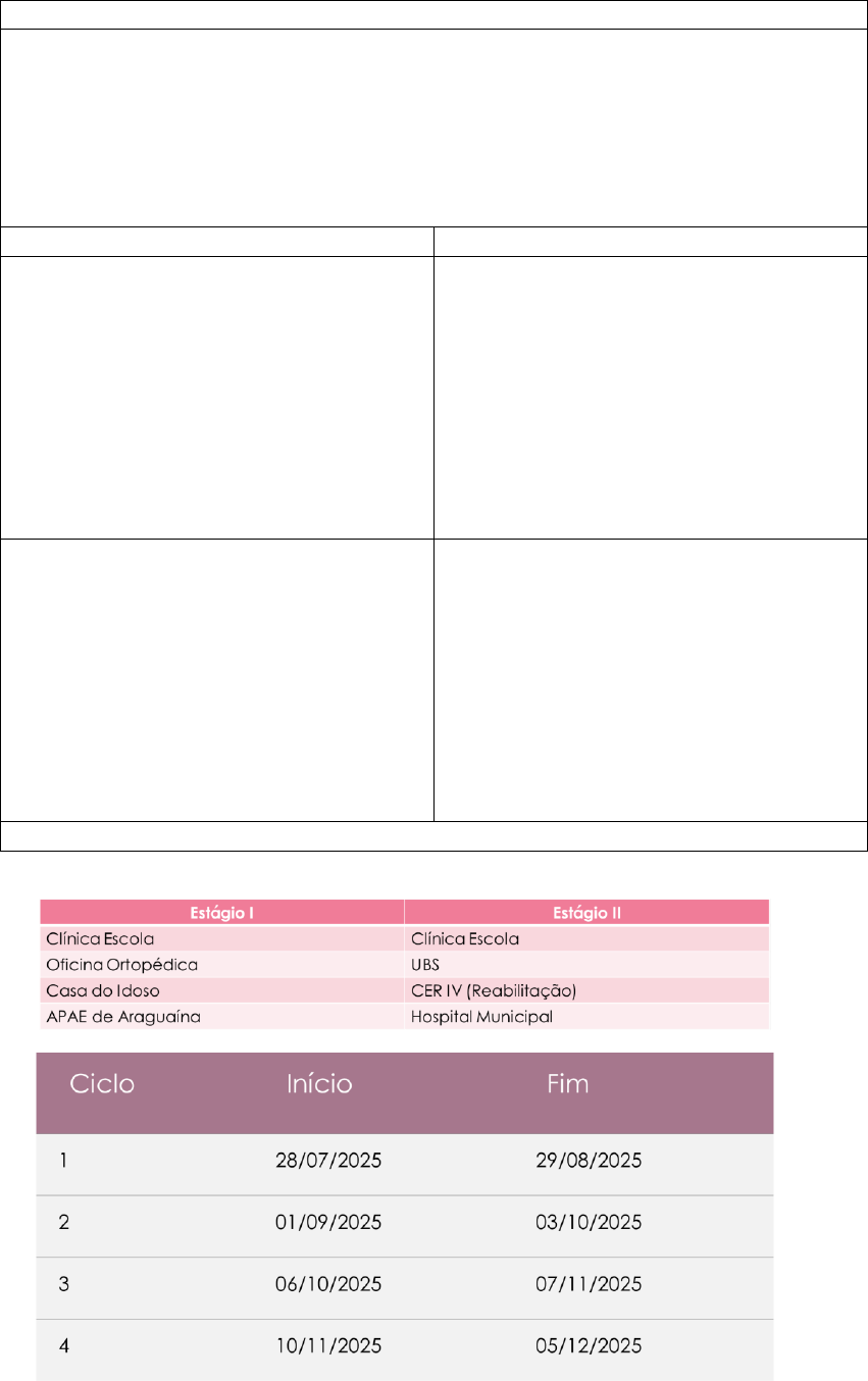 SEMANA DE INTEGRAÇÃO – ESTÁGIO SUPERVISIONADO 21/07/2025 19:00 Abertura e Alinhamento Institucional Boas-vindas e objetivos do estágio (Coordenação do curso – Ana Cléia) Apresentação do cronograma, locais e regras Palestra: "O papel do estagiário no processo de cuidado: limites e responsabilidades" (Prof. Maurílio Carrias) Dinâmica de integração entre alunos e preceptores ESTÁGIO I ESTÁGIO 2 22/07/2025 08:00 - Abordagem fisioterapêutica em crianças com atraso no desenvolvimento motor (Preceptora Letícia) 10:00 – Condutas fisioterapêuticas nas disfunções musculoesqueléticas mais frequentes em ambulatórios (Preceptora Karoline) 22/07/2025 08:00 - Fisioterapia Pediátrica: Abordagens Respiratórias e Motoras para o Cuidado Integral (Preceptora Alícia) 10:00 - Segurança, Documentação e Comunicação (Preceptor Maurílio) 24/07/2025 08:00 Avaliação Multidimensional do Idoso e Registro em Prontuário: Cuidar, Compreender e Documentar (Preceptora Fran) 10:00- Segurança, Documentação e Comunicação (Preceptor Maurílio) 24/07/2025 08:00 - Fisioterapia na Atenção Primária: O que é esperado do estagiário na UBS? (Preceptor Hermon) 10:00 - Reabilitação Cardiopulmonar Baseada em Evidências: Funcionalidade e Qualidade de Vida ENCERRAMENTO