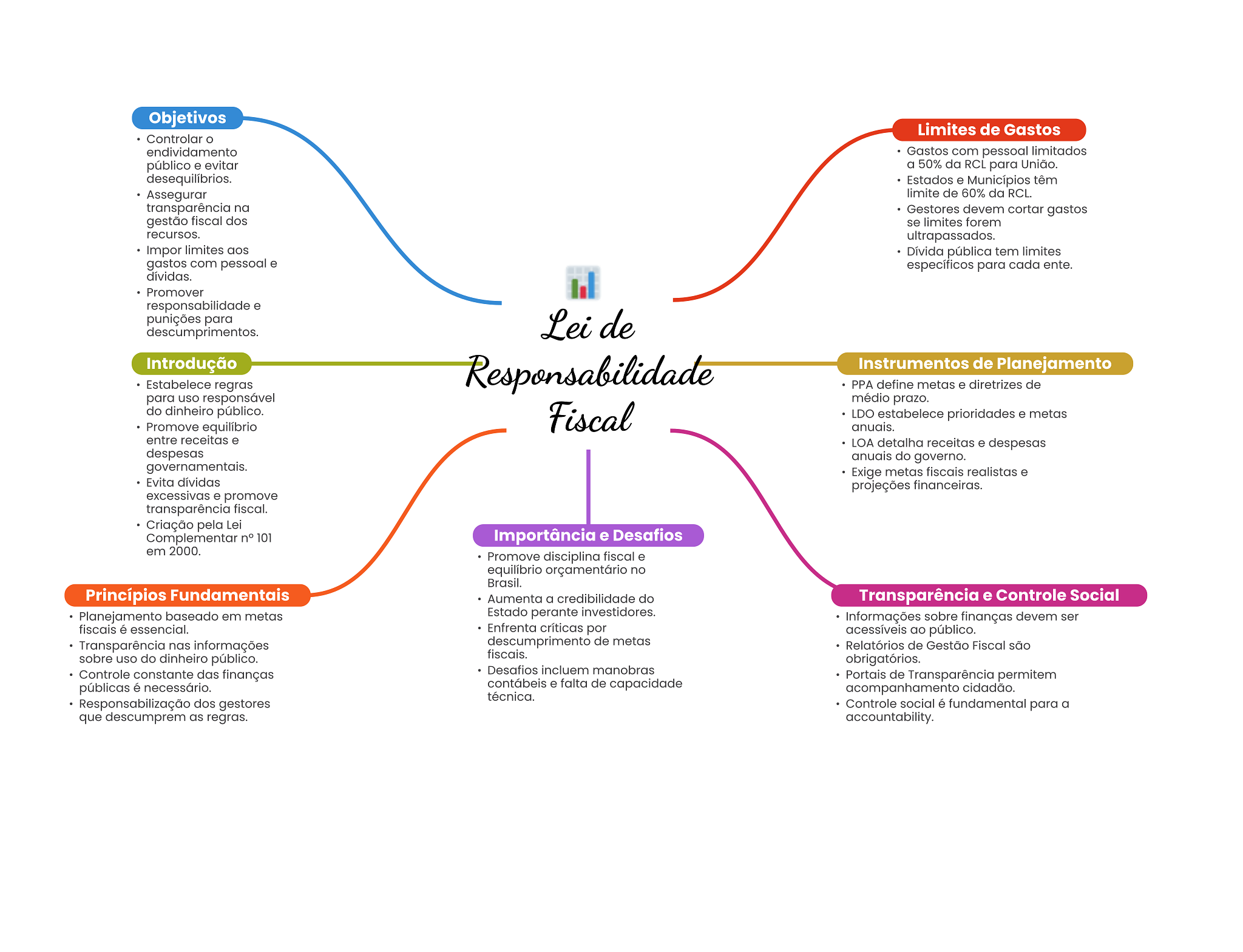 Objetivos Limites de Gastos Controlar endividamento Gastos com pessoal limitados público e evitar a 50% da RCL para União. desequilibrios. Estados e Municípios têm Assegurar limite de 60% da RCL. transparência na Gestores devem cortar gastos gestão fiscal dos se limites forem recursos. ultrapassados. Impor limites aos Dívida pública tem limites gastos com pessoal e específicos para cada ente. dívidas. Promover responsabilidade e punições para descumprimentos. Leide Introdução Responsabilidade Instrumentos de Planejamento Estabelece regras PPA define metas e diretrizes de para uso responsável médio prazo. do dinheiro público. Promove equilíbrio Fiscal LDO estabelece prioridades e metas anuais. entre receitas e LOA detalha receitas e despesas despesas anuais do governo. governamentais. Exige metas fiscais realistas e Evita dívidas projeções financeiras. excessivas e promove transparência fiscal. Criação pela Lei Complementar n° 101 Importância e Desafios em 2000. Promove disciplina fiscal e equilíbrio orçamentário no Brasil. Princípios Fundamentais Aumenta a credibilidade do Transparência e Controle Social Planejamento baseado em metas Estado perante investidores. Informações sobre finanças devem ser fiscais é essencial. Enfrenta críticas por acessíveis ao público. Transparência nas informações descumprimento de metas Relatórios de Gestão Fiscal são sobre uso do dinheiro público. fiscais. obrigatórios. Controle constante das finanças Desafios incluem manobras Portais de Transparência permitem públicas é necessário. contábeis e falta de capacidade acompanhamento cidadão. técnica. Responsabilização dos gestores Controle social é fundamental para a que descumprem as regras. accountability.