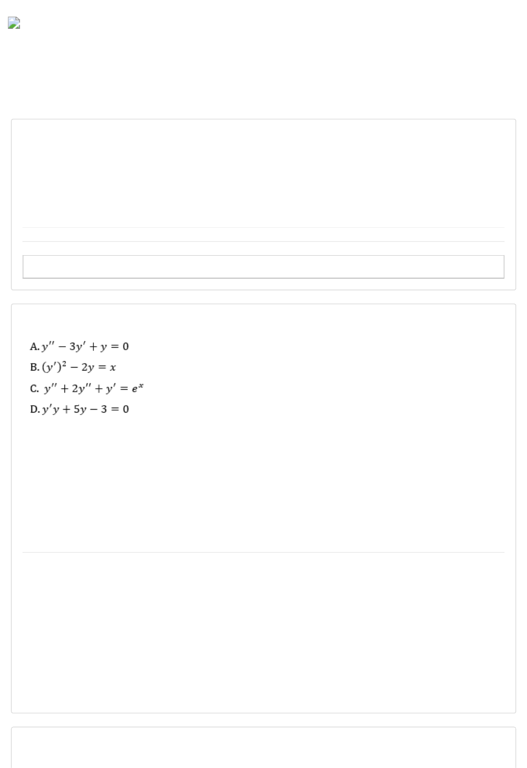 Cálculo Diferencial e Integral III (/aluno/timel… Av2 - Cálculo Diferencial e Integral III Colaborar (/notific Informações Adicionais Período: 05/08/2024 00:00 à 09/09/2024 23:59 Situação: Tentativas: 0 / 3 Acessar atividade (/aluno/avaliacao/form/3839427402?atividadeDisciplinaId=16894976) 1) a) b) c) d) e) 2) Considere as equações diferenciais ordinárias destacadas no que segue: A respeito dessas equações, analise as seguintes afirmações: I. As equações A e B podem ser classificadas como equações diferenciais ordinárias lineares. II. As equações B e D podem ser classificadas como equações diferenciais ordinárias de primeira ordem. III. As equações C e D podem ser classificadas como equações diferenciais ordinárias não lineares. IV. As equações A e C podem ser classificadas como equações diferenciais ordinárias de segunda ordem. Está correto o que se afirma apenas em: Alternativas: I e II. I e III. II e IV. I, II e III. II, III e IV. https://www.colaboraread.com.br/aluno/timeline/index/3839427402?ofertaDisciplinaId=2239916 https://www.colaboraread.com.br/aluno/timeline/index/3839427402?ofertaDisciplinaId=2239916 https://www.colaboraread.com.br/notificacao/index https://www.colaboraread.com.br/notificacao/index https://www.colaboraread.com.br/notificacao/index https://www.colaboraread.com.br/aluno/avaliacao/form/3839427402?atividadeDisciplinaId=16894976 Jovane Realce a) b) c) d) e) 3) a) b) c) d) e) 4) O estudo de derivadas e integrais de funções reais é essencial para entender as equações diferenciais ordinárias e identificar as estratégias de solução, já que essas equações são frequentemente usadas na modelagem e resolução de problemas reais. Considere a equação diferencial ordinária y’ = 2x – 4. Qual é a solução para a equação apresentada? Alternativas: x² - 4 2x² - 4 + C x - 2 + C x² - 4x + C 2x² - 4 + Cx As transformadas de Laplace, entre outras aplicações, podem ser utilizadas para resolver problemas de valor inicial (PVIs) vinculados a equações diferenciais ordinárias. Para o caso dos problemas com equações diferenciais de segunda ordem são consideradas as seguintes expressões: Nesse sentido, seja o problema de valor inicial envolvendo uma equação diferencial ordinária de segunda ordem definido por: Empregando as transformadas de Laplace para a resolução do problema, assinale a alternativa que indica corretamente a solução que pode ser obtida para o PVI apresentado: Alternativas: Podemos usar problemas de valores iniciais e de contorno para modelar e resolver questões relacionadas, por exemplo, às taxas de variação de funções reais. Jovane Realce Jovane Realce Jovane Realce a) b) c) d) e) 5) a) b) c) d) e) Suponha que em determinado trajeto um móvel esteja a uma velocidade dada pela seguinte função v(t) = 3x² + 2, com tempo medido em segundos e posição dada em metros. Qual é a função posição s(t) desse móvel, sabendo que no tempo 2 segundos ele está na posição 20 metros? Alternativas: s(t) = x² + 2x + 4 s(t) = 3x² + 22 s(t) = 2x² + 20x + 4 s(t) = 3x² - 20x + 6 s(t) = x³ + 2x + 8 As equações diferenciais ordinárias são usadas na modelagem e resolução de problemas reais, frequentemente submetidos a simplificações. Para resolver essas equações, é fundamental classificá-las, identificando a estratégia de solução mais adequada. Diante desse tema, considere a equação diferencial ordinária y’’ - 2y’ + y = 0. Assinale a alternativa que indica a solução para a equação apresentada: Alternativas: y(x) = C e + C xe y(x) = C e + C xe y(x) = C e + C e y(x) = C e + C e y(x) = C e + C x 1 x 2 x 1 2x 2 2x 1 2x 2 -2x 1 x 2 -x 1 x 2 Jovane Realce Jovane Realce