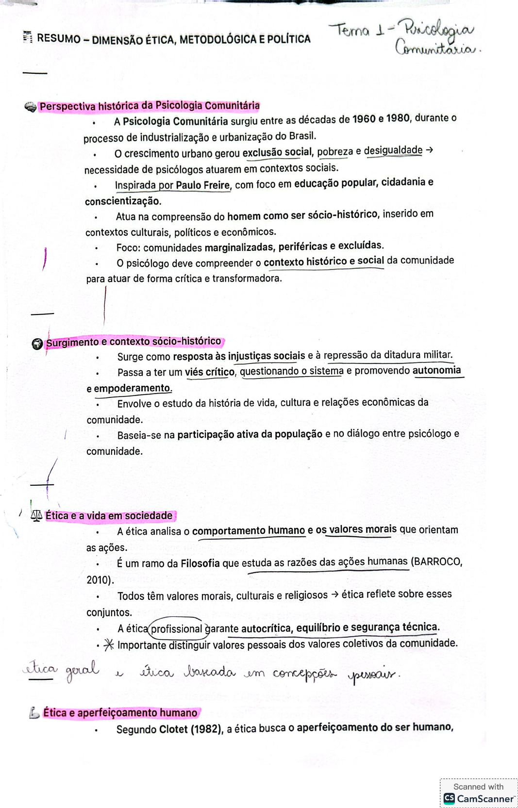 RESUMO DIMENSÃO ÉTICA, METODOLÓGICA E POLÍTICA Tema 1 Perspectiva histórica da Psicologia Comunitária A Psicologia Comunitária surgiu entre as décadas de 1960 e 1980, durante processo de industrialização e urbanização do Brasil. crescimento urbano gerou exclusão social, pobreza e desigualdade necessidade de psicólogos atuarem em contextos sociais. Inspirada por Paulo Freire, com foco em educação popular, cidadania e conscientização. Atua na compreensão do homem como ser sócio-histórico, inserido em contextos culturais, políticos e econômicos. Foco: comunidades marginalizadas, periféricas e excluídas. psicólogo deve compreender o contexto histórico e social da comunidade para atuar de forma crítica e transformadora. Surgimento e contexto sócio-histórico Surge como resposta às injustiças sociais e à repressão da ditadura militar. Passa a ter um viés crítico, questionando o sistema e promovendo autonomia e empoderamento. Envolve o estudo da história de vida, cultura e relações econômicas da comunidade. Baseia-se na participação ativa da população e no diálogo entre psicólogo e comunidade. Ética e a vida em sociedade A ética analisa comportamento humano e os valores morais que orientam as ações. É um ramo da Filosofia que estuda as razões das ações humanas (BARROCO, 2010). Todos têm valores morais, culturais e religiosos -> ética reflete sobre esses conjuntos. A ética profissional garante autocrítica, equilíbrio e segurança técnica. Importante distinguir valores pessoais dos valores coletivos da comunidade. etica geral ética baseada Ética e aperfeiçoamento humano Segundo Clotet (1982), a ética busca aperfeiçoamento do ser humano, Scanned with CS CamScannerCamScanner Scanned with tornando-o mais justo e consciente. A ética promove autorrealização e dignidade. Para psicólogo, significa atuar com justiça social, respeito e igualdade. Ética = crescimento pessoal e profissional. Ética e a atuação profissional psicólogo deve separar seus valores pessoais dos valores da comunidade. A ética garante uma atuação segura, técnica e respeitosa. Segundo Elizete Passos (2007), a ética profissional é a aplicação dos valores humanos no exercício da profissão detalhando psicólogo deve registrar o processo de trabalho, refletir e adaptar metodologias conforme necessário. A ética se relaciona à vida pessoal, social e política mas o foco aqui é a ética profissional. Ética e respeito às diferenças Reconhecer cada indivíduo como único e diverso. psicólogo deve respeitar valores culturais, religiosos e políticos da comunidade. A prática ética inclui escuta, diálogo e não julgamento. profissional deve manter isenção e não impor suas crenças. Ética e respeito garantem confiança, vínculo e eficácia na atuação comunitária. Políticas públicas no Brasil São ações, programas e planos do governo para resolver problemas sociais e garantir direitos básicos (PIRES, 2008). Envolvem níveis municipal, estadual e federal (ex: SUS, SUAS, Educação). Podem incluir parcerias com entidades privadas e ONGs (BUCCI, 2006). Objetivo: promover justiça social e cidadania. Devem ser planejadas e avaliadas com critérios técnicos e éticos. psicólogo e as políticas públicas Atua em unidades de saúde, CAPS, escolas, abrigos, ONGs, CRAS e CREAS. Atende mulheres vítimas de violência, dependentes químicos, idosos, crianças em risco, etc.Necessita de conhecimentos interdisciplinares (Direito, Sociologia, Educação, Política). Desafios: Massificação dos atendimentos. Falta de autonomia e liberdade criativa. Excesso de burocracia. CREPOP (2006) oferece diretrizes para atuação ética e técnica nas políticas públicas. Psicologia sócio-histórica e as relações sociais Baseada em Vygotsky: o ser humano se forma nas relações sociais. A atuação do psicólogo deve considerar contexto político, histórico e cultural. Busca compreender sujeito dentro da sociedade, e não isoladamente. A prática do psicólogo envolve analisar interesses e projetos da comunidade e dos órgãos públicos. Atuação do psicólogo em políticas públicas Atua com assistência, prevenção e promoção da saúde mental e social. Intervém em: Casos de violência, vulnerabilidade, exclusão social. Projetos comunitários e educativos. Deve manter: Postura ética e sensível. Planejamento e metodologias adequadas. Diálogo com outros profissionais e instituições. PSi mediador e Identificação dos problemas sociais psicólogo ajuda a comunidade a reconhecer e compreender suas próprias dificuldades. A população deve participar ativamente no diagnóstico dos problemas. Perguntas norteadoras: que pretendemos com essa abordagem? Qual principal desafio dessa comunidade? Que resultado queremos alcançar? psicólogo não é militante político, mas mediador e facilitador da transformação social. Scanned with CS CamScannerAbordagem metodológica do psicólogo comunitário Primeira etapa: identificar 0 "tecido psicossocial" (SOUZA, 2006) laços que unem a comunidade. Metodologia = planejamento + técnicas de ação (MATTAR, 2005). psicólogo deve registrar observações, impressões e dados sobre grupo. Metodologia flexível, podendo ser ajustada conforme andamento da pesquisa. Pesquisa-participante e inserção na comunidade Criada por Bronislaw Malinowski (antropólogo) nas Trobriand. Objetivo: entender grupo de dentro participando da realidade estudada. Base da metodologia da psicologia comunitária: escuta, diálogo e troca de saberes. psicólogo se insere na comunidade, ouve histórias, valores e experiências, construindo conhecimento conjunto. Montagem da pesquisa-participante 1. Definir objeto e objetivos que e por que estudar. 2. Levantar hipóteses ideias que podem ser confirmadas ou refutadas. 3. Realizar entrevistas e observações -> ouvir e dar voz à comunidade. 4. Criar um cronograma de atuação -> organizar etapas e a