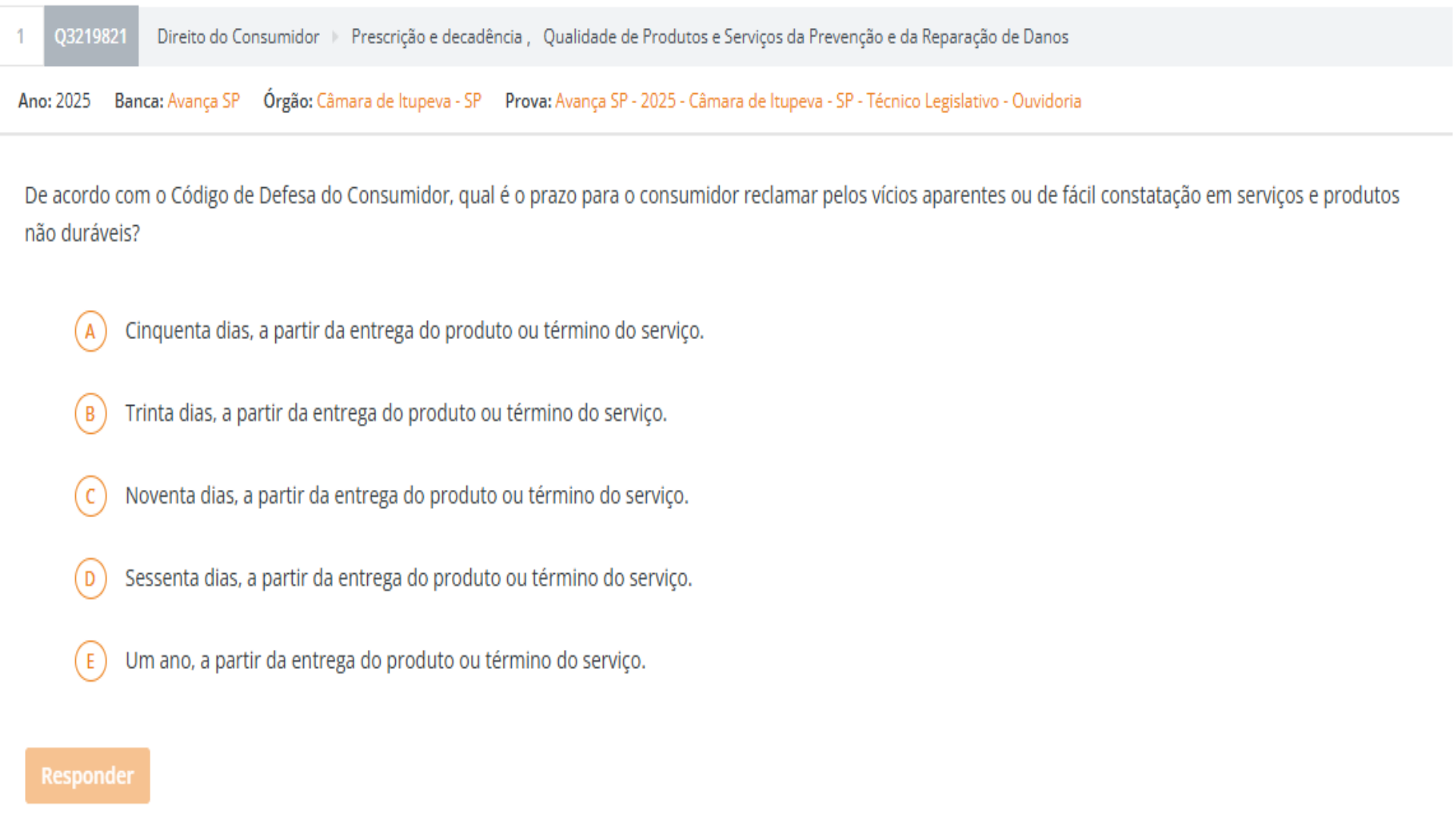 1 Q3219821 Direito do Consumidor Prescrição e Qualidade de Produtos e Serviços da Prevenção e da Reparação de Danos Ano: 2025 Banca: Avança SP Órgão: Câmara de Itupeva SP Prova: Avança SP 2025 Câmara de Itupeva SP Técnico Legislativo Ouvidoria De acordo com Código de Defesa do Consumidor, qual é 0 prazo para 0 consumidor reclamar pelos vícios aparentes ou de fácil constatação em serviços e produtos não duráveis? A Cinquenta dias, a partir da entrega do produto ou término do serviço. B Trinta dias, a partir da entrega do produto ou término do serviço. Noventa dias, a partir da entrega do produto ou término do serviço. D Sessenta dias, a partir da entrega do produto ou término do serviço. E Um ano, a partir da entrega do produto ou término do serviço. Responder1 Q3219821 Direito do Consumidor Prescrição e decadência Qualidade de Produtos e Serviços da Prevenção e da Reparação de Danos Ano: 2025 Banca: Avança SP Órgão: Câmara de Itupeva SP Prova: Avança SP 2025 Câmara de Itupeva SP Técnico Legislativo Ouvidoria De acordo com Código de Defesa do Consumidor, qual é 0 prazo para 0 consumidor reclamar pelos vícios aparentes ou de fácil constatação em serviços e produtos não duráveis? A Cinquenta dias, a partir da entrega do produto ou término do serviço. B Trinta dias, a partir da entrega do produto ou término do serviço. Noventa dias, a partir da entrega do produto ou término do serviço. D Sessenta dias, a partir da entrega do produto ou término do serviço. E Um ano, a partir da entrega do produto ou término do serviço. Responder Parabéns! Você acertou!12 de Março de 2025 às 09:36 GABARITO Art. 26. direito de reclamar pelos VÍCIOS APARENTES ou de FÁCIL CONSTATAÇÃO caduca em: I - 30 DIAS, tratando-se de fornecimento de serviço e de produtos não duráveis; - 90 DIAS, tratando-se de fornecimento de serviço e de produtos duráveis. § 1° Inicia-se a contagem do prazo decadencial a partir da entrega efetiva do produto ou do término da execução dos serviços. Gostei (16) Respostas (0) Reportar abuso2 Q3152283 Direito do Consumidor Proteção Contratual do Consumidor Direitos Básicos do Consumidor Prescrição e decadência (+ assuntos) Ano: 2025 Banca: Unesc Órgão: Prefeitura de Maracajá SC Prova: Unesc 2025 Prefeitura de Maracajá SC Fiscal em Vigilância Sanitária Código do consumidor, dispõe sobre a proteção do consumidor e dá outras providências. De acordo com 0 Código do consumidor, marque a alternativa INCORRETA: A As cláusulas contratuais serão interpretadas de maneira mais favorável ao consumidor. fornecedor não poderá colocar no mercado de consumo produto ou serviço que sabe ou deveria saber apresentar alto grau de nocividade ou B periculosidade à saúde ou segurança. direito de reclamar pelos vícios aparentes ou de fácil constatação caduca em 10 dias, tratando-se de fornecimento de serviço e de produtos não duráveis. D A ignorância do fornecedor sobre os vícios de qualidade por inadequação dos produtos e serviços não 0 exime de responsabilidade. Responder2 Q3152283 Direito do Consumidor Proteção Contratual do Consumidor, Direitos Básicos do Prescrição e decadência (+ assuntos) Ano: 2025 Banca: Unesc Órgão: Prefeitura de Maracajá SC Prova: Unesc 2025 Prefeitura de Maracajá SC - Fiscal em Vigilância Sanitária Código do consumidor, dispõe sobre a proteção do consumidor e dá outras providências. De acordo com 0 Código do consumidor, marque a alternativa INCORRETA: A As cláusulas contratuais serão interpretadas de maneira mais favorável ao consumidor. fornecedor não poderá colocar no mercado de consumo produto ou serviço que sabe ou deveria saber apresentar alto grau de nocividade ou B periculosidade à saúde ou segurança. 0 direito de reclamar pelos vícios aparentes ou de fácil constatação caduca em 10 dias, tratando-se de fornecimento de serviço e de produtos não duráveis. D A ignorância do fornecedor sobre os vícios de qualidade por inadequação dos produtos e serviços não 0 exime de responsabilidade. Responder Parabéns! Você acertou!08 de Fevereiro de 2025 às 08:58 Gabarito CDC Art. 26. direito de reclamar pelos vícios aparentes ou de fácil constatação caduca em: trinta dias, tratando-se de fornecimento de serviço e de produtos não duráveis; - noventa dias, tratando-se de fornecimento de serviço e de produtos duráveis. 30 dias => no caso de serviço ou produto NÃO durável; 90 dias => no caso de serviço ou produto durável. Gostei (6) Respostas (0) Reportar abuso4 Q3245059 Direito do Consumidor Prescrição e decadência Ano: 2024 Banca: VUNESP Órgão: SAAE de Aparecida SP Prova: VUNESP 2024 SAAE de Aparecida - SP Ouvidor De acordo com Código de Defesa do Consumidor, 0 direito de reclamar pelos vícios aparentes ou de fácil constatação de produtos não duráveis caduca em A 7 dias. 15 dias. 30 dias. D 60 dias. E 90 dias. Responder4 Q3245059 Direito do Consumidor Prescrição e decadência Ano: 2024 Banca: VUNESP Órgão: SAAE de Aparecida SP Prova: VUNESP - 2024 SAAE de Aparecida - SP - Ouvidor De acordo com 0 Código de Defesa do Consumidor, 0 direito de reclamar pelos vícios aparentes ou de fácil constatação de produtos não duráveis caduca em A 7 dias. B 15 dias. 30 dias. D 60 dias. E 90 dias. Responder Parabéns! Você acertou!1 Q3278813 Direito do Consumidor Qualidade de Produtos e Serviços da Prevenção e da Reparação de Danos Responsabilidade Civil pelo Fato do Produto Ano: 2025 Banca: IBADE Órgão: UNIVESP Prova: IBADE - 2025 UNIVESP Advogado Quanto à responsabilidade pelo fato do produto e do serviço, 0 Código de Defesa do Consumidor prevê que: comerciante não será responsabilizado por fato do produto quando fabricante, construtor, 0 produtor ou 0 importador não puderem ser A identificados. produto é considerado defeituoso pelo fato de outro de melhor qualidade ter sido colocado no mercado. for