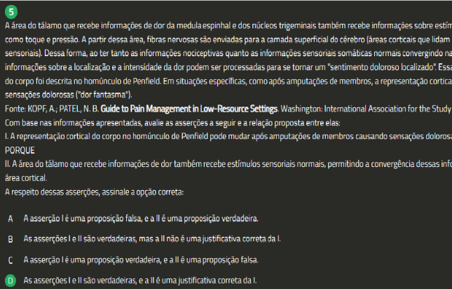 5 A area do que recebe informações de dor da medula espinhal e dos trigeminais também recebe informações sobre estim como toque e pressão. A partir dessa fibras nervosas são enviadas para a camada superficial do (áreas corticais que lidam sensoriais). Dessa forma, ao ter tanto as informações nociceptivas quanto as informações sensoriais normais convergindo na informações sobre a localização e a intensidade da dor podem ser processadas para se tornar um "sentimento doloroso localizado". Essa do corpo foi descrita no homunculo de Penfield. Em situações como amputações de membros, a representação cortica sensações dolorosas ("dor Fonte: KOPF, A.; PATEL, N.B. Guide to Pain Management in Low-Resource Washington: International Association for the Study Com base nas informações apresentadas, avalie as asserções a seguir e a relação proposta entre elas: A representação cortical do corpo no de Penfield pode mudar após amputações de membros causando sensações PORQUE II. A do que recebe informações de dor também recebe estímulos sensoriais normais, permitindo a convergência dessas info cortical. A respeito dessas asserções, assinale a opção correta: A A asserção uma proposição falsa, e a II é uma proposição verdadeira. B As asserções I e são verdadeiras, mas a II não uma justificativa correta da I. C A asserção lé uma proposição verdadeira, e a II uma proposição D As asserções e são verdadeiras, e a II uma justificativa correta da