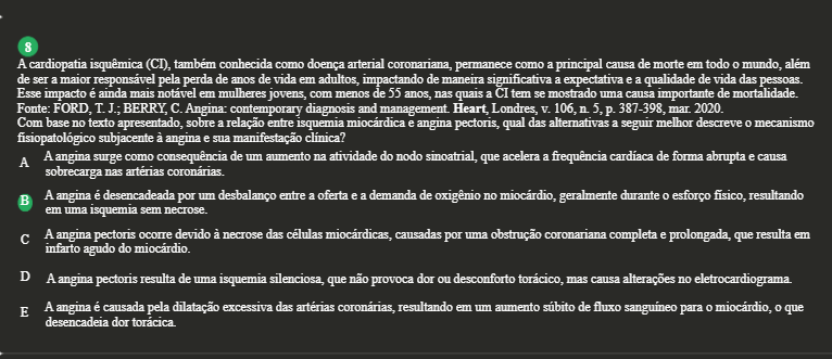8 A cardiopatia isquêmica (CI), também conhecida como doença arterial coronariana, permanece como a principal causa de morte em todo 0 mundo, alem de ser a maior responsável pela perda de anos de vida em adultos, impactando de maneira significativa a expectativa e a qualidade de vida das pessoas. Esse impacto é ainda mais notável em mulheres jovens, com menos de 55 anos, nas quais a CI tem se mostrado uma causa importante de mortalidade. Fonte: FORD, T. J.; BERRY, C. Angina: contemporary diagnosis and management. Heart, Londres, 106, n. 5, p. 387-398, mar. 2020. Com base no texto apresentado, sobre a relação entre isquemia e angina pectoris, qual das alternativas a seguir melhor descreve mecanismo fisiopatológico subjacente à angina e sua manifestação A A angina surge como consequência de um aumento na atividade do nodo sinoatrial, que acelera a frequência cardiaca de forma abrupta e causa sobrecarga nas artérias A angina é desencadeada por um desbalanço entre a oferta e a demanda de no miocárdio, geralmente durante esforço resultando em uma isquemia sem necrose. C A angina pectoris ocorre devido à necrose das miocárdicas, causadas por uma obstrução coronariana completa e prolongada, que resulta em infarto agudo do D A angina pectoris resulta de uma isquemia silenciosa, que não provoca dor ou desconforto torácico, mas causa alterações no E A angina é causada pela dilatação excessiva das artérias coronárias, resultando em um aumento súbito de fluxo sanguíneo para 0 miocárdio, 0 que desencadeia dor