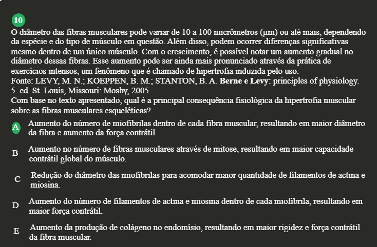 10 diâmetro das fibras musculares pode variar de 10 a 100 micrômetros (µm) ou até mais, dependendo da espécie e do tipo de músculo em questão. Além disso, podem ocorrer diferenças significativas mesmo dentro de um único músculo. Com crescimento, é possível notar um aumento gradual no diâmetro dessas fibras. Esse aumento pode ser ainda mais pronunciado através da prática de exercícios intensos, um fenômeno que é chamado de hipertrofia induzida pelo uso. Fonte: LEVY, M. N.; KOEPPEN, B. M.; STANTON, B.A. Berne e Levy: principles of physiology. 5. ed. St. Louis, Missouri: Mosby, 2005. Com base no texto apresentado, qual é a principal consequência fisiológica da hipertrofia muscular sobre as fibras musculares esqueléticas? A Aumento do número de miofibrilas dentro de cada fibra muscular, resultando em maior diâmetro da fibra e aumento da força contrátil. B Aumento no número de fibras musculares através de mitose, resultando em maior capacidade global do músculo. C Redução do diâmetro das miofibrilas para acomodar maior quantidade de filamentos de actina e D Aumento do número de filamentos de actina e miosina dentro de cada miofibrila, resultando em maior força E Aumento da produção de colágeno no endomísio, resultando em maior rigidez e força contrátil da fibra muscular