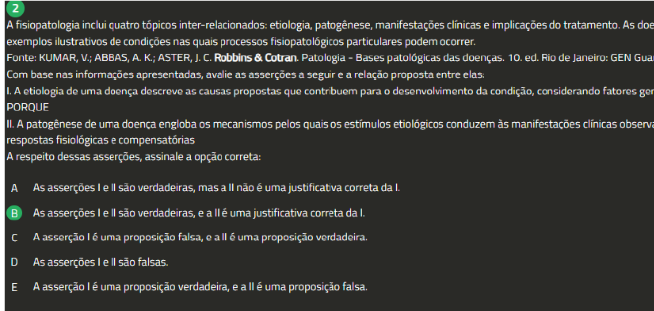 2 A fisiopatologia inclui quatro inter-relacionados: etiologia, patogênese, manifestações e implicações do As doe exemplos ilustrativos de condições nas quais processos fisiopatológicos particulares podem ocorrer. Fonte: KUMAR, V.; ABBAS, A. ASTER, J.C. Robbins & Patologia Bases patológicas das doenças. 10. ed. Rio de Janeiro: GEN Com base nas informações apresentadas, avalie as asserções a seguir e a relação proposta entre A etiologia de uma doença descreve as causas propostas que contribuem para desenvolvimento da condição, considerando fatores ger PORQUE II. A patogenese de uma doença engloba 05 mecanismos pelos quais 05 estimulos etiológicos conduzem às manifestações clínicas respostas fisiológicas e A respeito dessas asserções, assinale a opção correta: A As asserções I e são verdadeiras, mas a II não é uma justificativa correta da B As asserções I e são verdadeiras, e a uma justificativa correta da C A asserção 16 uma proposição falsa, 0 a II 6 uma proposição verdadeira. D As asserções I e são falsas. E A asserção uma proposição verdadeira, e a II uma proposição falsa.