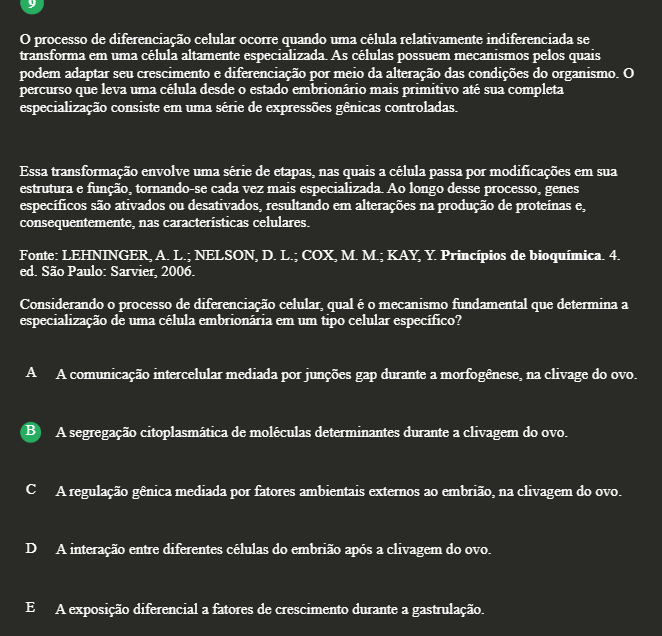 y o processo de diferenciação celular ocorre quando uma célula relativamente indiferenciada se transforma em uma célula altamente especializada. As células possuem mecanismos pelos quais podem adaptar seu crescimento e diferenciação por meio da alteração das condições do organismo. percurso que leva uma célula desde 0 estado mais primitivo até sua completa especialização consiste em uma série de expressões controladas. Essa transformação envolve uma de etapas, nas quais a célula passa por modificações em sua estrutura e função, tornando-se cada vez mais especializada. Ao longo desse processo, genes específicos são ativados ou desativados, resultando em alterações na produção de proteínas e, consequentemente, nas celulares. Fonte: A. L.; NELSON, D. L.; COX, M. M.; KAY, Y. Princípios de bioquímica. 4. ed. São Paulo: Sarvier, 2006. Considerando 0 processo de diferenciação celular, qual é mecanismo fundamental que determina a especialização de uma célula embrionária em um tipo celular específico? A A comunicação intercelular mediada por junções gap durante a morfogênese, na clivage do ovo. B A segregação citoplasmática de moléculas determinantes durante a clivagem do ovo. C A regulação gênica mediada por fatores ambientais externos ao embrião, na clivagem do ovo. D A interação entre diferentes do embrião após a clivagem do ovo. E A exposição diferencial a fatores de crescimento durante a gastrulação.