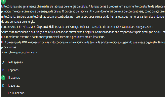 4 Mitocondrias são geralmente chamadas de fábricas de energia da A função delas é produzir um suprimento constante de adenosir principal molécula carreadora de energia da célula. 0 processo de fabricar ATP usando energia química de como 05 açúcares Embora as mitocôndrias sejam encontradas na maioria dos tipos celulares de humanos, seus variam dependendo de sua demanda de energia. Fonte: HALL, J. E.; HALL, M.E. Guyton & Tratado de Fisiologia Médica. 14. ed. Rio de Janeiro: GEN Guanabara Koogan, 2021. Sobre as e sua função na célula, analise as afirmativas a As são responsáveis pela produção de ATP at II. A membrana externa bastante impermeável, mesmo a pequenas moléculas e ions. III. A presença de DNA e ribossomos nas e uma evidência da teoria da endossimbiose, sugerindo que essas organelas têm 0 procariontes. É correto 0 que se afirma em: A e II, apenas. B apenas. C III, apenas. D II, apenas. E II e III, apenas.