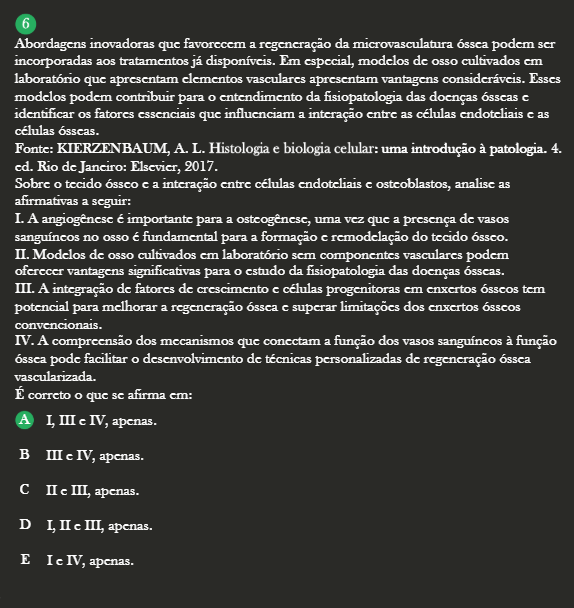 6 Abordagens inovadoras que favorecem a regeneração da microvasculatura podem ser incorporadas aos tratamentos já disponíveis. Em especial, modelos de cultivados laboratório que apresentam elementos vasculares apresentam vantagens consideráveis. Esses modelos podem contribuir para entendimento da fisiopatologia das doenças identificar os fatores essenciais que influenciam a interação entre as endoteliais c as Fonte: KIERZENBAUM, A. L. Histologia e biologia celular: uma introdução à patologia. 4. ed. Rio de Janciro: Elsevier, 2017. Sobre tecido a interação entre células endoteliais c analise as afirmativas a seguir: I.A é importante para a uma vez que a presença de vasos sanguíncos no osso é fundamental para a formação c remodelação do tecido II. Modelos de cultivados laboratório sem componentes vasculares podem oferecer vantagens significativas para estudo da fisiopatologia das doenças III. A integração de fatores de crescimento c células progenitoras em enxertos tem potencial para melhorar a regeneração superar limitações dos enxertos convencionais. IV. A compreensão dos mecanismos que conectam a função dos vasos sanguíncos à função pode facilitar desenvolvimento de personalizadas de regeneração vascularizada. É correto O que afirma A I, apenas. B IV, apenas. C II III, apenas. D apenas. E IV, apenas.