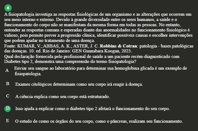6 A fisiopatologia investiga as respostas fisiológicas de um organismo e as alterações que ocorrem em seu meio interno e externo. Devido à grande diversidade entre os seres humanos, a saúde e 0 funcionamento do corpo não se manifestam da mesma forma em todas as pessoas. No entanto, entender as respostas comuns e esperadas diante das anormalidades no funcionamento é valioso, pois permite prever a progressão identificar possíveis causas e escolher intervenções que podem ajudar no tratamento de uma doença. Fonte: KUMAR, V.; ABBAS, A. K.; ASTER, J. C. Robbins & Cotran: patologia bases patológicas das doenças. 10. ed. Rio de Janeiro: GEN Guanabara Koogan, 2023. Qual declaração fornecida pelo profissional de saúde a um paciente recém-diagnosticado com Diabetes tipo 2, demonstra uma compreensão do termo fisiopatologia? A Enviar seu sangue ao para determinar sua hemoglobina glicada é um exemplo de B Exames citológicos determinam como seu corpo irá reagir à doença. C A ciencia explica como seu corpo estruturado. D Isso ajuda a explicar como 0 diabetes tipo 2 0 funcionamento do seu corpo. E estudo de como os do seu corpo, como 0 pâncreas, realizam seu funcionamento.
