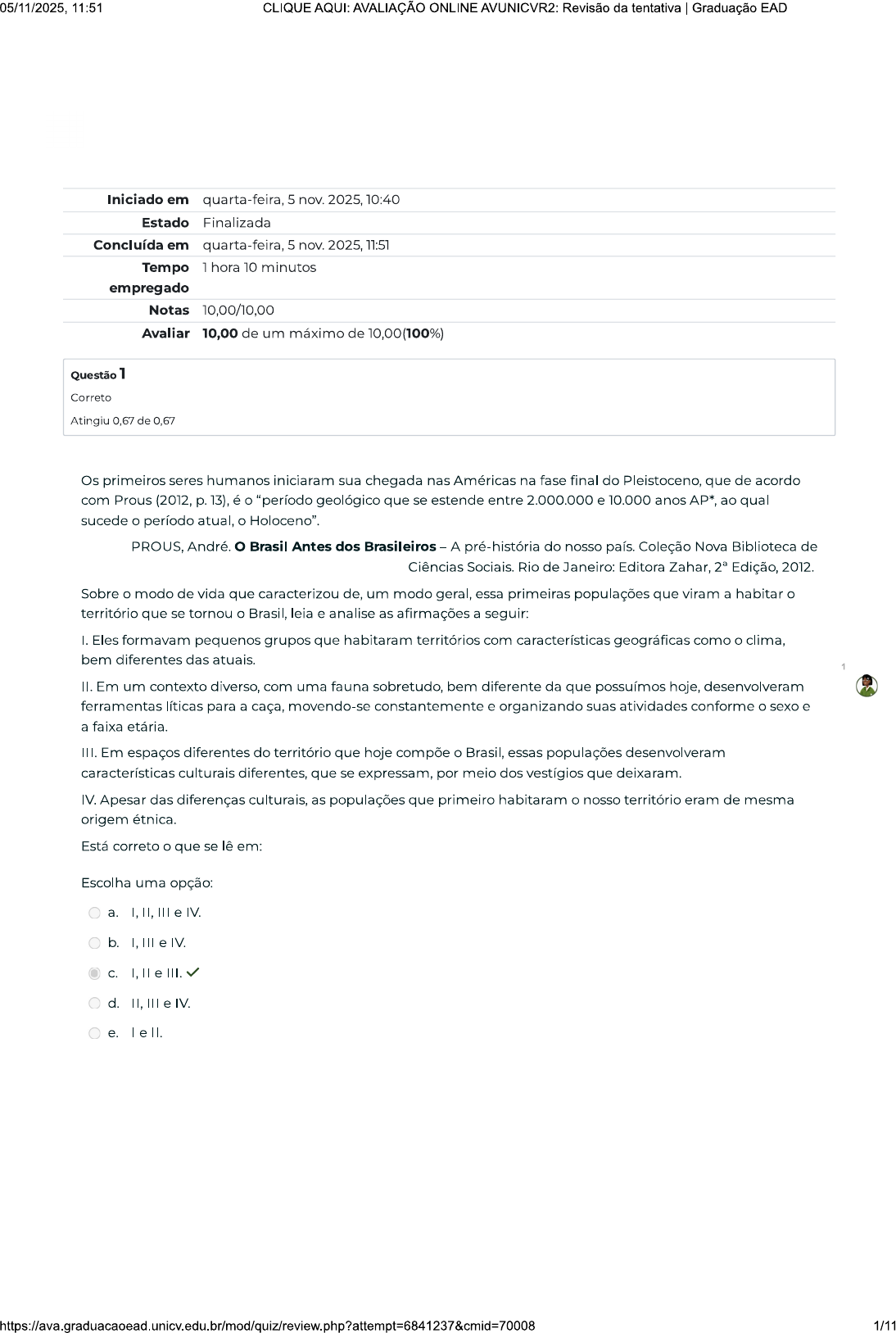 05/11/2025, 11:51 CLIQUE AQUI: AVALIAÇÃO ONLINE AVUNICVR2: Revisão da tentativa Graduação EAD Iniciado em quarta-feira, 5 nov. 2025, 10:40 Estado Finalizada Concluída em quarta-feira, 5 nov. 2025, 11:51 Tempo 1 hora 10 minutos empregado Notas 10,00/10,00 Avaliar 10,00 de um máximo de 10,00(100%) Questão 1 Correto Atingiu 0,67 de 0,67 Os primeiros seres humanos iniciaram sua chegada nas Américas na fase final do Pleistoceno, que de acordo com Prous (2012, p. 13), é "período geológico que se estende entre 2.000.000 e 10.000 anos AP*, ao qual sucede período atual, Holoceno". PROUS, André. Brasil Antes dos Brasileiros A pré-história do nosso país. Coleção Nova Biblioteca de Ciências Sociais. Rio de Janeiro: Editora Zahar, Edição, 2012. Sobre o modo de vida que caracterizou de, um modo geral, essa primeiras populações que viram a habitar o território que se tornou Brasil, leia e analise as afirmações a seguir: I. Eles formavam pequenos grupos que habitaram territórios com características geográficas como o clima, bem diferentes das atuais. II. Em um contexto diverso, com uma fauna sobretudo, bem diferente da que possuímos hoje, desenvolveram ferramentas líticas para a caça, movendo-se constantemente e organizando suas atividades conforme sexo e a faixa etária. III. Em espaços diferentes do território que hoje compõe Brasil, essas populações desenvolveram características culturais diferentes, que se expressam, por meio dos vestígios que deixaram. IV. Apesar das diferenças culturais, as populações que primeiro habitaram nosso território eram de mesma origem étnica. Está correto que se lê em: Escolha uma opção: a. I, II, III e IV. b. I, III e IV. C. I, e III. d. II, III e IV. e. le II. 1/1105/11/2025, 11:51 CLIQUE AQUI: AVALIAÇÃO ONLINE AVUNICVR2: Revisão da tentativa Graduação EAD Questão 2 Correto Atingiu 0,68 de 0,68 A princípio, os portugueses se aproximaram dos indígenas por meio do escambo, "trocando mercadorias e quinquilharias por uma madeira corante valorizada na Europa, pau-brasil", a partir de 1530, chegariam novos capitães donatários e procurariam iniciar uma colonização mais efetiva do território americano que estavam dispostos a conquistar e onde, aos poucos se procurou utilizar índio antes aliado, agora como mão de obra "nas construções dos prédios, igrejas e vilas, assim como nos engenhos de açúcar (FREIRE; OLIVEIRA; 2006, p. 38-39). FREIRE, Carlos Augusto da Rocha; OLIVEIRA, João Pacheco de. A presença indígena na formação do Brasil. Brasília: Ministério da Educação, Laced/Museu Nacional, 2006. Sobre as relações que se deram entre indígenas e portugueses a partir de uma colonização sistematizada dos territórios por aqui, leia e analise as afirmações a seguir: I. Os choques das diferenças de concepções econômicas e sociais que indígenas e portugueses queriam imprimir no mundo que cercava, se intensificaram com a colonização. II. Conforme portugueses avançavam sobre territórios indígenas, esses eram exterminados por meio de guerras, ou então fugiam para interior do território, pois não conseguiam fazer uma frente que conseguisse barrar processo colonizador. III. Embora muitos desses povos nativos fossem rivais, isso não significa que eles não tenham realizado em determinados momentos alianças sólidas para se unir contra inimigo português. IV. As resistências indígenas à colonização existiram e foram complexas, porque envolveram várias articulações entre diversas populações. Está correto que se lê em: Escolha uma opção: a. le II. b. I, II, III e IV. C. I, e IV. d. e III. e. I, e III. 2/1105/11/2025, 11:51 CLIQUE AQUI: AVALIAÇÃO ONLINE AVUNICVR2: Revisão da tentativa Graduação EAD Questão 3 Correto Atingiu 0,67 de 0,67 De acordo com José R. Macedo (2014), a África é a porção mais antiga de terra do planeta, cuja formação geológica remonta a 3,6 bilhões e 300 milhões de anos. MACEDO, José Rivair. História da África. São Paulo: Editora Contexto, 2014. Nesse sentido, leia e analise as afirmações abaixo: A antiguidade do continente africano lhe proporcionou primeiro as condições necessárias para início da vida ali. II. Embora um espaço grandioso, a África constitui um ambiente com pouca variedade de clima e vegetação. III. Ao longo da extensão do continente africano, encontramos ambientes diversificados. IV. África é dividida em cinco macro-regiões: África do Norte ou Setentrional, África do Sul ou Meridional, África Ocidental, África Oriental e África Central. Está correto que se lê em: Escolha uma opção: a. I, II, III e IV. b. e II. I, III e IV. d. e III. e. II, III e IV. Questão 4 Correto Atingiu 0,67 de 0,67 A África é berço da humanidade, pois: "Desde mais remoto ancestral do gênero Homo, toda a aventura humana se confunde com a África. Apenas ali se pode acompanhar processo completo de transformação dos primatas em homens". MACEDO, José Rivair. História da África. São Paulo: Editora Contexto, 2014, p. 15. Desse modo, podemos concluir que no continente africano: Escolha uma opção: a. Surgiu Australopithecus, primeiro ancestral do gênero humano e por isso, ali é considerado local primordial da espécie humana, que teve a continuidade do seu processo evolutivo nos demais continentes para onde esses primeiros hominídeos migraram. b. Surgiram alguns dos primeiros hominídeos, sendo que finalizar da evolução dessas espécies se deu fora do continente africano. C. Surgiram as primeiras espécies de hominídeo e também do homem moderno, sendo a África espaço onde se deu processo evolutivo de diferentes espécies humanas até homem moderno. d. Foi espaço de onde migraram as primeiras espécies de hominídeos, que em outras partes do planeta seguiram seu processo evolutivo até a espécie mais atual do ser humano. e. Foi espaço para onde migraram as primeiras espécies de hominídeos, vindas de outras partes