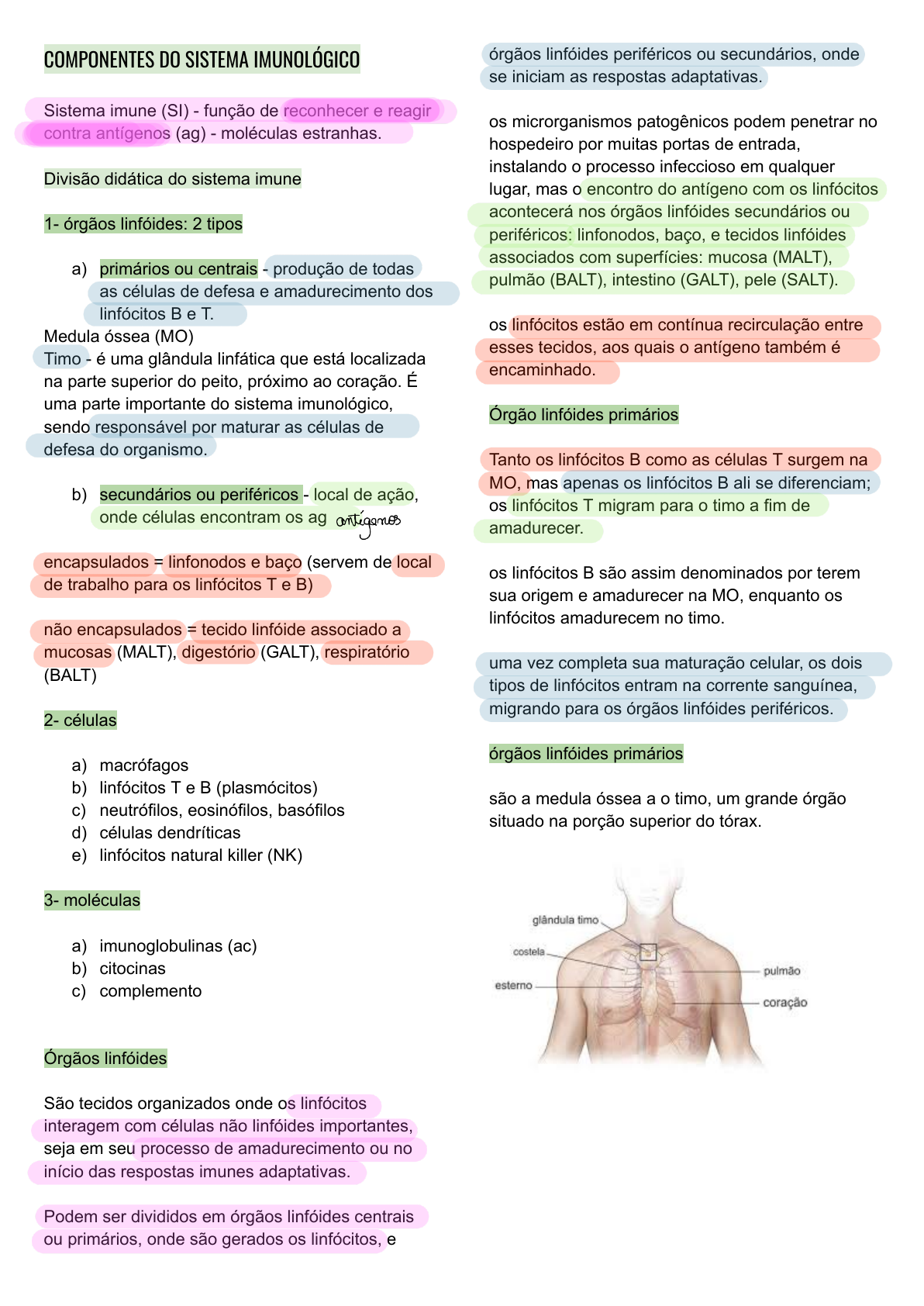 COMPONENTES DO SISTEMA IMUNOLÓGICO Sistema imune (SI) - função de reconhecer e reagir contra antígenos (ag) - moléculas estranhas. Divisão didática do sistema imune 1- órgãos linfóides: 2 tipos a) primários ou centrais - produção de todas as células de defesa e amadurecimento dos linfócitos B e T. Medula óssea (MO) Timo - é uma glândula linfática que está localizada na parte superior do peito, próximo ao coração. É uma parte importante do sistema imunológico, sendo responsável por maturar as células de defesa do organismo. b) secundários ou periféricos - local de ação, onde células encontram os ag encapsulados = linfonodos e baço (servem de local de trabalho para os linfócitos T e B) não encapsulados = tecido linfóide associado a mucosas (MALT), digestório (GALT), respiratório (BALT) 2- células a) macrófagos b) linfócitos T e B (plasmócitos) c) neutrófilos, eosinófilos, basófilos d) células dendríticas e) linfócitos natural killer (NK) 3- moléculas a) imunoglobulinas (ac) b) citocinas c) complemento Órgãos linfóides São tecidos organizados onde os linfócitos interagem com células não linfóides importantes, seja em seu processo de amadurecimento ou no início das respostas imunes adaptativas. Podem ser divididos em órgãos linfóides centrais ou primários, onde são gerados os linfócitos, e órgãos linfóides periféricos ou secundários, onde se iniciam as respostas adaptativas. os microrganismos patogênicos podem penetrar no hospedeiro por muitas portas de entrada, instalando o processo infeccioso em qualquer lugar, mas o encontro do antígeno com os linfócitos acontecerá nos órgãos linfóides secundários ou periféricos: linfonodos, baço, e tecidos linfóides associados com superfícies: mucosa (MALT), pulmão (BALT), intestino (GALT), pele (SALT). os linfócitos estão em contínua recirculação entre esses tecidos, aos quais o antígeno também é encaminhado. Órgão linfóides primários Tanto os linfócitos B como as células T surgem na MO, mas apenas os linfócitos B ali se diferenciam; os linfócitos T migram para o timo a fim de amadurecer. os linfócitos B são assim denominados por terem sua origem e amadurecer na MO, enquanto os linfócitos amadurecem no timo. uma vez completa sua maturação celular, os dois tipos de linfócitos entram na corrente sanguínea, migrando para os órgãos linfóides periféricos. órgãos linfóides primários são a medula óssea a o timo, um grande órgão situado na porção superior do tórax. Elementos figurados do sangue As células constituem o sistema imunológico se originam na MO, onde algumas também amadurecem. a partir da MO, elas migram em função do patrulhamento dos tecidos, circulando no sangue e num sistema especializado de vasos, chamado sistema linfático. todos os elementos celulares do sangue, como as células vermelhas que transportam o O2, as plaquetas que deflagram a coagulação sanguínea nos tecidos lesados e as células brancas do sistema imune, derivam das mesmas células. - as células-tronco hematopoiéticas pluripotentes, ao se diferenciarem, originam células-tronco com potencial mais limitado. - estas novas células-tronco são as progenitoras imediatas dos eritrócitos, das plaquetas e das duas principais categorias de células brancas. - é nestas duas categorias que se encontram os personagens principais do nosso estudo, sendo derivados dos progenitores linfóide e mielóide. - o progenitor linfóide origina os linfócitos, nos quais se detém a maior parte do estudo da resposta imune - o progenitor mielóide é o precursor dos granulócitos, macrófagos e mastócitos do sistema imune. Células do sistema imunológico os macrófagos, em particular, constituem um dois tipos de fagócitos do sistema imune, distribuindo-se amplamente nos tecidos, onde passam a desempenhar um papel crítico na imunidade inata. -células de kupfer, histiócitos, monócitos, células da microglia, mos alveolares as células dendríticas são as principais células apresentadoras de antígeno (APCs), também podem ser encontradas em uma forma imatura no sangue e apresentam nomenclaturas diversas, como células de langerhans (pele). os mastócitos, cujo precursor circulante ainda não está nem definido, também se diferencia ao chegar nos tecidos, se localizam principalmente junto aos pequenos vasos sanguíneos e liberam substâncias que afetam a permeabilidade, caso sejam ativados. os granulócitos recebem essa denominação por possuírem grânulos densamente coráveis em seu citoplasma, sendo algumas vezes referidos como leucócitos polimorfonucleares, devido as formas de seus núcleos. há três tipos de granulócitos, todos com uma duração relativamente curta e produzidos em grande número durante as respostas imunes, quando abandonam a circulação para os locais de infecção ou inflamação. os neutrófilos, que representam a outra célula fagocitária do sistema imunológico, são as mais numerosas células da resposta imune inata. os eosinófilos são importantes principalmente na resposta a infecções por parasitas. a função dos basófilos provavelmente é similiar ou complementar a dos eosinófilos e mastócitos. há 2 tipos principais de linfócitos: linfócitos B ou células B, que, quando ativados, diferenciam-se em plasmócitos e linfócitos T e células T, das quais se reconhecem duas classes principais. a maioria dos linfócitos é formada por células pequenas, com muito de sua cromatina nuclear em estado condensado e poucas organelas citoplasmáticas. tanto os linfócitos T como as células B possuem diferentes tipos de receptores em sua superfície, que lhes permite reconhecer um antígeno. cada linfócito reconhece um antígeno diferente, em conjunto, todos os receptores dos diferentes linfócitos são capazes de reconhecer uma ampla gama de antígenos. o receptor de antígeno da célula B (BCR) é uma forma especial do anticorpo, lig