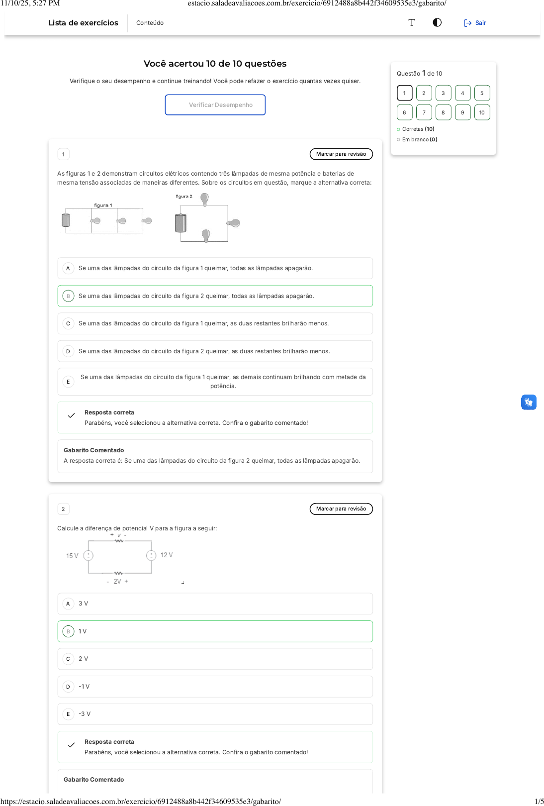Você acertou 10 de 10 questões Verifique o seu desempenho e continue treinando! Você pode refazer o exercício quantas vezes quiser. Verificar Desempenho A B C D E A B C D E 1 Marcar para revisão As figuras 1 e 2 demonstram circuitos elétricos contendo três lâmpadas de mesma potência e baterias de mesma tensão associadas de maneiras diferentes. Sobre os circuitos em questão, marque a alternativa correta: Se uma das lâmpadas do circuito da figura 1 queimar, todas as lâmpadas apagarão. Se uma das lâmpadas do circuito da figura 2 queimar, todas as lâmpadas apagarão. Se uma das lâmpadas do circuito da figura 1 queimar, as duas restantes brilharão menos. Se uma das lâmpadas do circuito da figura 2 queimar, as duas restantes brilharão menos. Se uma das lâmpadas do circuito da figura 1 queimar, as demais continuam brilhando com metade da potência. Resposta correta Parabéns, você selecionou a alternativa correta. Confira o gabarito comentado! Gabarito Comentado A resposta correta é: Se uma das lâmpadas do circuito da figura 2 queimar, todas as lâmpadas apagarão. 2 Marcar para revisão Calcule a diferença de potencial V para a figura a seguir: 3 V 1 V 2 V -1 V -3 V Resposta correta Parabéns, você selecionou a alternativa correta. Confira o gabarito comentado! Gabarito Comentado Questão 1 de 10 Corretas (10) Em branco (0) 1 2 3 4 5 6 7 8 9 10 Lista de exercícios Conteúdo Sair 11/10/25, 5:27 PM estacio.saladeavaliacoes.com.br/exercicio/6912488a8b442f34609535e3/gabarito/ https://estacio.saladeavaliacoes.com.br/exercicio/6912488a8b442f34609535e3/gabarito/ 1/5 A B C D E A B C D E A resposta correta é: 1 V 3 Marcar para revisão Com relação aos teoremas de Thévenin e Norton, assinale a alternativa correta: A aplicação do teorema de Norton resulta em uma fonte de corrente em série com uma resistência. A aplicação do teorema de Thévenin resulta em uma fonte de tensão em paralelo com uma resistência. O teorema de Norton somente pode ser aplicado a circuitos indutivos. O teorema de Thévenin somente pode ser aplicado a circuitos capacitivos. Para um mesmo circuito no qual esses teoremas sejam válidos, a resistência equivalente calculada pelos teoremas de Thévenin e Norton é a mesma. Resposta correta Parabéns, você selecionou a alternativa correta. Confira o gabarito comentado! Gabarito Comentado A alternativa correta é a letra E. Os teoremas de Thévenin e Norton são métodos utilizados para simplificar circuitos complexos, transformando-os em circuitos mais simples. Ambos os teoremas são aplicáveis a qualquer tipo de circuito, seja ele resistivo, indutivo ou capacitivo. A resistência equivalente calculada por ambos os teoremas é a mesma para um mesmo circuito, pois ambos os teoremas buscam encontrar a resistência que o circuito apresenta a uma carga conectada a ele. Portanto, para um mesmo circuito no qual esses teoremas sejam válidos, a resistência equivalente calculada pelos teoremas de Thévenin e Norton é a mesma. 4 Marcar para revisão Dado o circuito a seguir, defina a equação que descreve a relação entre tensão nodal V1, fontes de tensão de 8 e 5 V e as resistências: − − + = 0 V1−8 2 V1 3 V1−5 4 − + = 0 V1−8 2 V1 3 V1−5 4 + − = 0 V1+8 2 V1 3 V1−5 4 + + = 0 −V 1−8 2 V1 3 V1−5 4 + + = 0 V 1−8 2 V1 3 V1−5 4 Resposta correta Parabéns, você selecionou a alternativa correta. Confira o gabarito comentado! Gabarito Comentado A resposta correta é: + + = 0 V 1−8 2 V1 3 V1−5 4 5 Marcar para revisão No circuito a seguir, os circuitos equivalentes de Thévenin e de Norton, do ponto de vista dos terminais A e B (considerando A em relação a B), podem ser descritos pelos parâmetros: 11/10/25, 5:27 PM estacio.saladeavaliacoes.com.br/exercicio/6912488a8b442f34609535e3/gabarito/ https://estacio.saladeavaliacoes.com.br/exercicio/6912488a8b442f34609535e3/gabarito/ 2/5 A B C D E A B C D E VTH = 40 V, RTH = RN = 100Ω, IN = 0,4 A. VTH = 60 V, RTH = RN = 100Ω, IN = 0,6 A. VTH = 120 V, RTH = RN = 100Ω, IN = 1,2 A. VTH = 120 V, RTH = RN = 240Ω, IN = 0,5 A. VTH = 120 V, RTH = RN = 240Ω, IN = 1 A. Resposta correta Parabéns, você selecionou a alternativa correta. Confira o gabarito comentado! Gabarito Comentado A resposta correta é: VTH = 40 V, RTH = RN = 100Ω, IN = 0,4 A. 6 Marcar para revisão Considerando que, no circuito precedente, todos os elementos sejam ideais e C seja o nó de referência, com tensão igual a zero, qual a tensão de Thévenin? −Va Va −Vb −Vc −Va + Vb Resposta correta Parabéns, você selecionou a alternativa correta. Confira o gabarito comentado! Gabarito Comentado A tensão de Thévenin é a tensão entre os terminais de um circuito linear de dois terminais, quando desconectado de uma carga. Neste caso, considerando que todos os elementos são ideais e que C é o nó de referência com tensão igual a zero, a tensão de Thévenin é igual a . Portanto, a alternativa correta é a letra B: . Va Va 7 Marcar para revisão O circuito da figura a seguir é formado por uma bateria ideal de tensão contínua com força eletromotriz e cinco resistores cerâmicos semelhantes: . Um amperímetro ideal é colocado na salda da fonte de tensão para medir a corrente elétrica fornecida ao circuito. A leitura do amperímetro indicou um valor de corrente elétrica igual a: ε = 12V Ri = R2 = R3 = R4 = R5 = 100Ω 11/10/25, 5:27 PM estacio.saladeavaliacoes.com.br/exercicio/6912488a8b442f34609535e3/gabarito/ https://estacio.saladeavaliacoes.com.br/exercicio/6912488a8b442f34609535e3/gabarito/ 3/5 A B C D E A B C D E 5 mA 10 mA 20 mA 45 mA 90 mA Resposta correta Parabéns, você selecionou a alternativa correta. Confira o gabarito comentado! Gabarito Comentado A resposta correta é: 45 mA 8 Marcar para revisão O teorema da superposição auxilia na resolução matemática de circuitos elétricos que possuem diversas fontes. Uma condição necessária para que esse teorema possa ser aplicado é que 