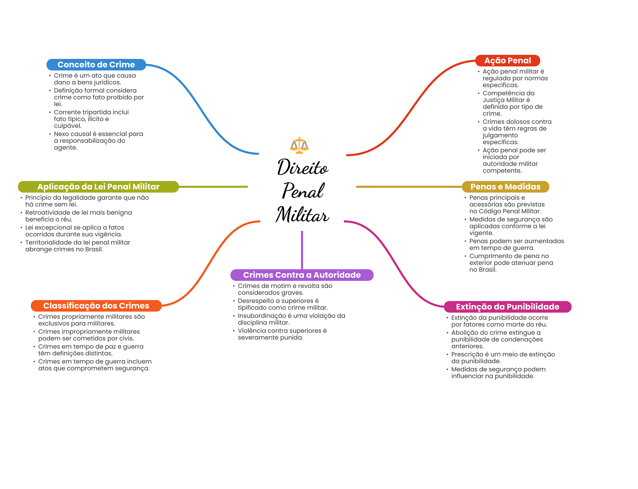 Conceito de Crime Ação Penal Ação penal militar é Crime é um ato que causa regulada por normas dano a bens jurídicos. específicas. Definição formal considera Competência da crime como fato proibido por Justiça Militar é lei. definida por tipo de Corrente tripartida inclui crime. fato típico, ilícito e Crimes dolosos contra culpável. a vida têm regras de Nexo causal é essencial para julgamento a responsabilização do específicas. agente. Ação penal pode ser iniciada por Direito autoridade militar competente. Aplicação da Lei Penal Militar Penal Penas e Medidas Princípio da legalidade garante que não Penas principais e há crime sem lei. acessórias são previstas Retroatividade de lei mais benigna beneficia O réu. Militar no Código Penal Militar. Medidas de segurança são Lei excepcional se aplica a fatos aplicadas conforme a lei ocorridos durante sua vigência. vigente. Territorialidade da lei penal militar Penas podem ser aumentadas abrange crimes no Brasil. em tempo de guerra. Cumprimento de pena no exterior pode atenuar pena no Brasil. Crimes Contra a Autoridade Crimes de motim e revolta são considerados graves. Desrespeito a superiores é Classificação dos Crimes tipificado como crime militar. Extinção da Punibilidade Crimes propriamente militares são Insubordinação é uma violação da Extinção da punibilidade ocorre exclusivos para militares. disciplina militar. por fatores como morte do réu. Crimes impropriamente militares Violência contra superiores é Abolição do crime extingue a podem ser cometidos por civis. severamente punida. de condenações Crimes em tempo de paz e guerra anteriores. têm definições distintas. Prescrição é um meio de extinção Crimes em tempo de guerra incluem da punibilidade. atos que comprometem segurança. Medidas de segurança podem influenciar na punibilidade.