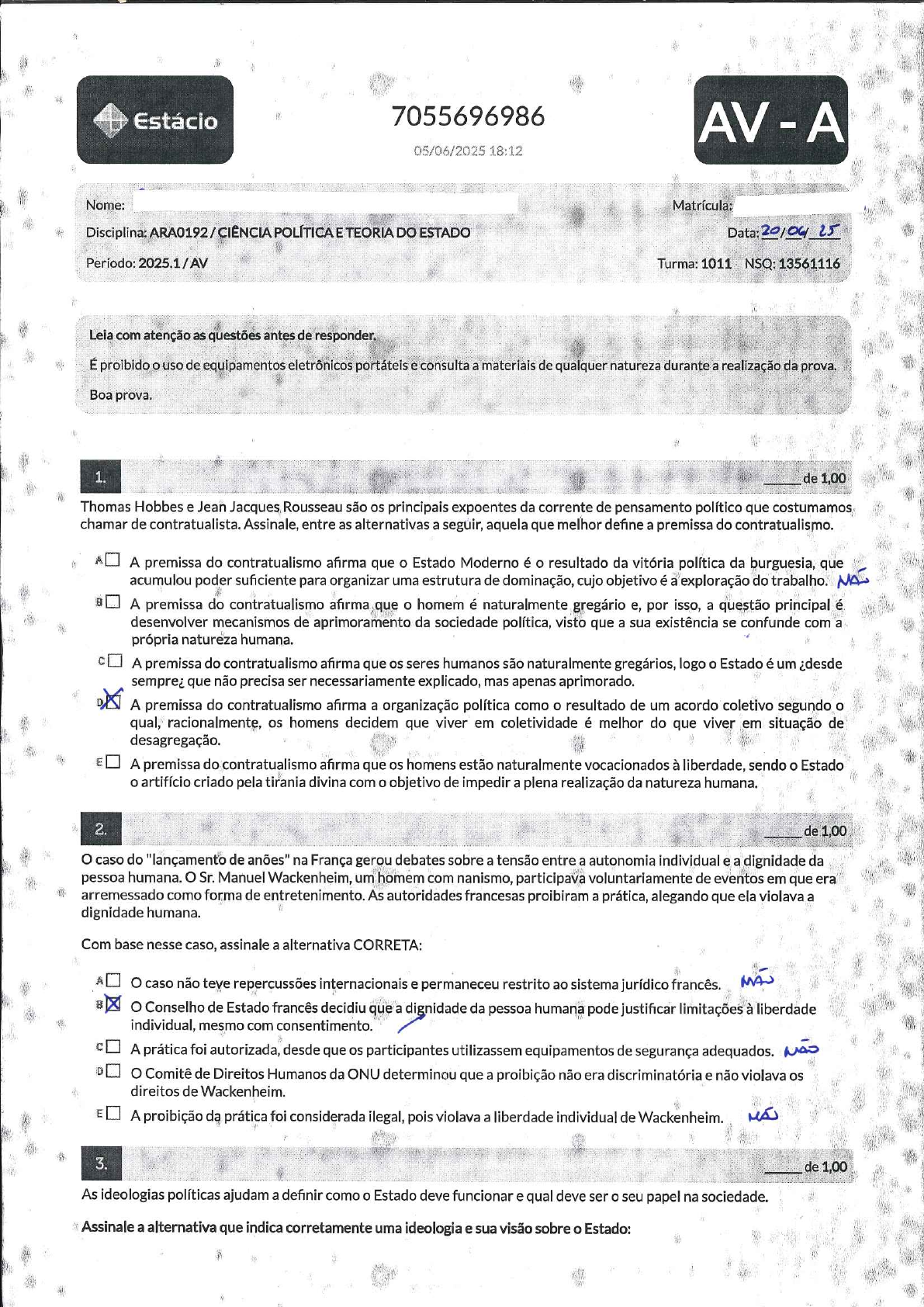 Estácio 7055696986 AV A 05/06/2025 18:12 Nome: Matrícula: Disciplina: ARA0192 / CIÊNCIA POLÍTICA E TEORIA DO ESTADO Data: 20/06/25 Período: AV Turma: 1011 NSQ: 13561116 Leia com atenção as questões antes de responder. É proibido o uso de equipamentos eletrônicos portáteis e consulta a materiais de qualquer natureza durante a realização da prova. Boa prova. 1. de 1,00 Thomas Hobbes e Jean Jacques Rousseau são principais expoentes da corrente de pensamento político que chamar de contratualista. Assinale, entre as alternativas a seguir, aquela que melhor define a premissa do contratualismo. A A premissa do contratualismo afirma que o Estado Moderno é o resultado da vitória política da burguesia, que acumulou poder suficiente para organizar uma estrutura de dominação, cujo objetivo é a exploração do trabalho. B A premissa do contratualismo afirma que o homem é naturalmente gregário e, por isso, a questão principal é desenvolver mecanismos de aprimoramento da sociedade política, visto que a sua existência se confunde com a própria natureza humana. C A premissa do contratualismo afirma que os seres humanos são naturalmente gregários, logo o Estado é um ¿desde sempre¿ que não precisa ser necessariamente explicado, mas apenas aprimorado. A premissa do contratualismo afirma a organização política como o resultado de um acordo coletivo segundo o qual, racionalmente, os homens decidem que viver em coletividade é melhor do que viver em situação de desagregação. E A premissa do contratualismo afirma que os homens estão naturalmente vocacionados à liberdade, sendo o Estado o artifício criado pela tirania divina com objetivo de impedir a plena realização da natureza humana. 2. de 1,00 caso do "lançamento de anões" na França gerou debates sobre a tensão entre a autonomia individual e a dignidade da pessoa humana. Sr. Manuel Wackenheim, um homem com nanismo, participava voluntariamente de eventos em que era arremessado como forma de entretenimento. As autoridades francesas proibiram a prática, alegando que ela violava a dignidade humana. Com base nesse caso, assinale a alternativa CORRETA: A caso não teve repercussões internacionais e permaneceu restrito ao sistema jurídico francês. MAN Conselho de Estado francês decidiu que a dignidade da pessoa humana pode justificar limitações à liberdade individual, mesmo com consentimento. A prática foi autorizada, desde que os participantes utilizassem equipamentos de segurança adequados. D Comitê de Direitos Humanos da ONU determinou que a proibição não era discriminatória e não violava direitos de Wackenheim. E A proibição da prática foi considerada ilegal, pois violava a liberdade individual de Wackenheim. 3. de 1,00 As ideologias políticas ajudam a definir como o Estado deve funcionar e qual deve ser o seu papel na sociedade. Assinale a alternativa que indica corretamente uma ideologia e sua visão sobre o Estado:A conservadorismo quer acabar com as tradições e mudar tudo rapidamente. liberalismo acredita que Estado deve controlar todas as áreas da vida das pessoas. anarquismo acredita que Estado é essencial para manter a ordem social. D socialismo defende que Estado deve controlar a economia para promover igualdade social. E neoliberalismo defende que o Estado deve ser o principal responsável por empresas públicas. 4. de 1,00 A relação entre justiça e sociedade envolve não apenas a aplicação das leis, mas também a promoção de condições humanas dignas, capazes de garantir igualdade de oportunidades e respeito aos direitos fundamentais. Nesse sentido, as decisões políticas e jurídicas devem considerar os impactos humanos das escolhas estatais, especialmente sobre populações vulneráveis. Assinale a alternativa que apresenta uma situação em que a justiça social foi NEGADA, gerando impactos humanos negativos: A A concessão de bolsas permanência para estudantes de baixa renda em universidades públicas. A remoção forçada de comunidades pobres sem garantias de reassentamento digno. C A ampliação do acesso à saúde pública em regiões de difícil acesso. D A implementação de programas de habitação popular voltados para famílias de baixa renda. E A criação de políticas públicas de cotas raciais para ingresso no ensino superior. 5. de 1,00 Acerca do contrato social enquanto tema central da teoria política clássica, assinale a alternativa INCORRETA. A contrato social estabelece leis, moral, costumes e um conjunto de instituições para que a convivência em sociedade seja mais harmônica. contratualismo é uma teoria filosófica e política que está relacionada a uma espécie de pacto entre as pessoas. A partir dessa teoria, surgiu nome contrato social. C contrato social é a grande narrativa em que se funda obrigação complexa e obrigação política moderna, uma obrigação complexa e contraditória, porque foi estabelecida entre homens livres. contratualismo moderno se apresentou ao mundo entre os séculos XIX e XX, e teoricamente se ancorou na dicotomia entre estado de natureza e estado civil, intermediada pelos direitos sociais, fundamentando, assim, o surgimento do Estado através de um contrato, artificial e consensualmente instituído pelos homens. E Existem três pensadores da era moderna conhecidos como os filósofos contratualistas Thomas Hobbes, que escreveu o livro John Locke, autor de Dois Tratados sobre Governo Jean-Jacques Rousseau, escritor do Contrato Social¿. 6. de 1,00 J.J. Rousseau define contrato social como A um contrato instituído no âmbito do direito privado, conforme o código civil, para organizar as relações em sociedade. uma livre associação do gênero humano, que decide compor uma determinada forma de sociedade política, com base na vontade geral, com vistas ao pacto social. a expressão da permanência da desigualdade formal e da injustiça entre os homens, resolvidas sem que haja necessidade da alienação de ca